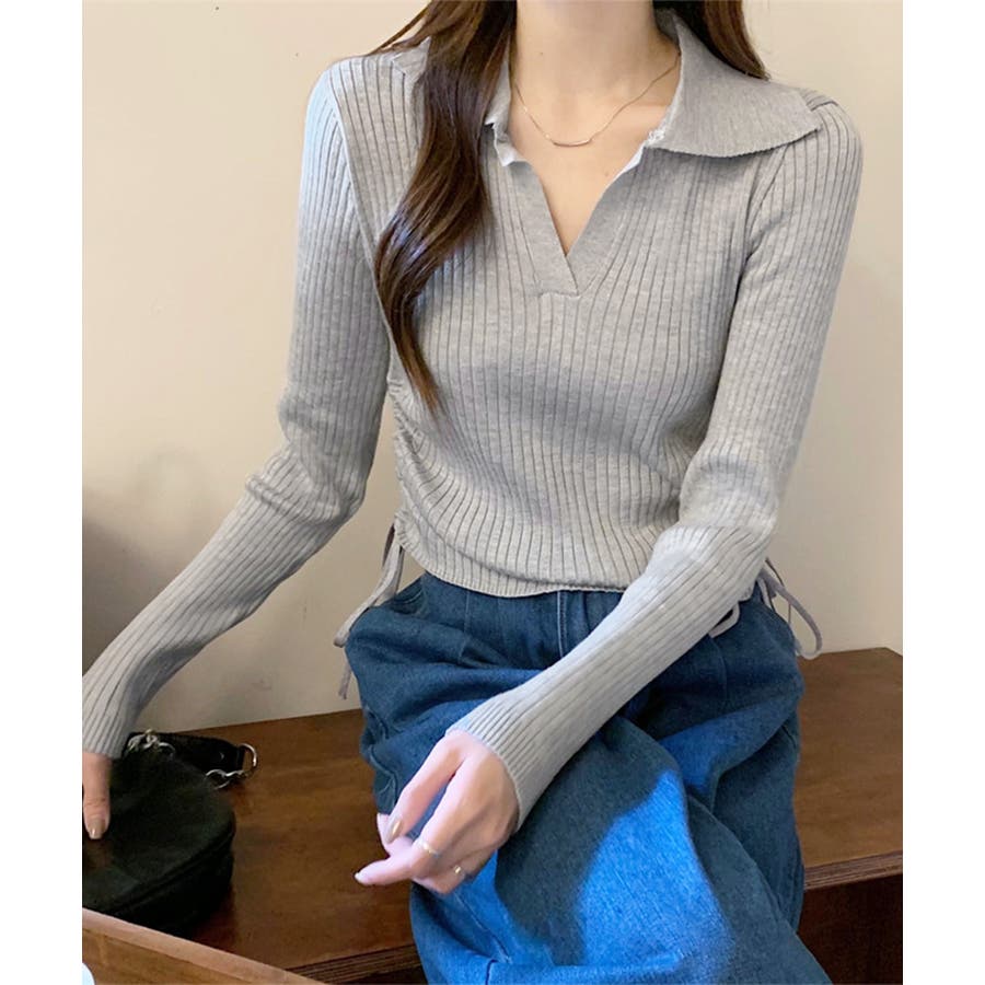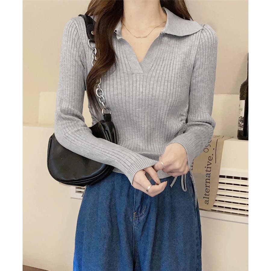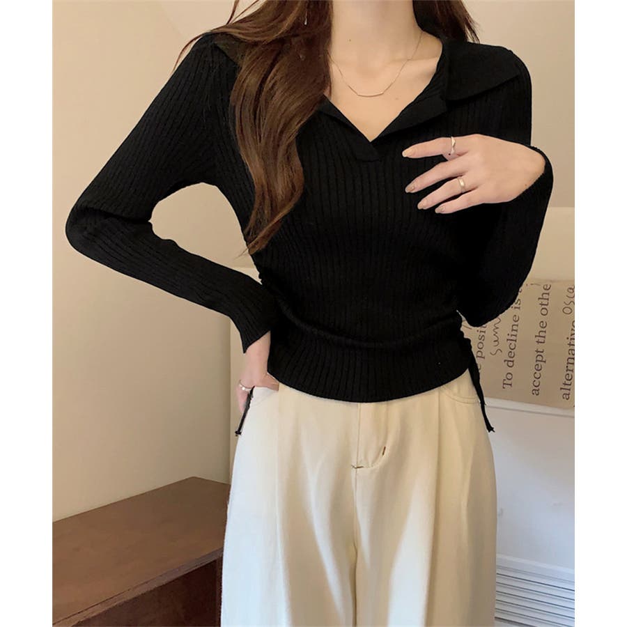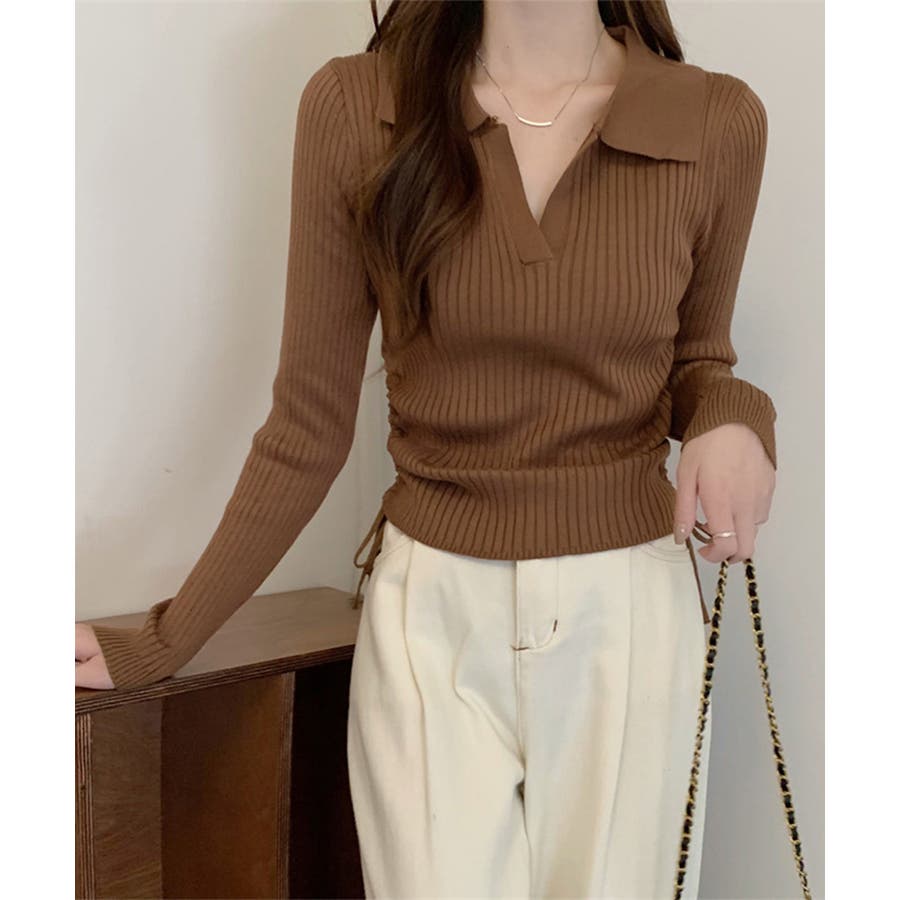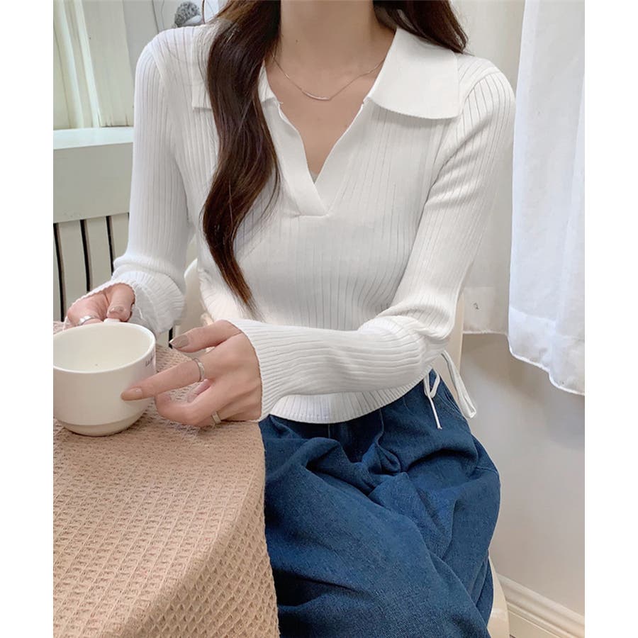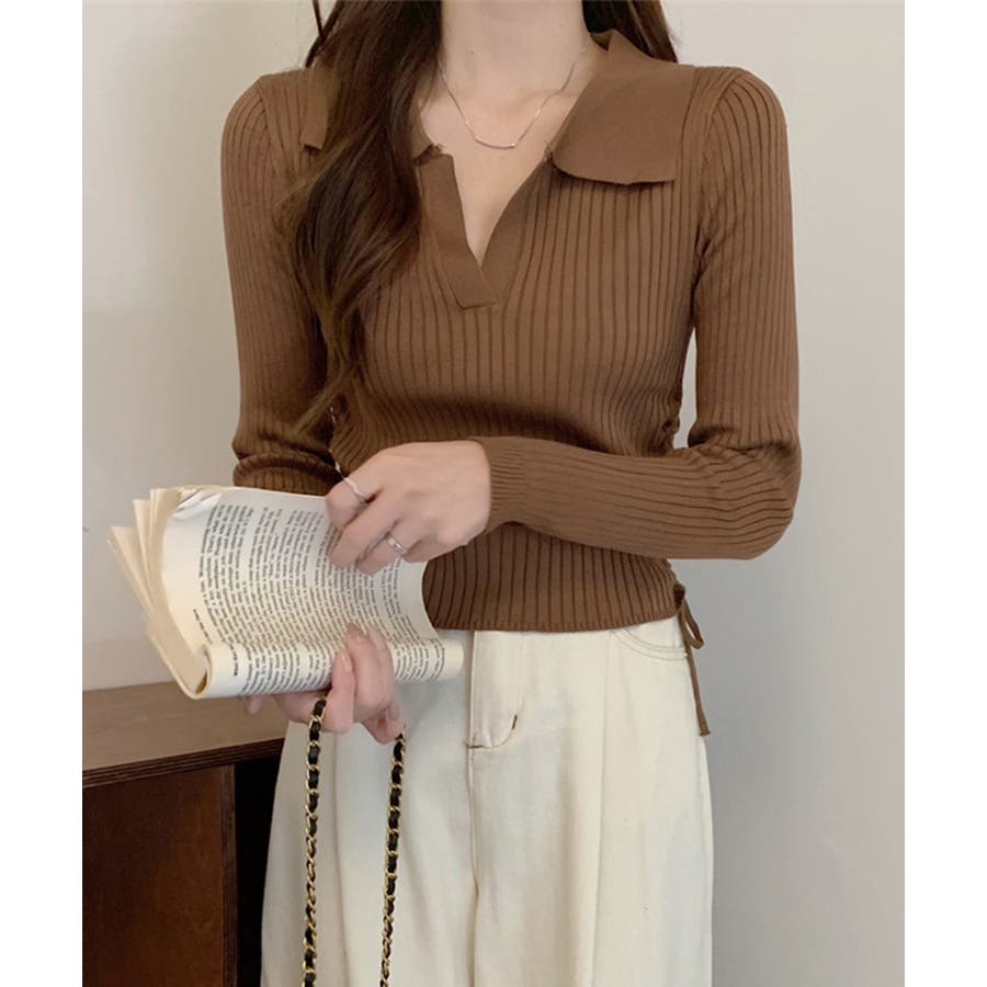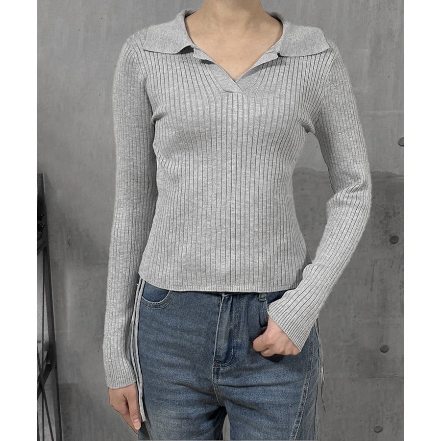 ポロ襟デザインが首まわりをすっきりと見せるリブニットトップス。