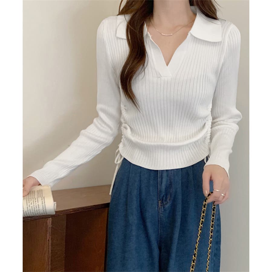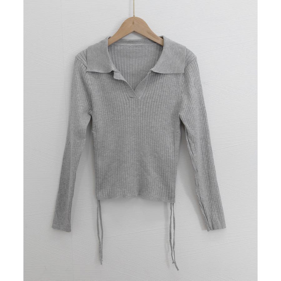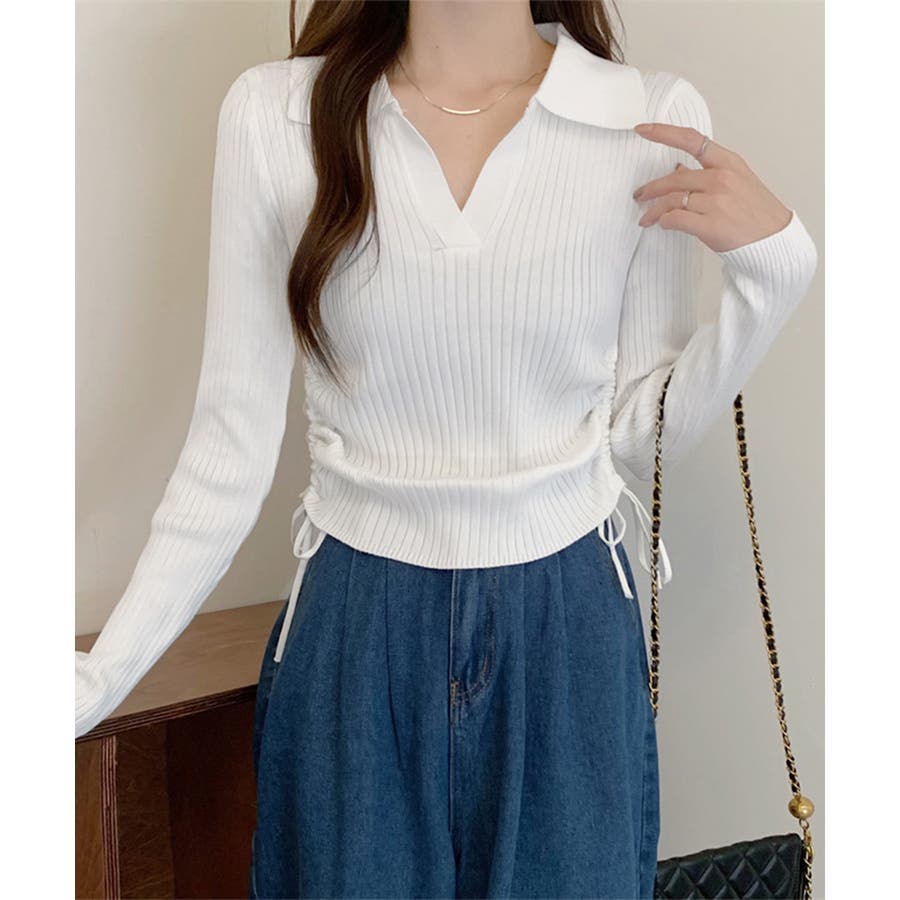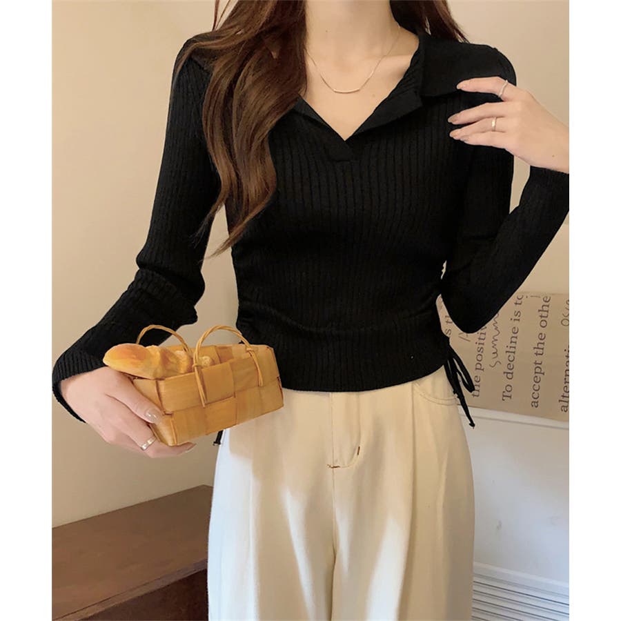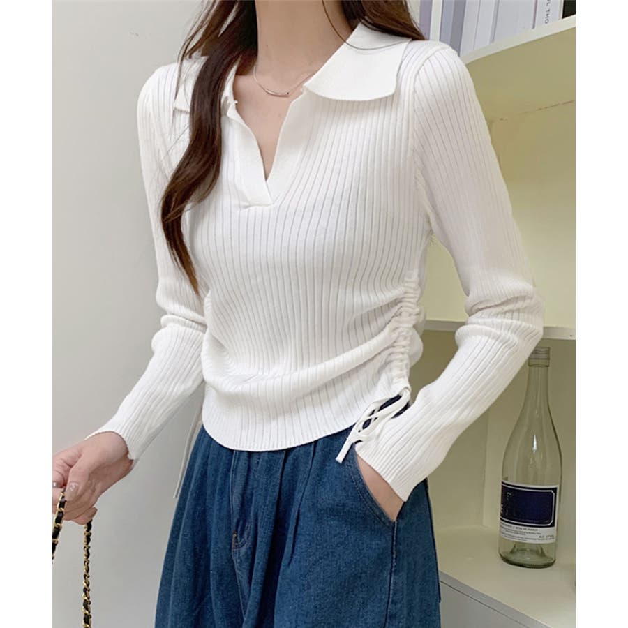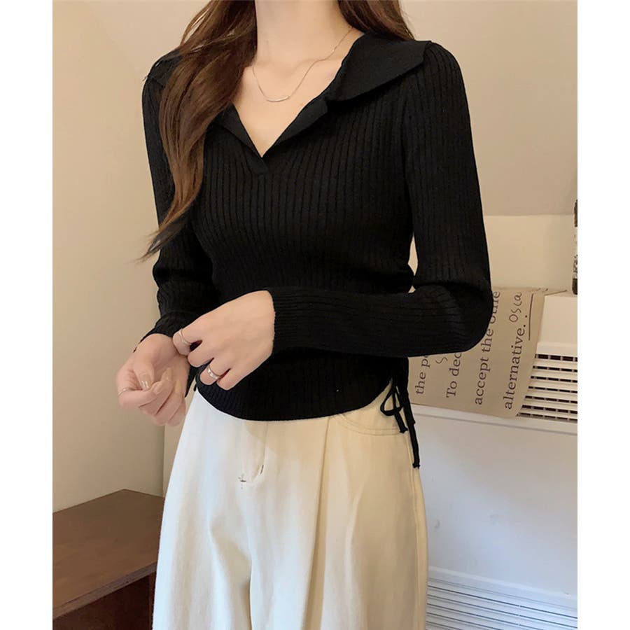 ポロ襟デザインが首まわりをすっきりと見せるリブニットトップス。