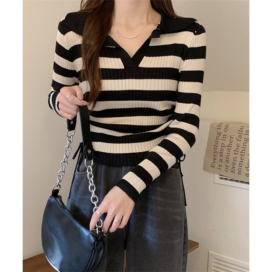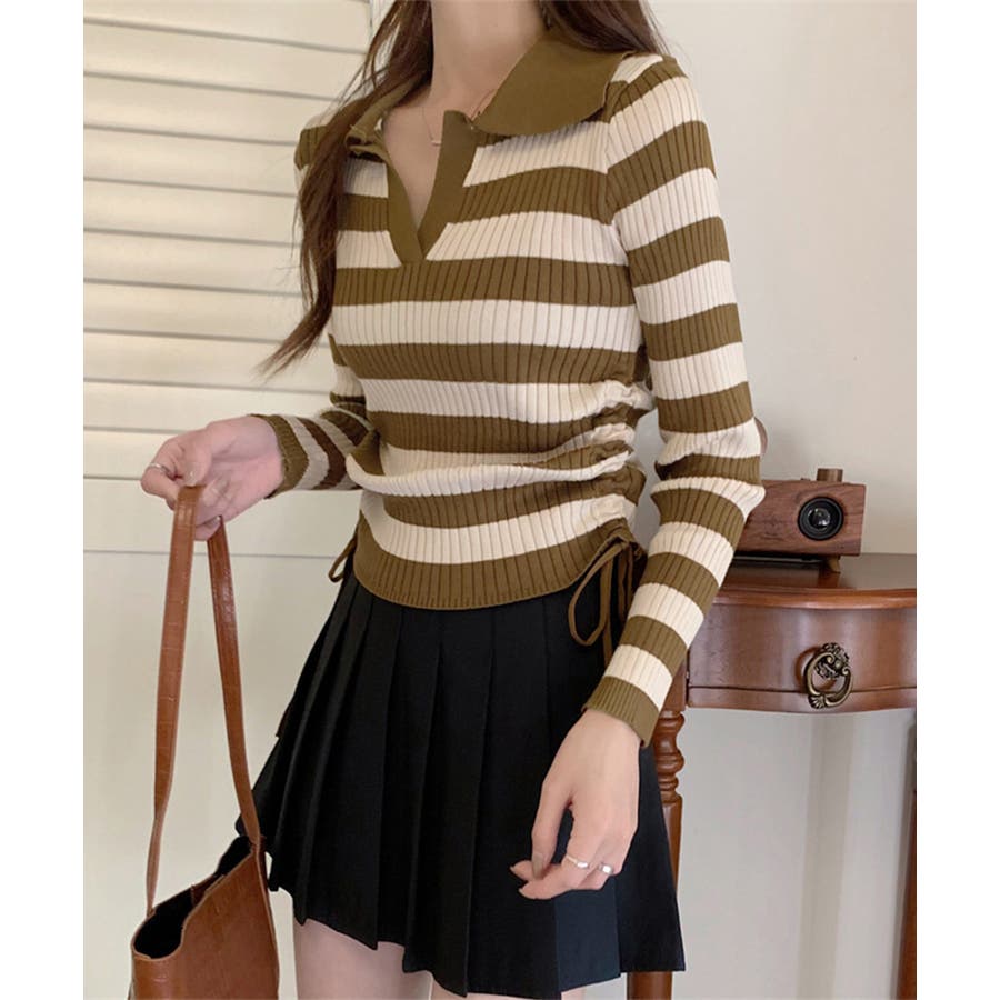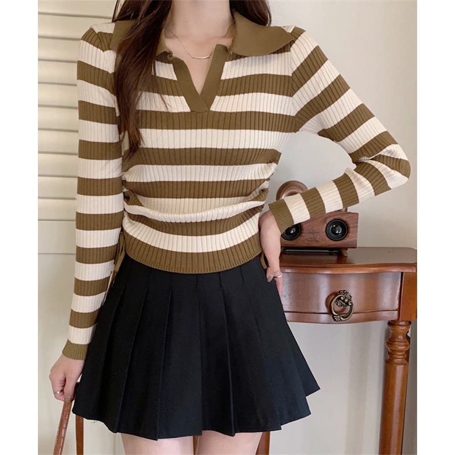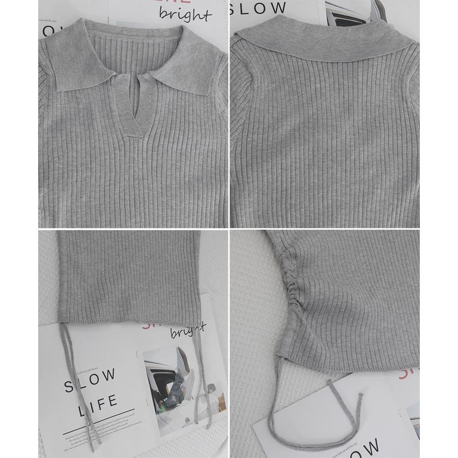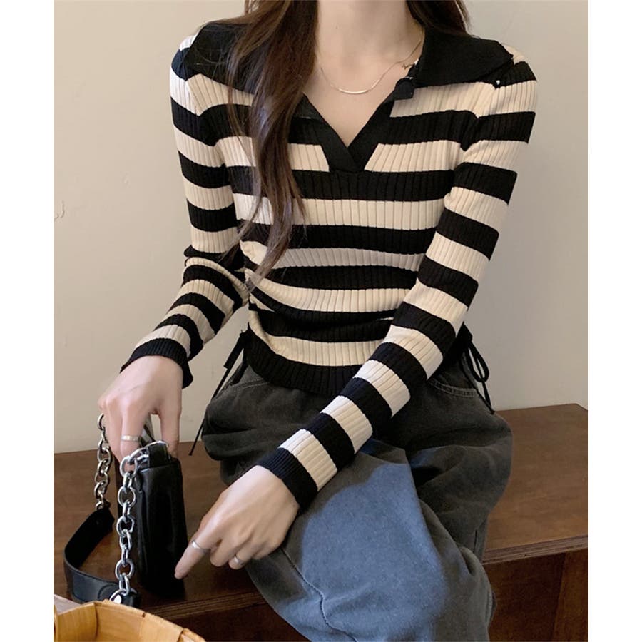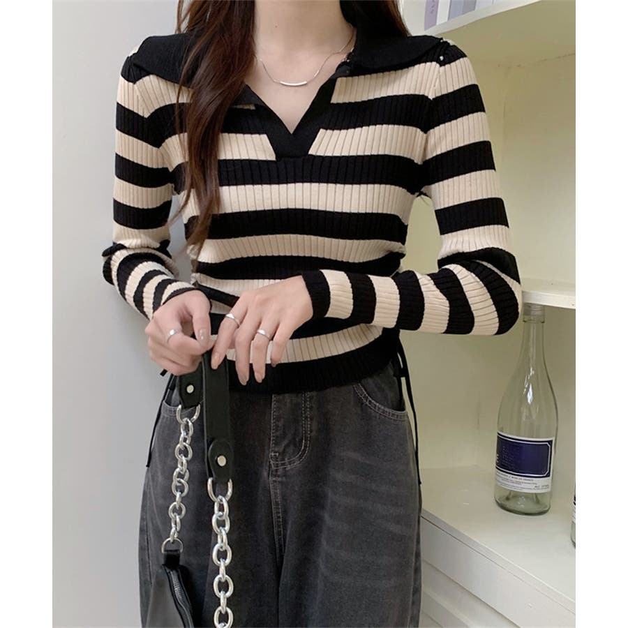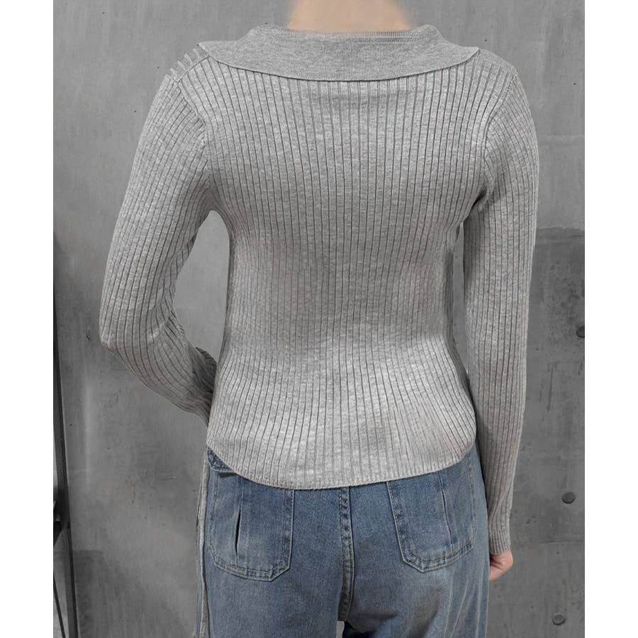 ポロ襟デザインが首まわりをすっきりと見せるリブニットトップス。