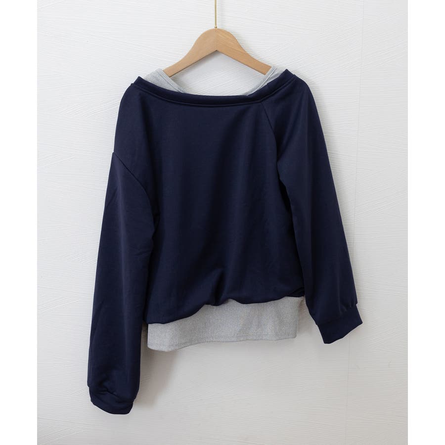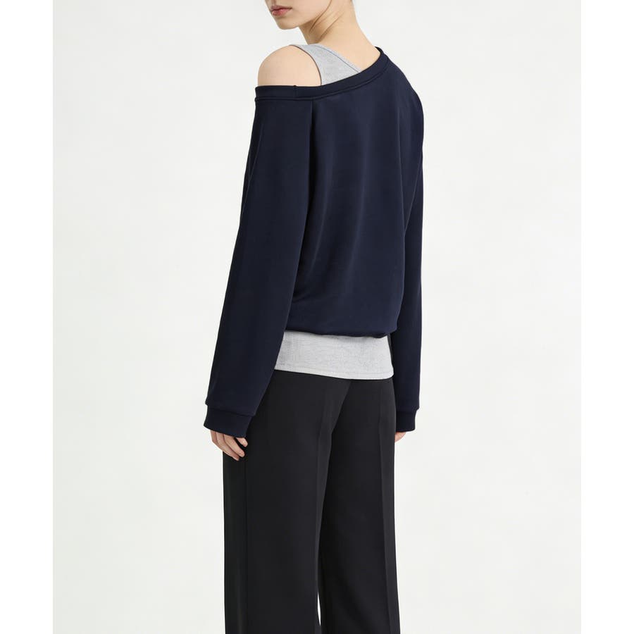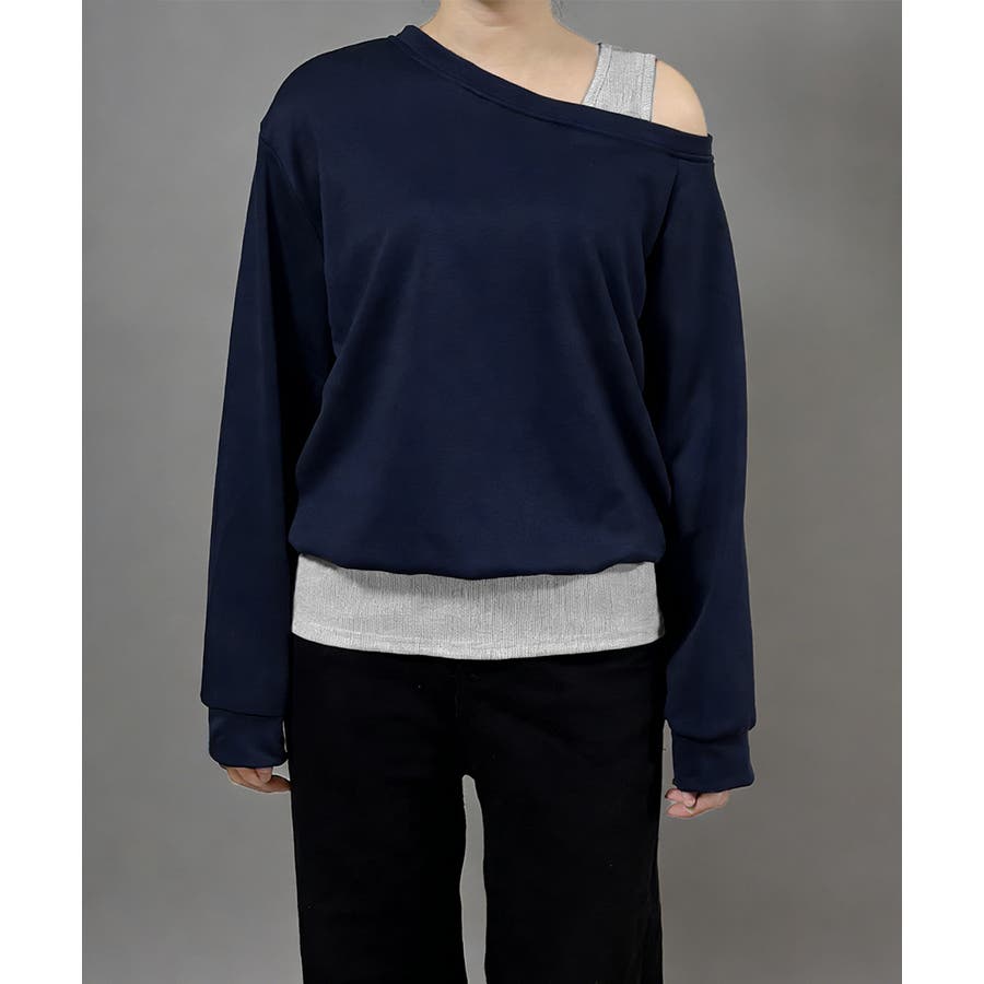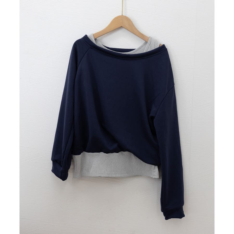 ゆったりとしたシルエットとオフショルダーデザインが特徴のレイヤード風スウェット。