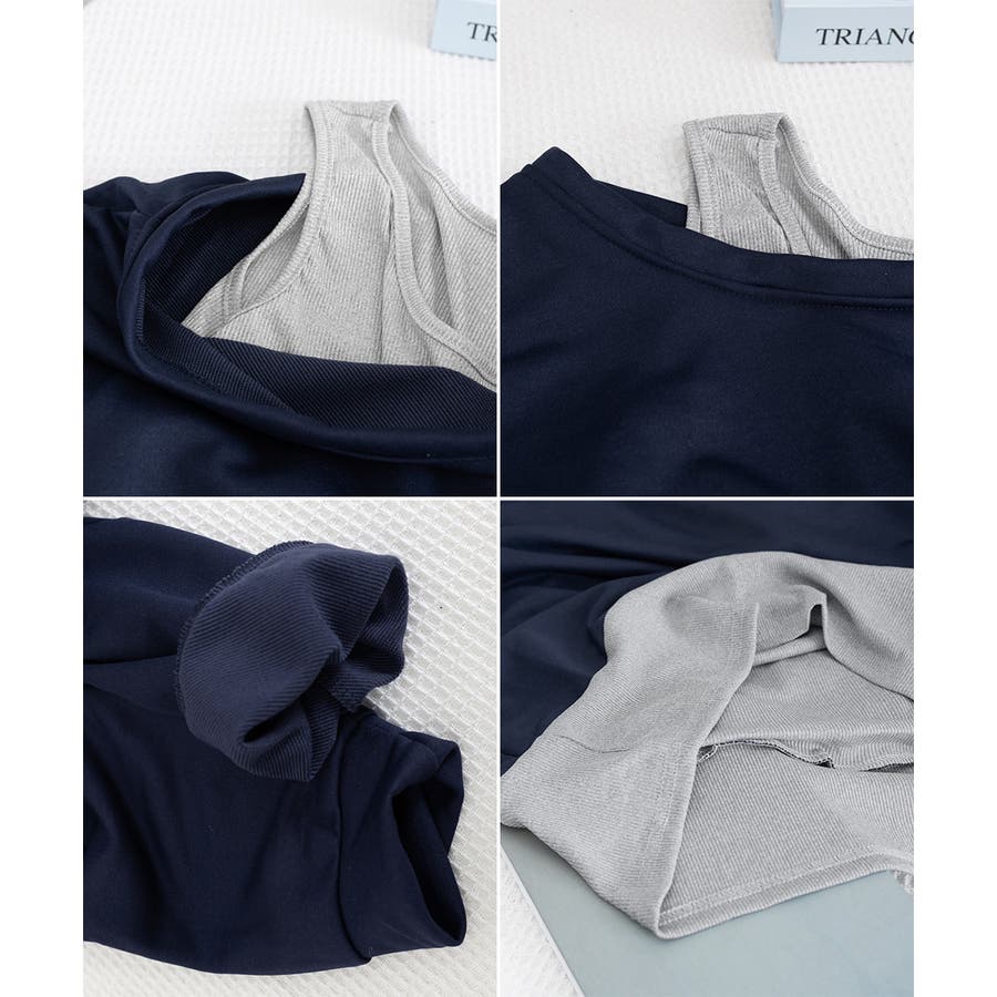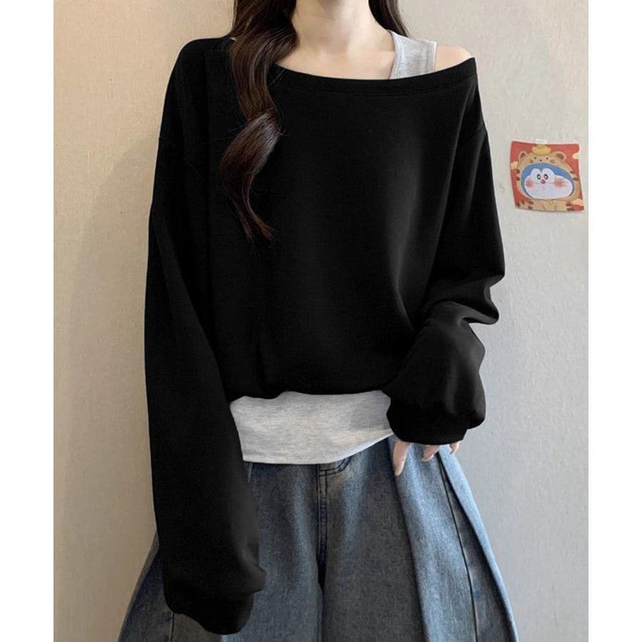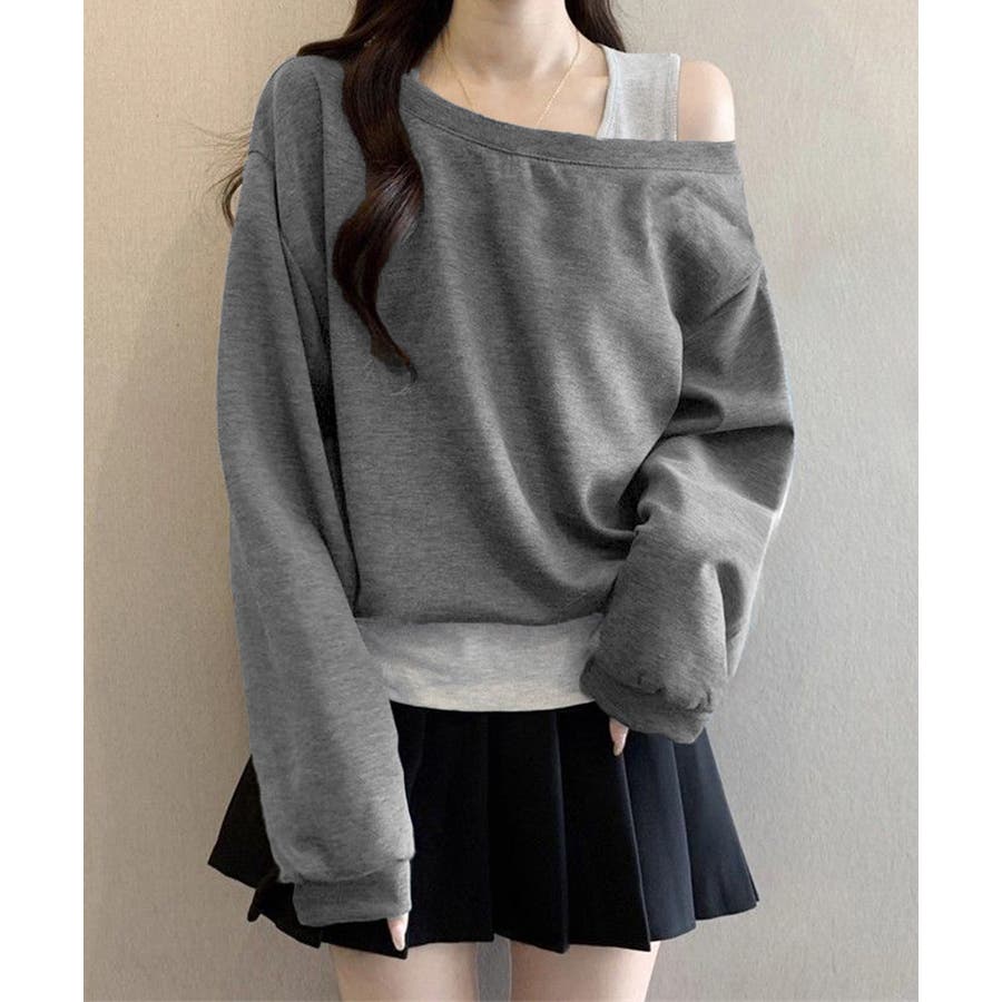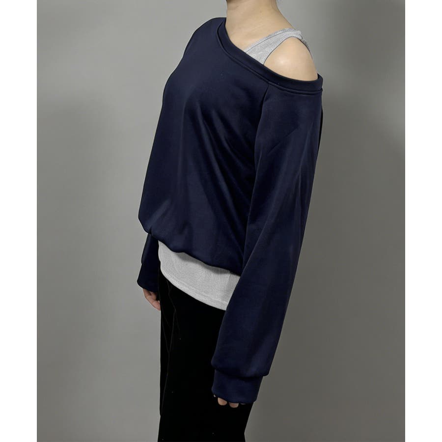 ゆったりとしたシルエットとオフショルダーデザインが特徴のレイヤード風スウェット。