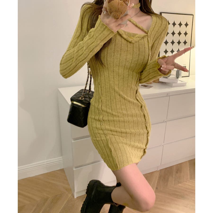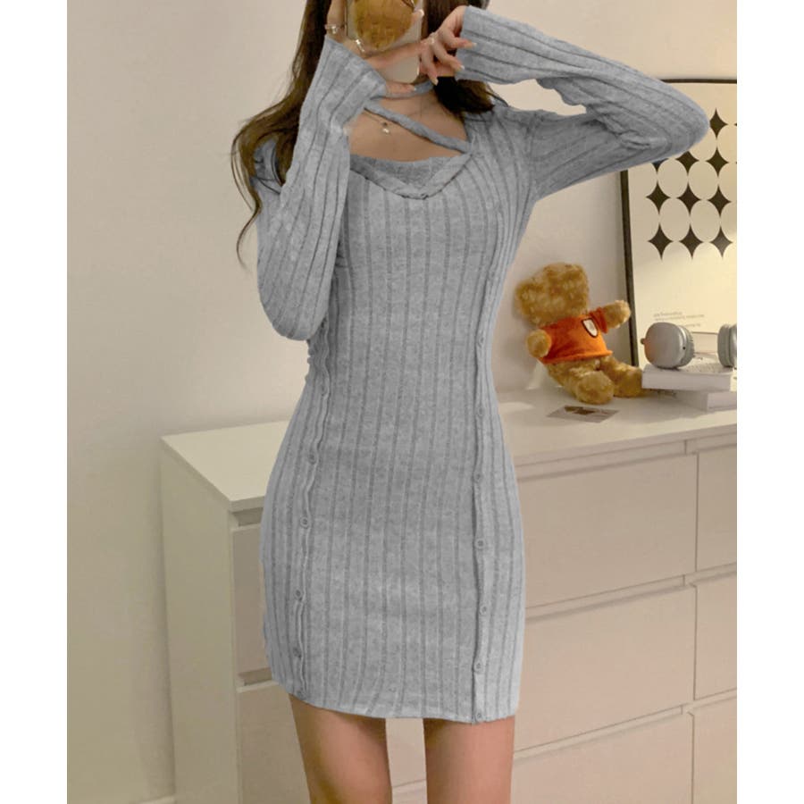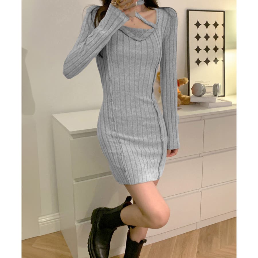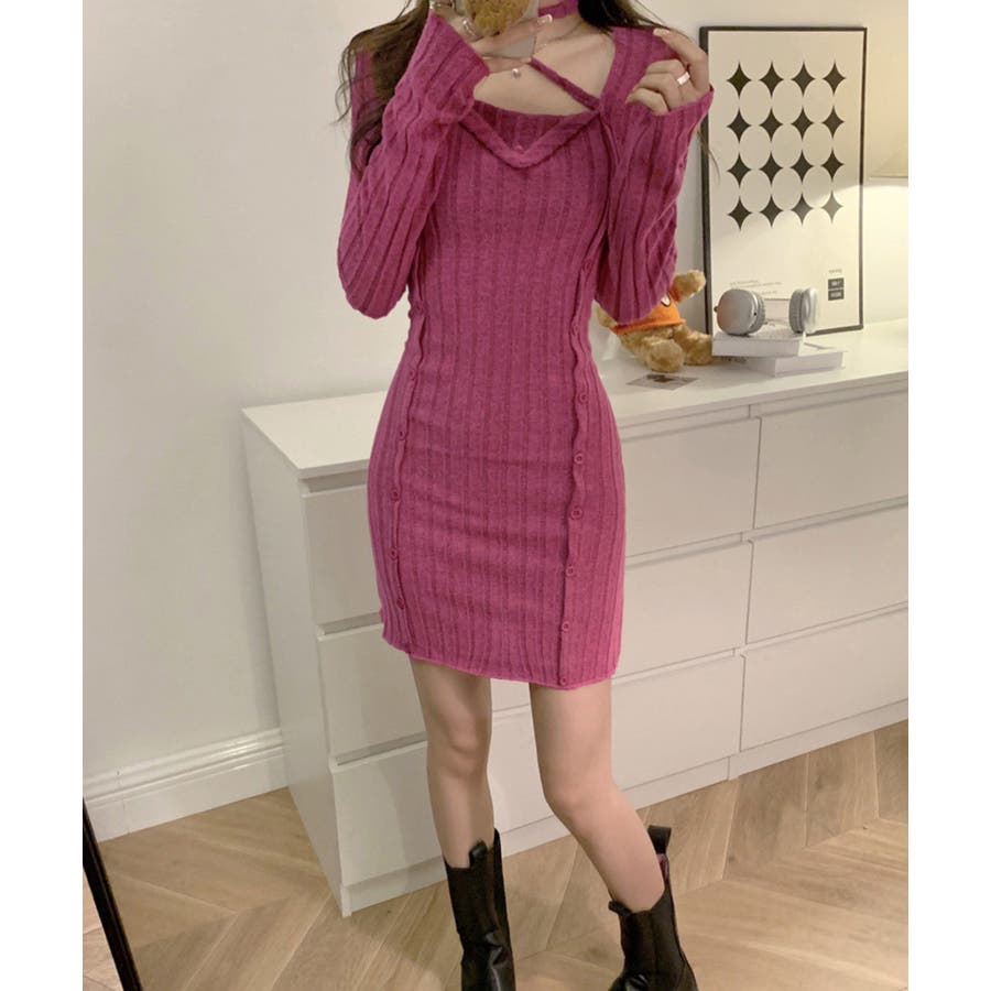 伸縮性のあるニット素材で、程よく体にフィットし、ボディラインを美しく魅せるホルターネックワンピース。