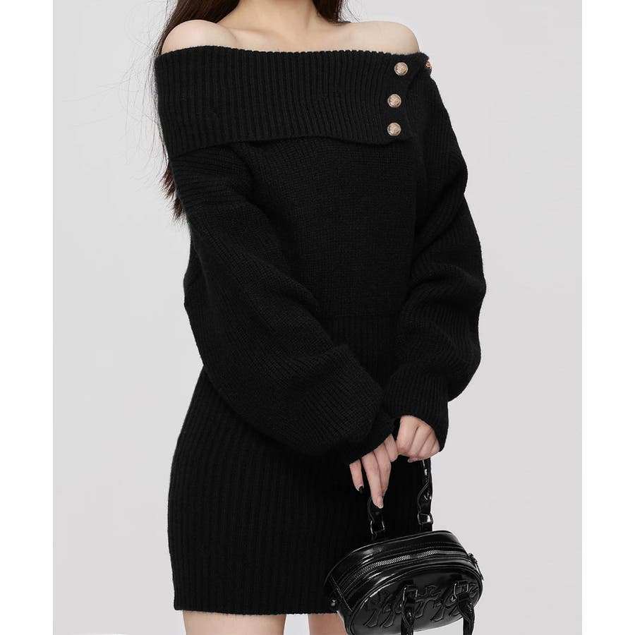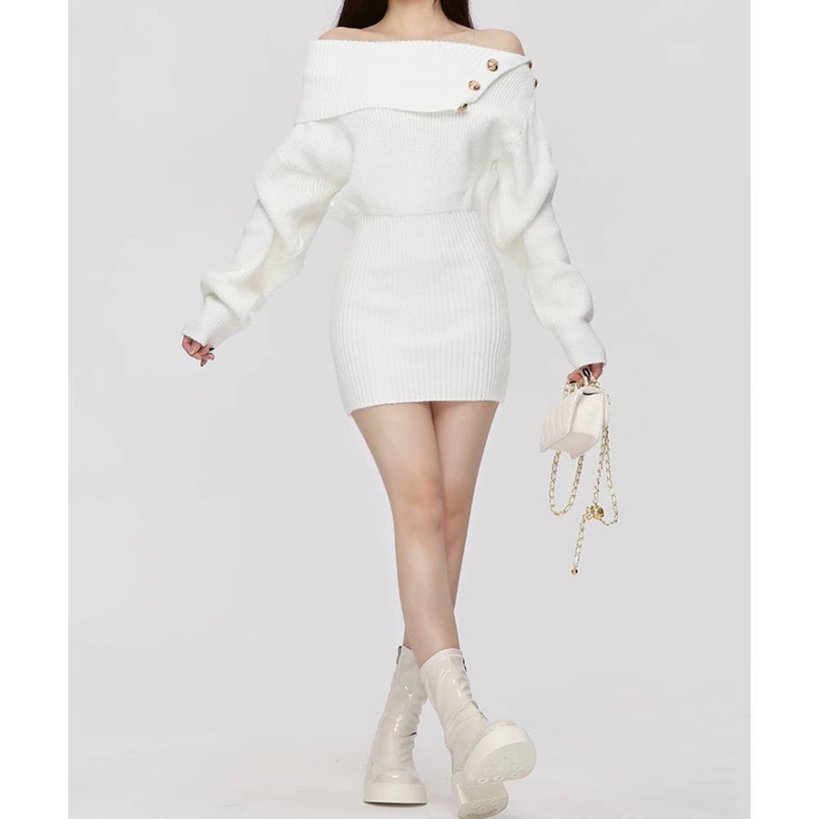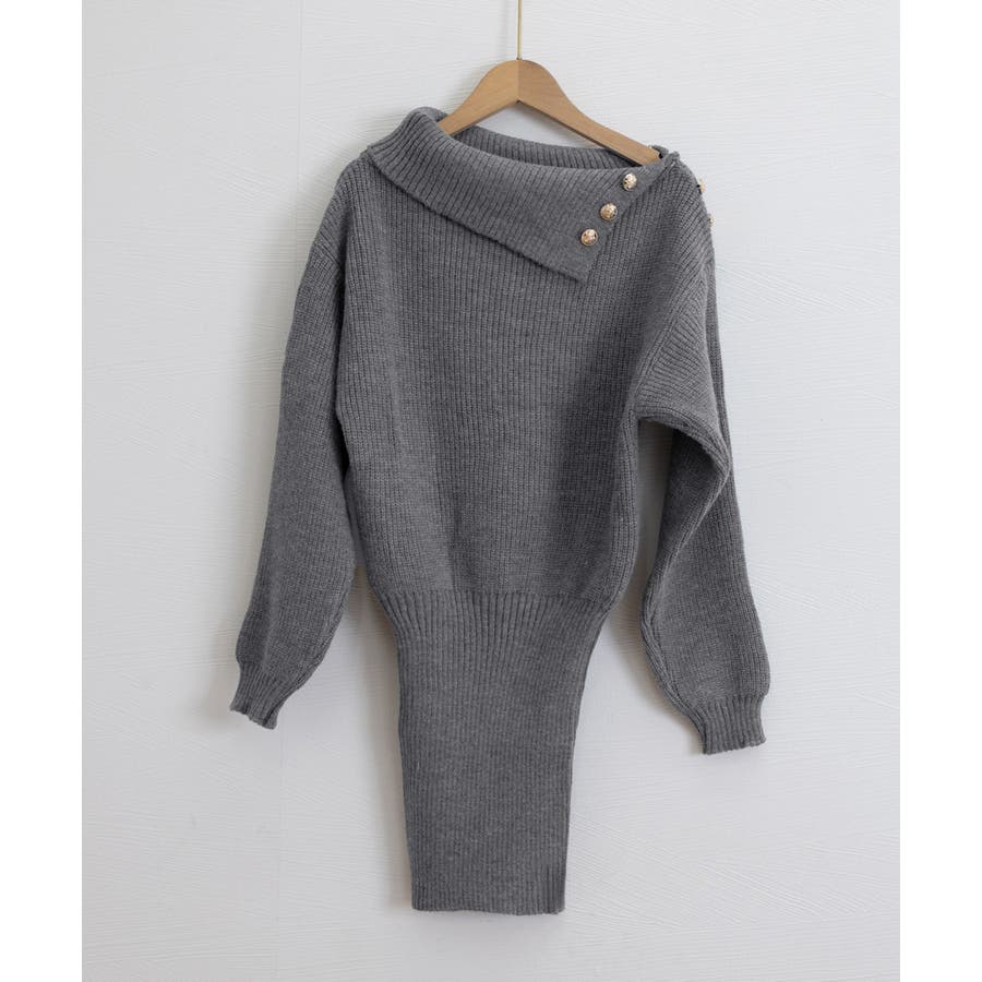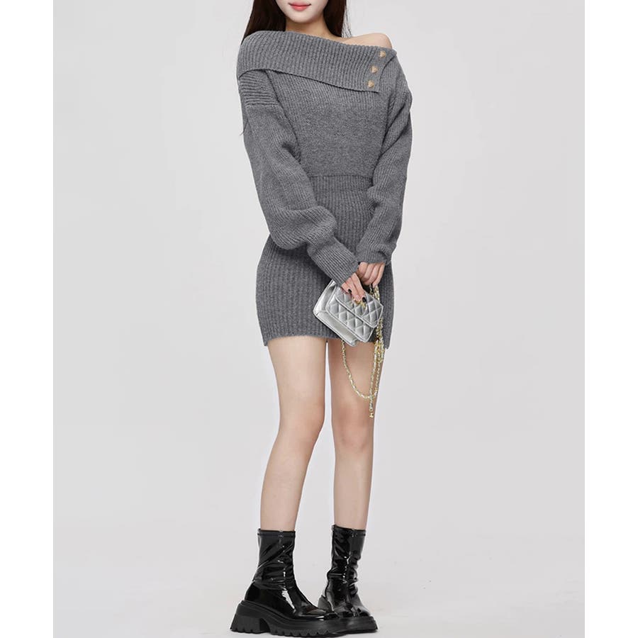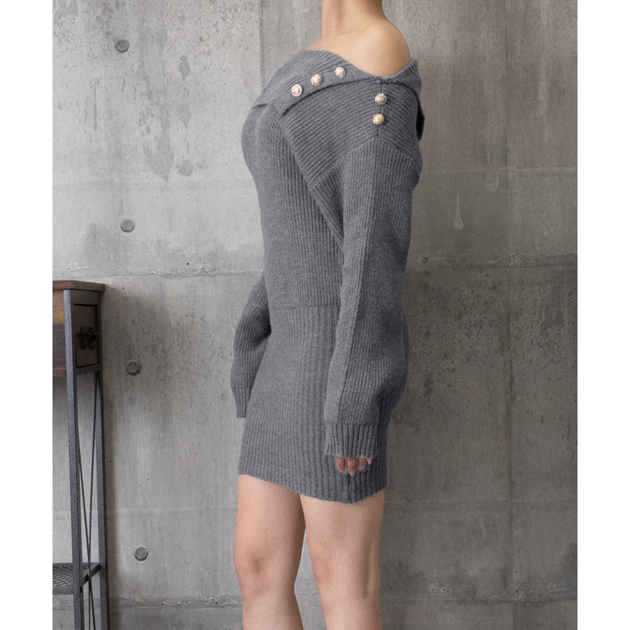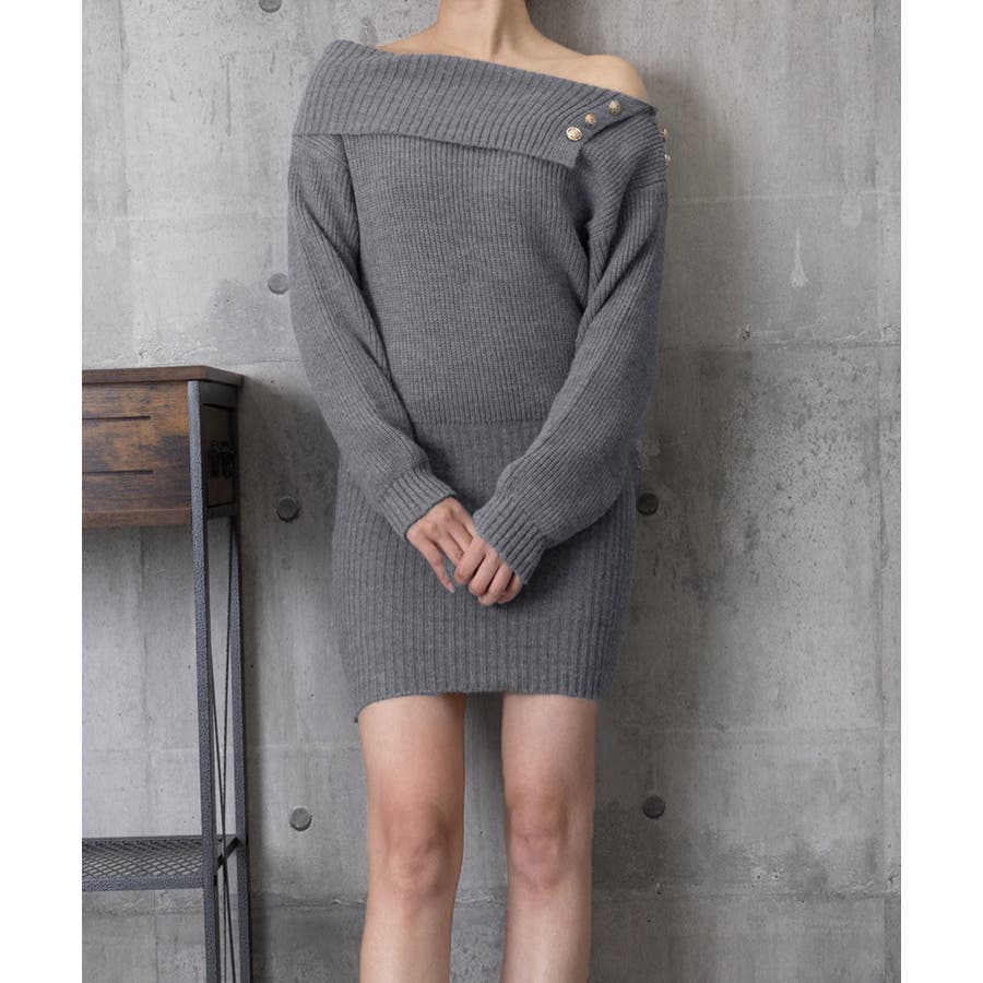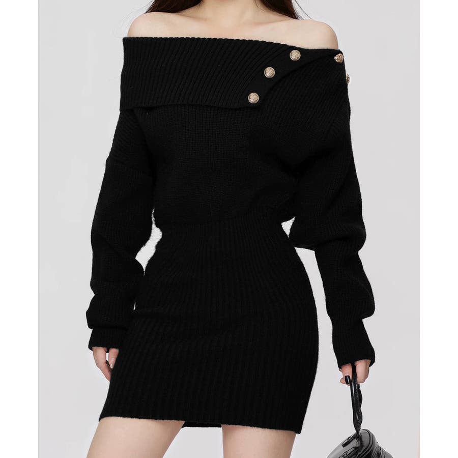 トレンドのオフショルダーに金ボタンデザインを施した、上品な雰囲気漂うニットワンピース。
