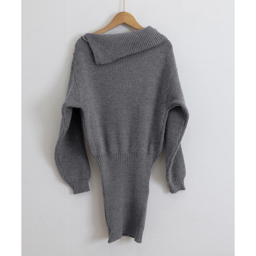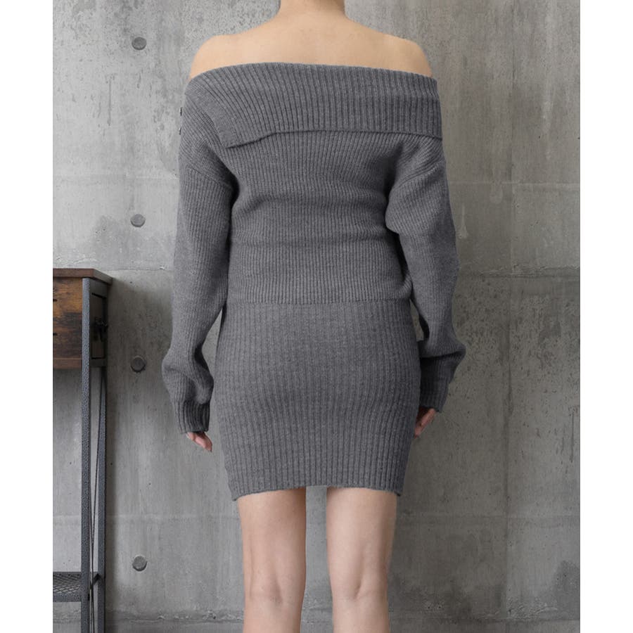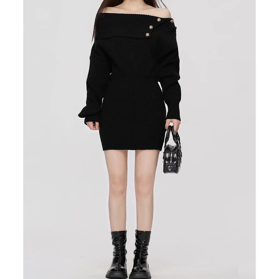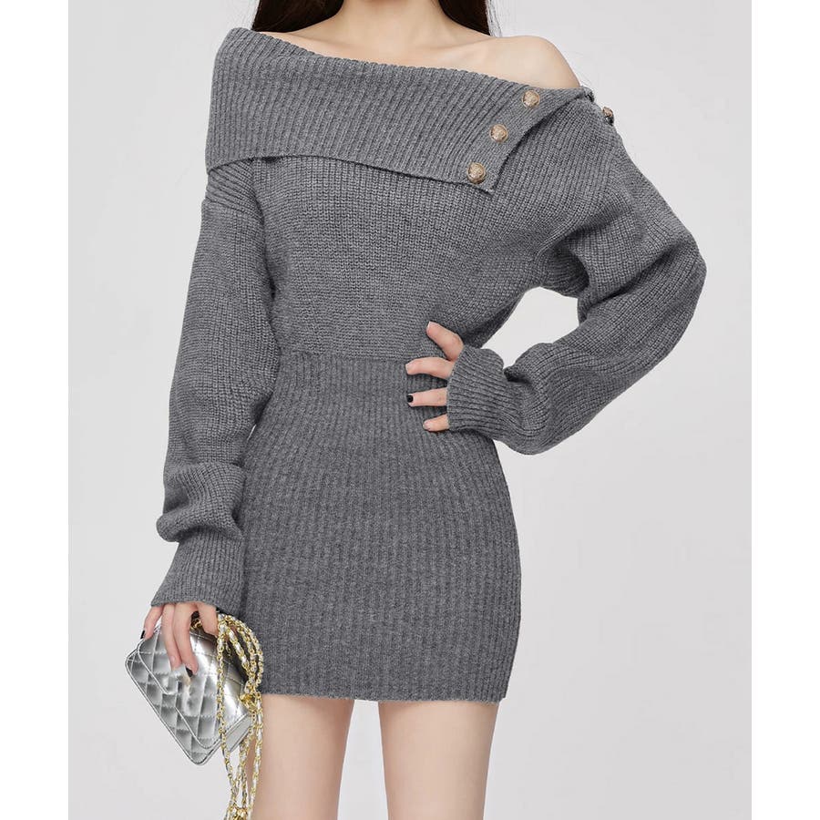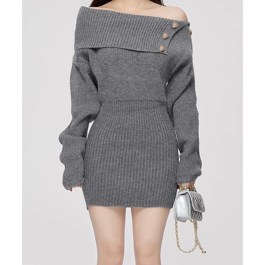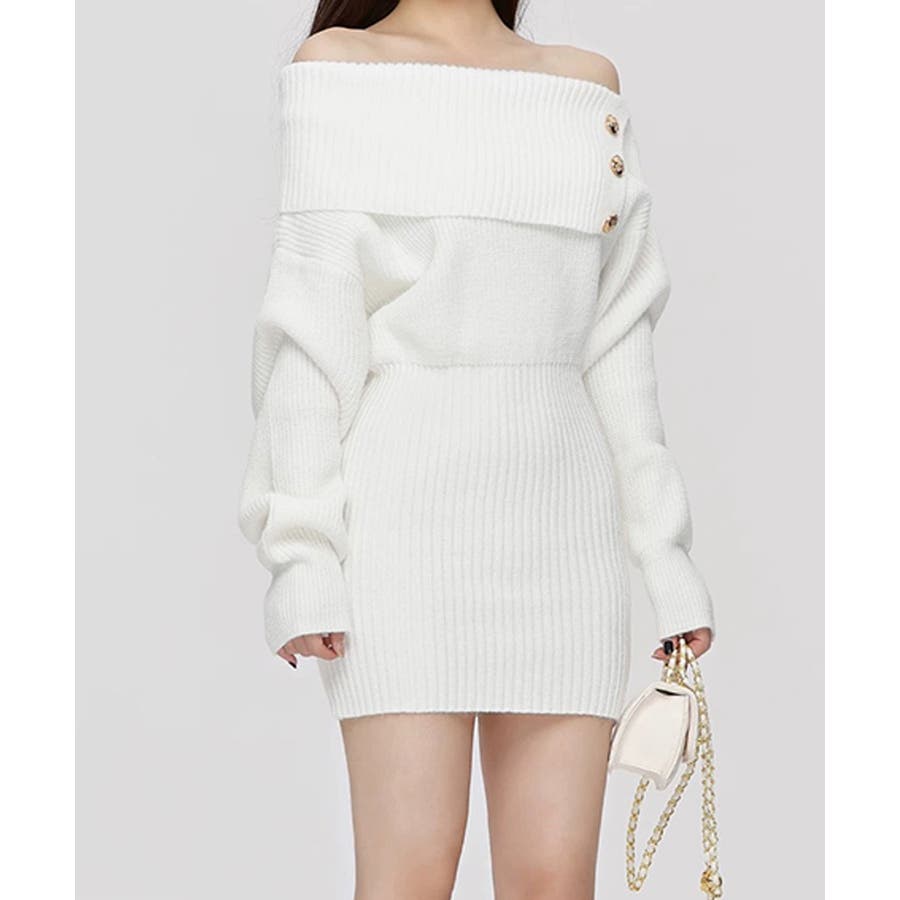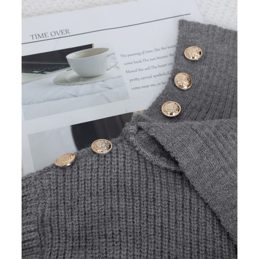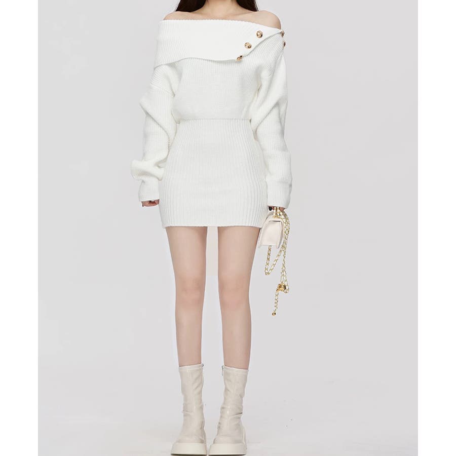 トレンドのオフショルダーに金ボタンデザインを施した、上品な雰囲気漂うニットワンピース。