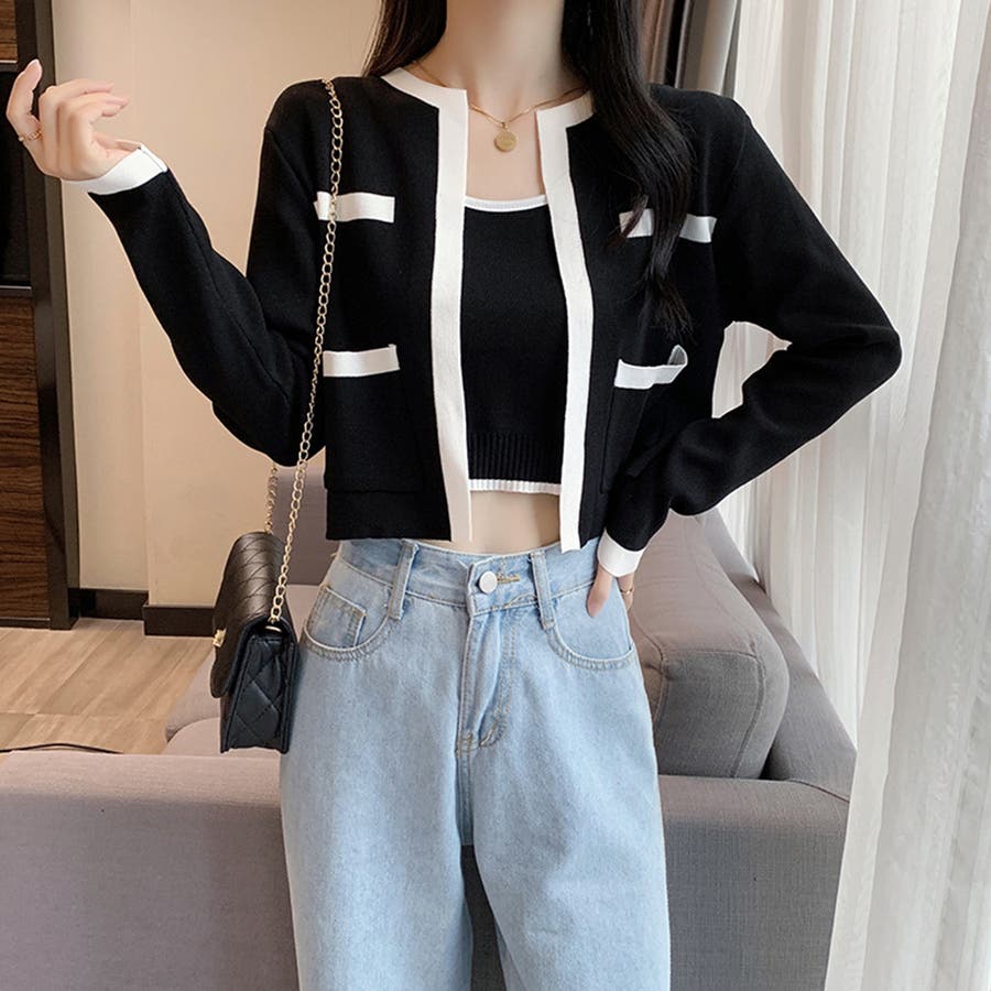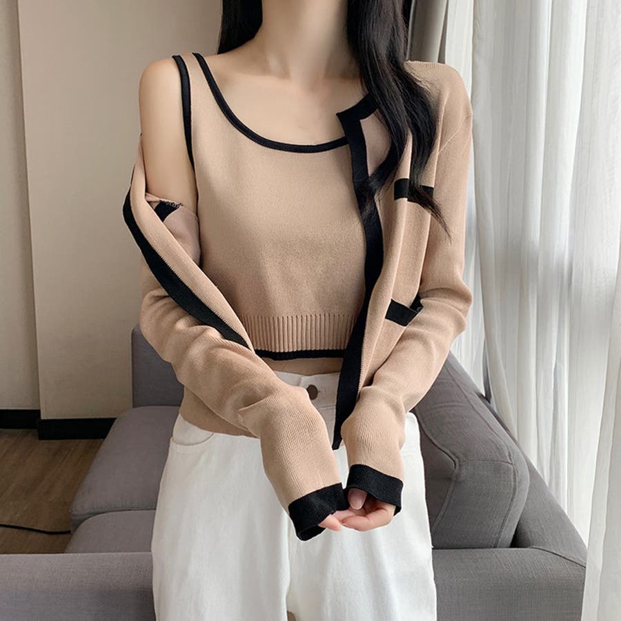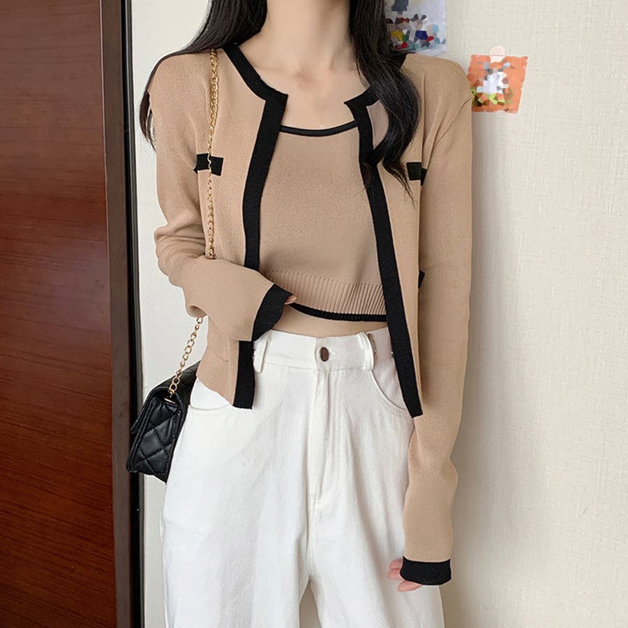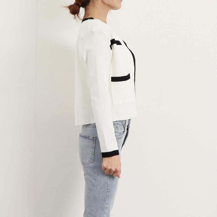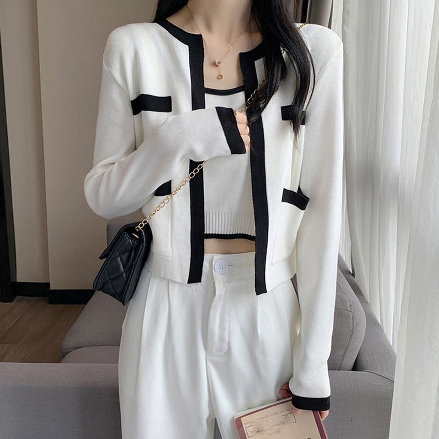 大胆なモノトーン配色が目を引く大人コーデにおすすめの2点セットのニットアンサンブル