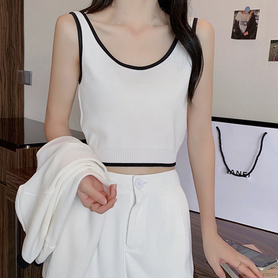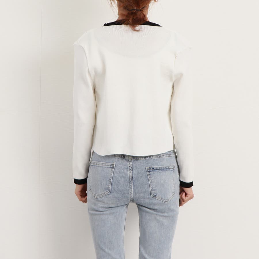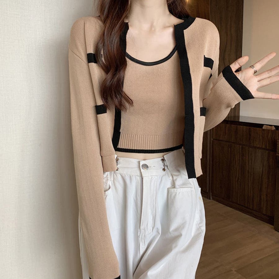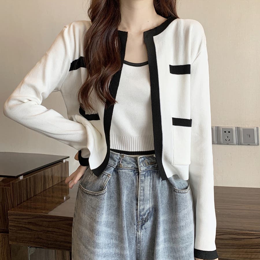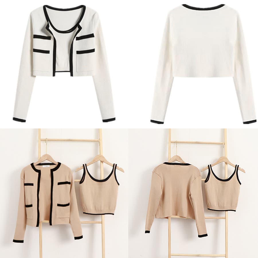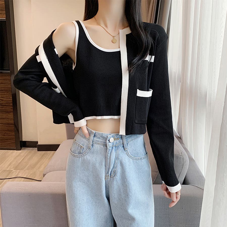 大胆なモノトーン配色が目を引く大人コーデにおすすめの2点セットのニットアンサンブル