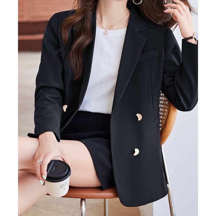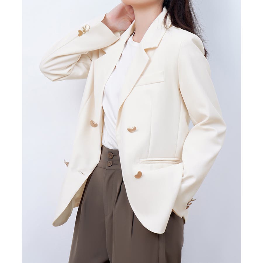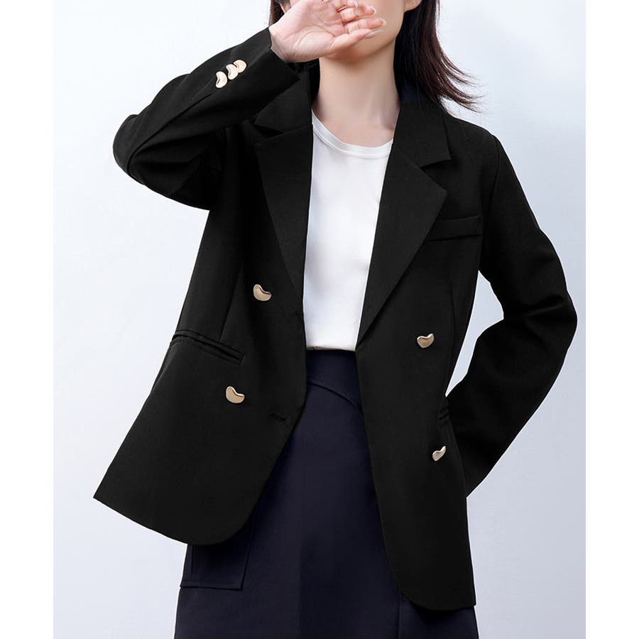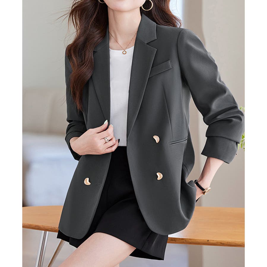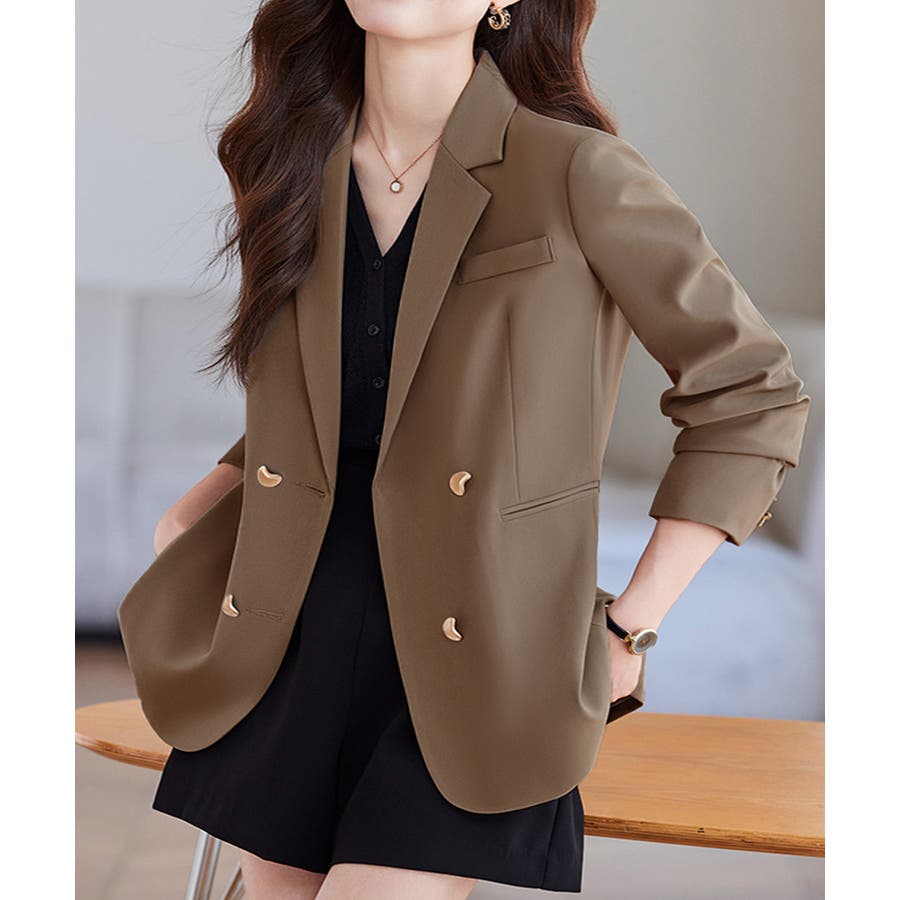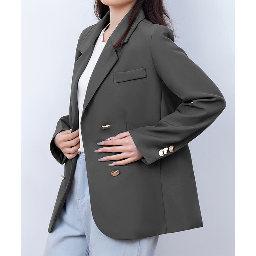 金色のボタンが上品な輝きを放つ、ダブルブレストデザインのテーラードジャケット。