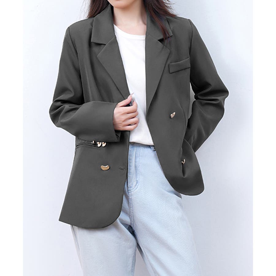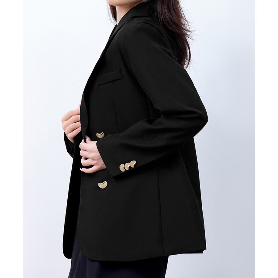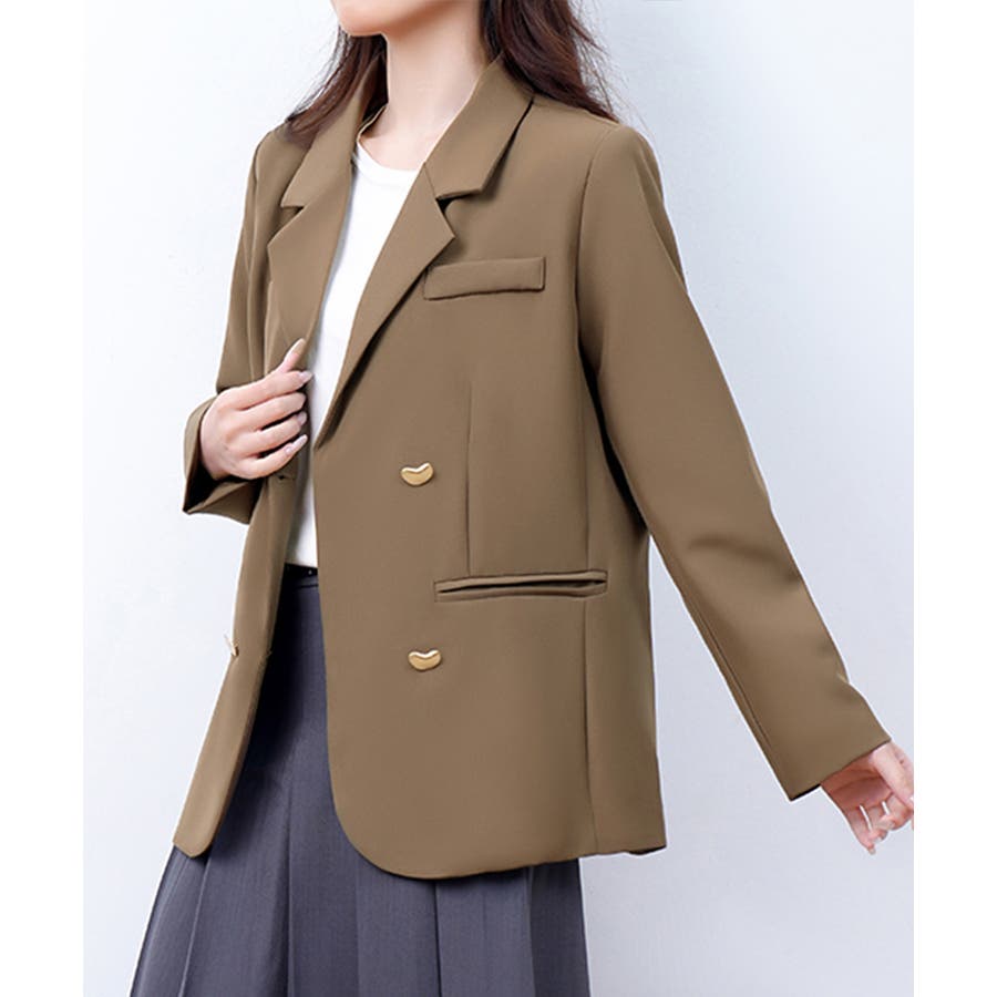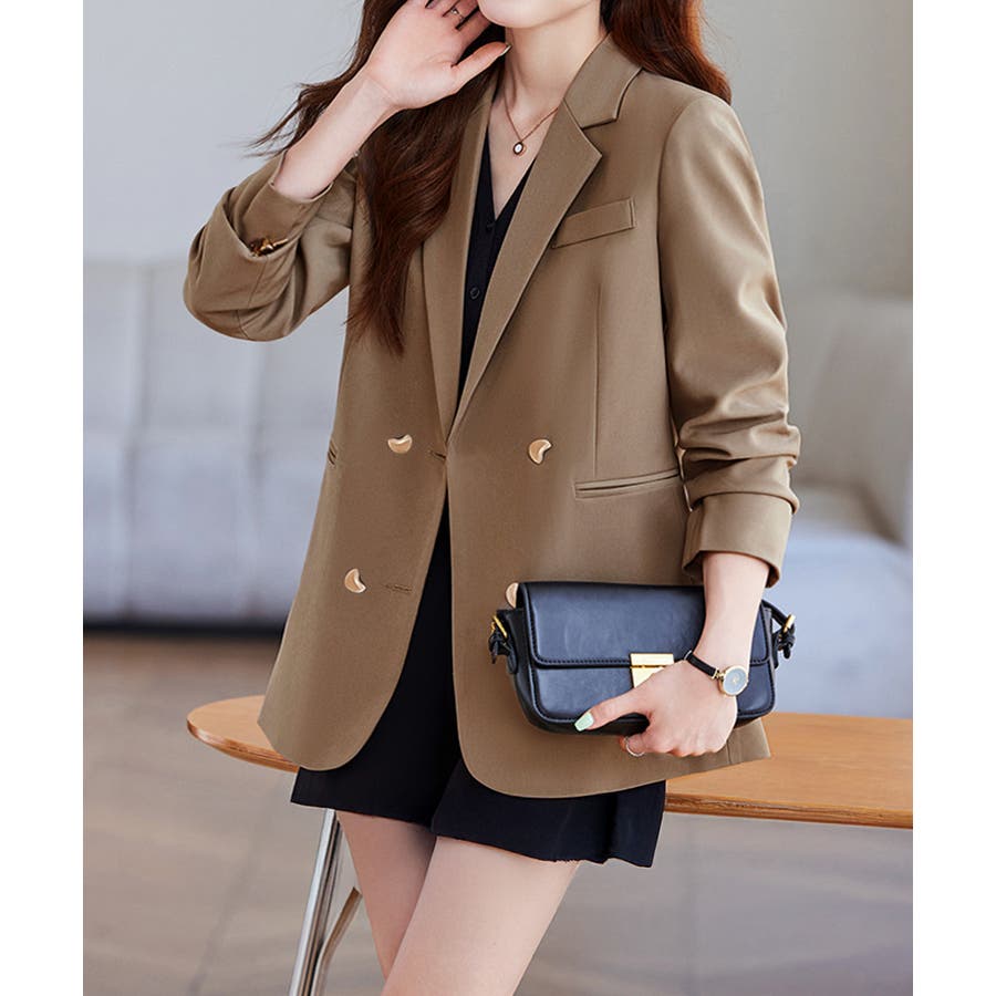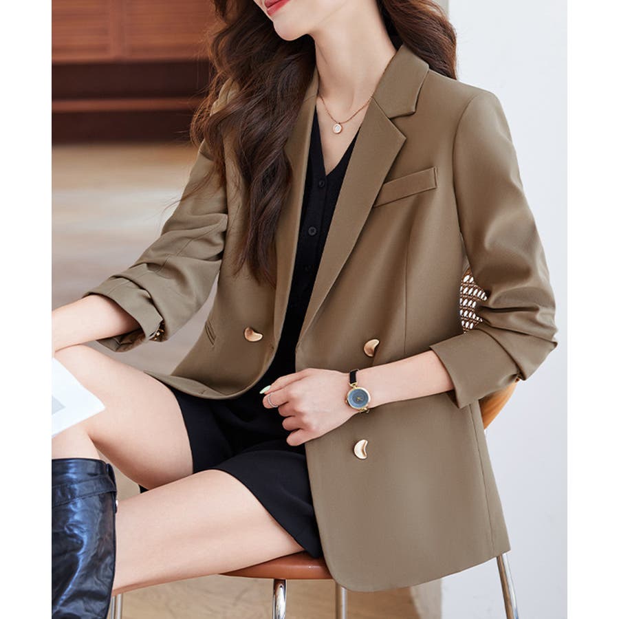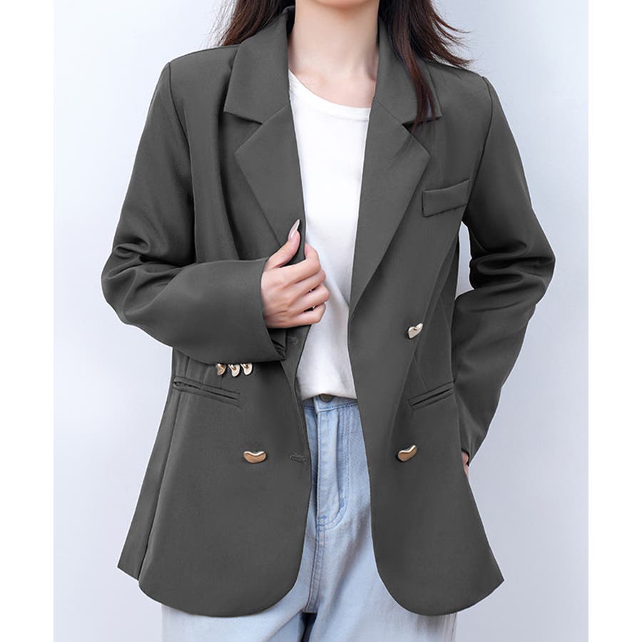 金色のボタンが上品な輝きを放つ、ダブルブレストデザインのテーラードジャケット。