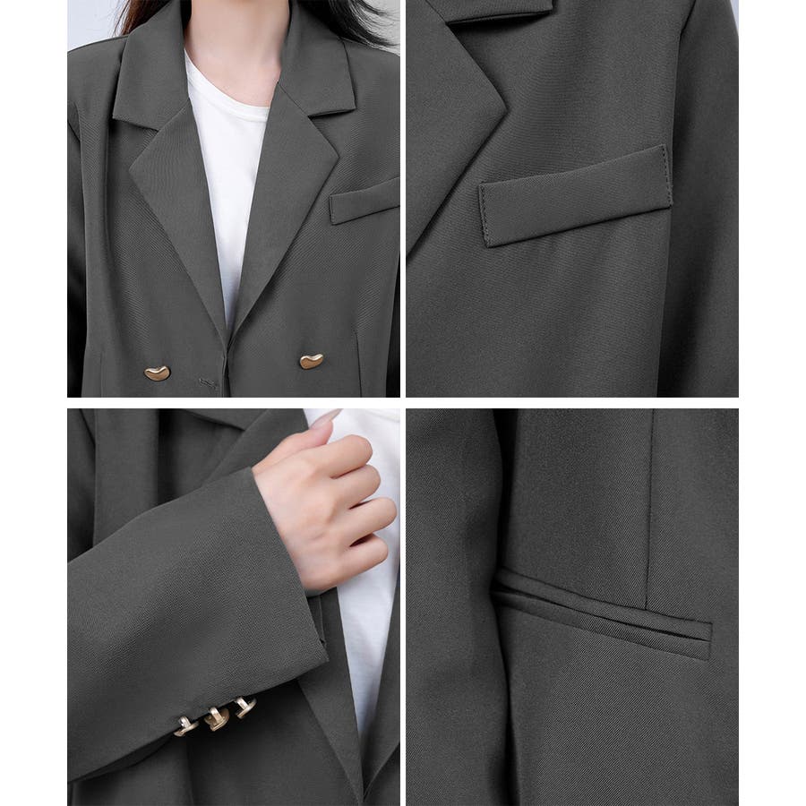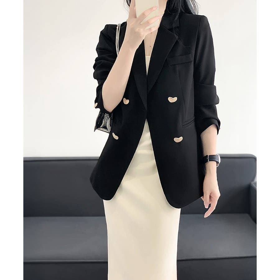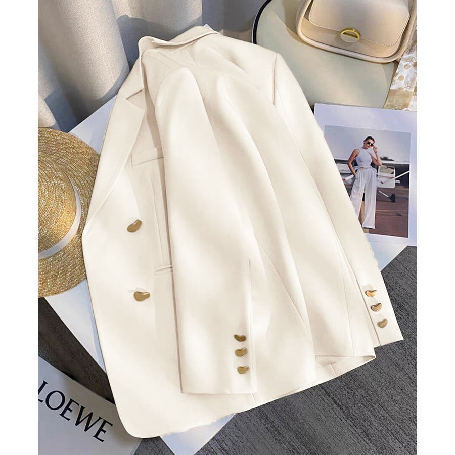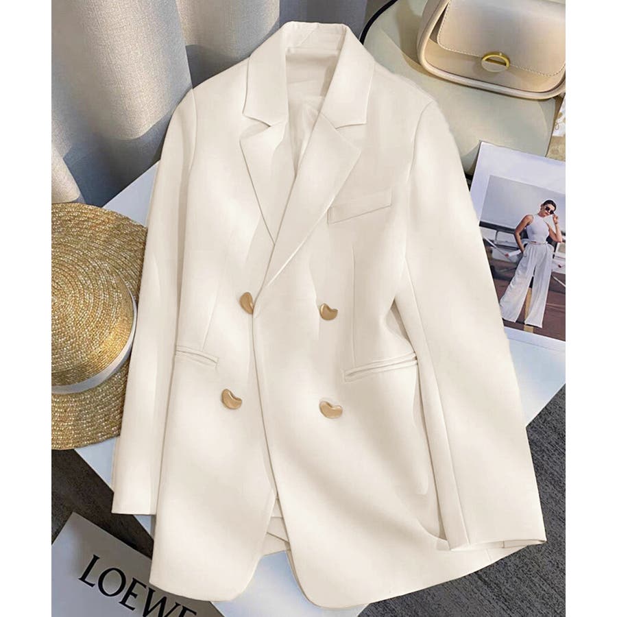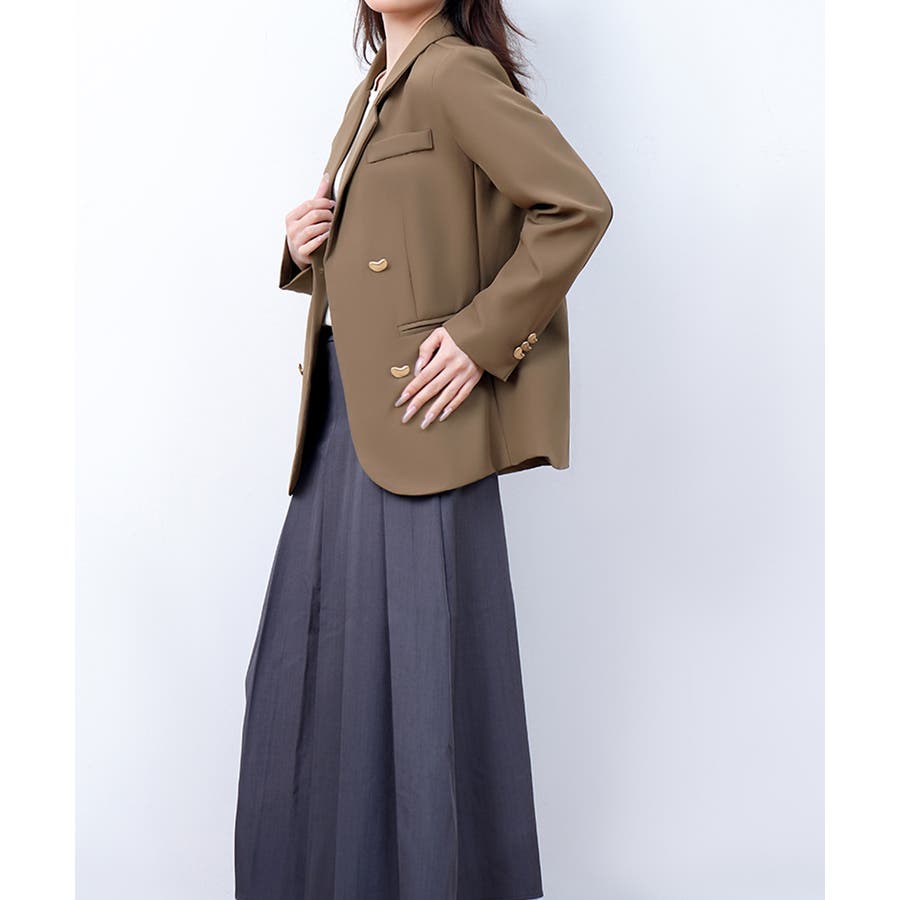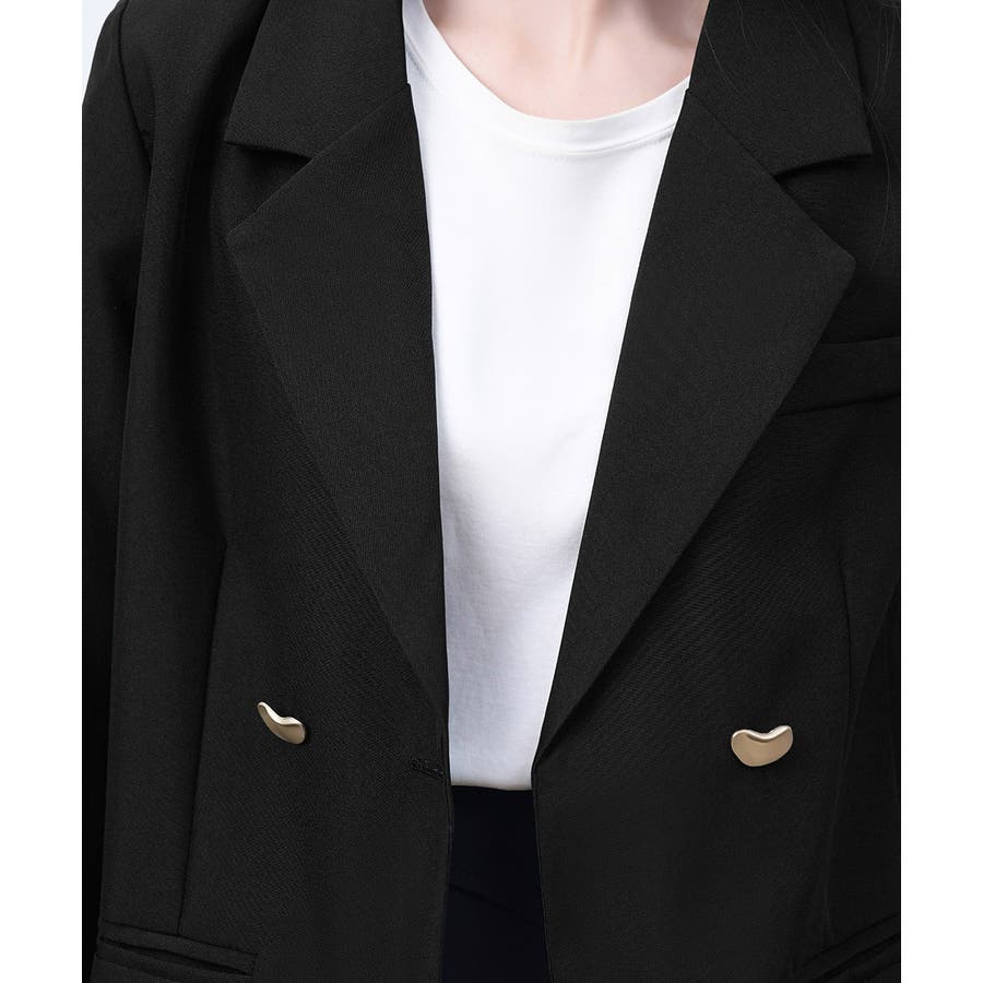 金色のボタンが上品な輝きを放つ、ダブルブレストデザインのテーラードジャケット。