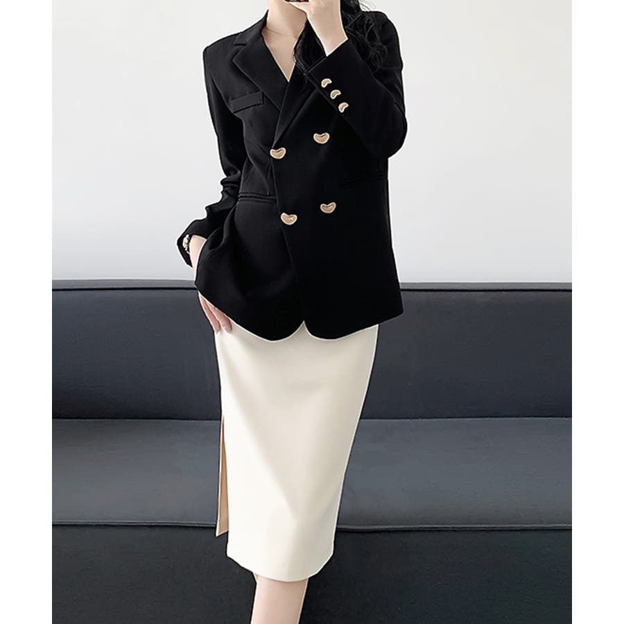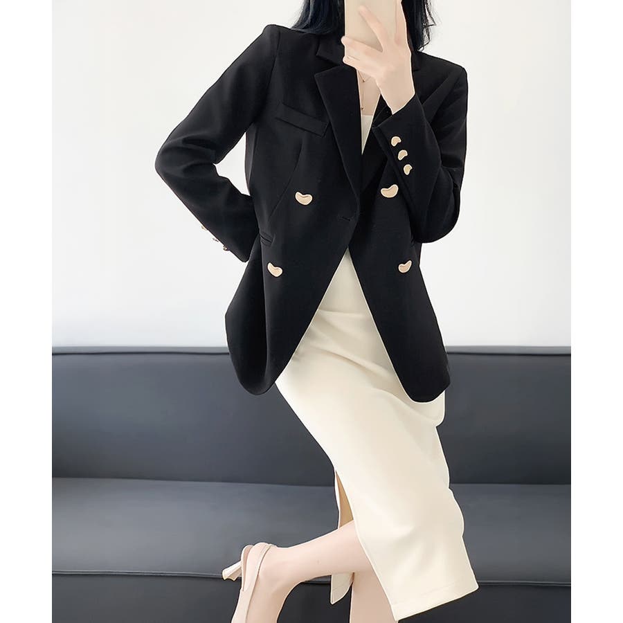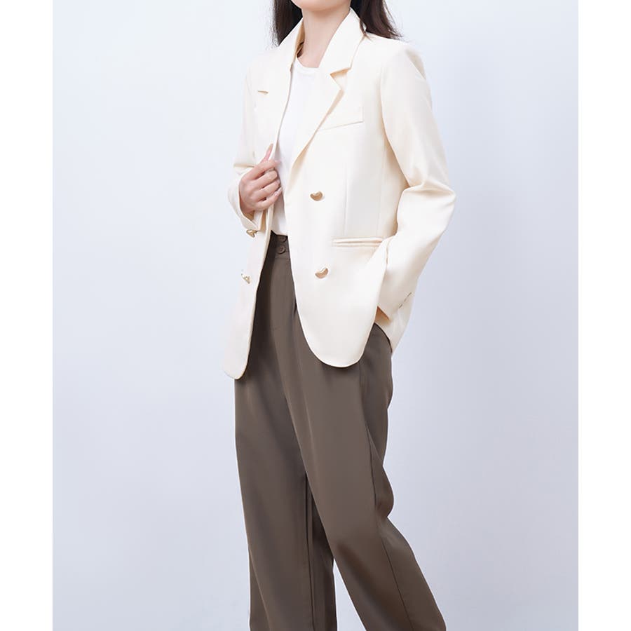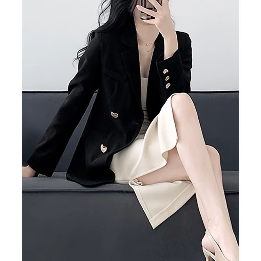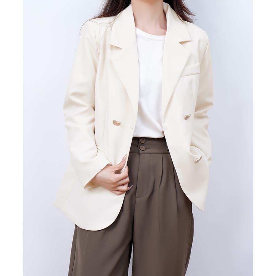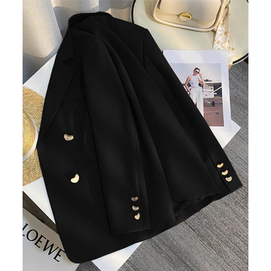 金色のボタンが上品な輝きを放つ、ダブルブレストデザインのテーラードジャケット。