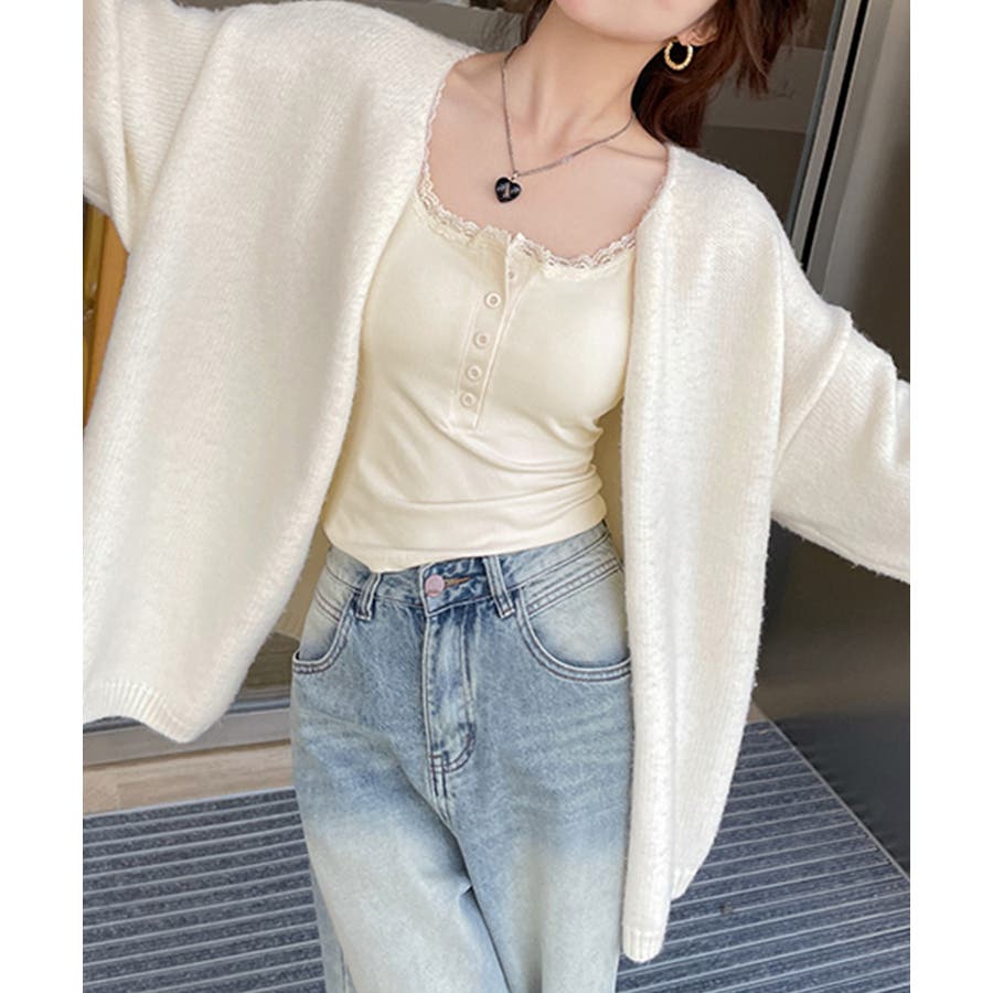 繊細なレースデザインが女性らしさを引き立て、ボタンがアクセントになっている。