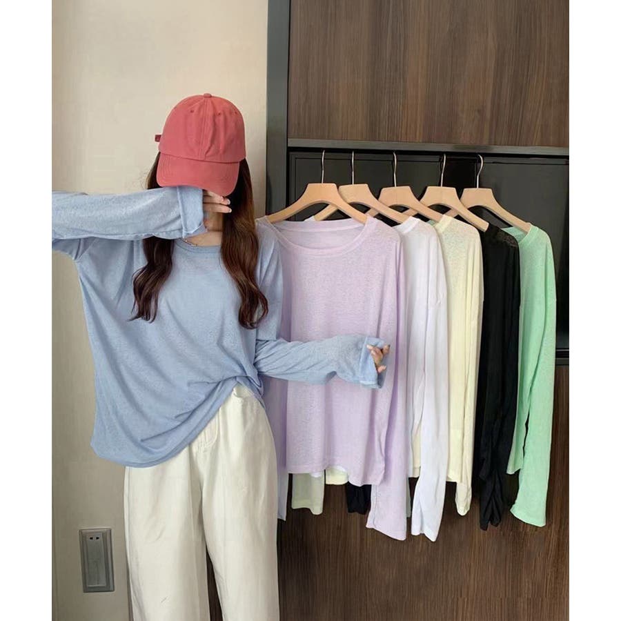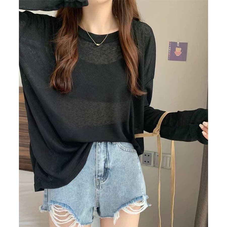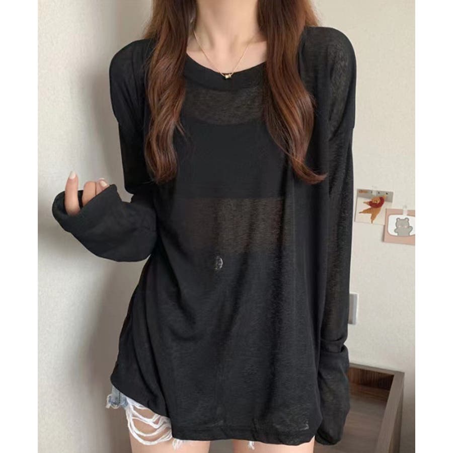 着やせ長袖トップス 軽やか無地ロンt黒 肌見せ カットソー