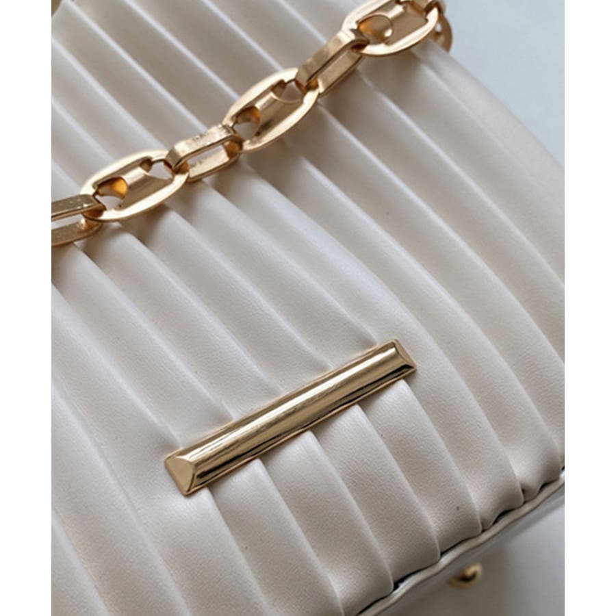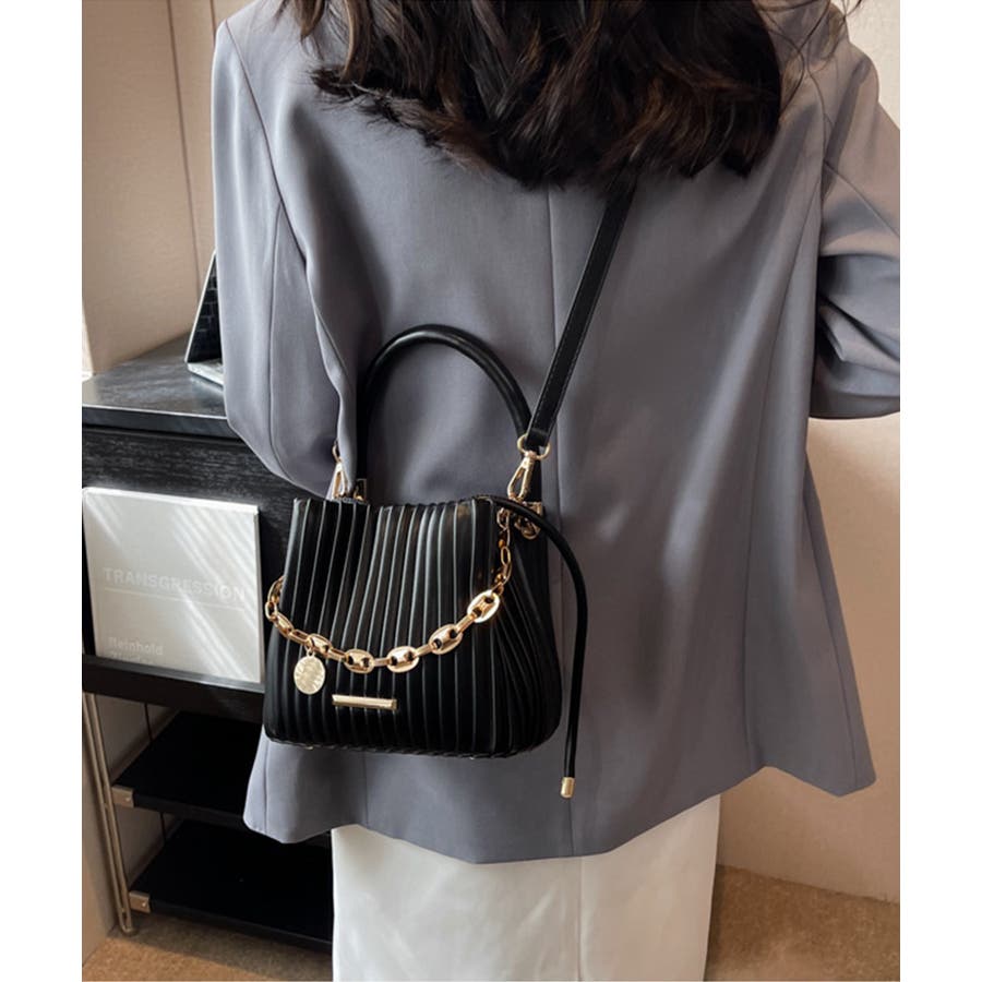 こなれた表情のプリーツPUレザーに、輝きをプラスするチェーンチャームを組み合わせた高見えデザイン