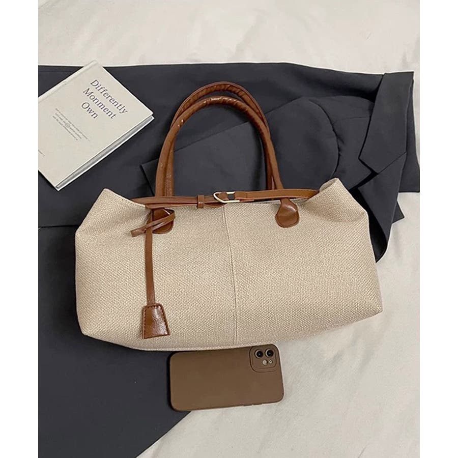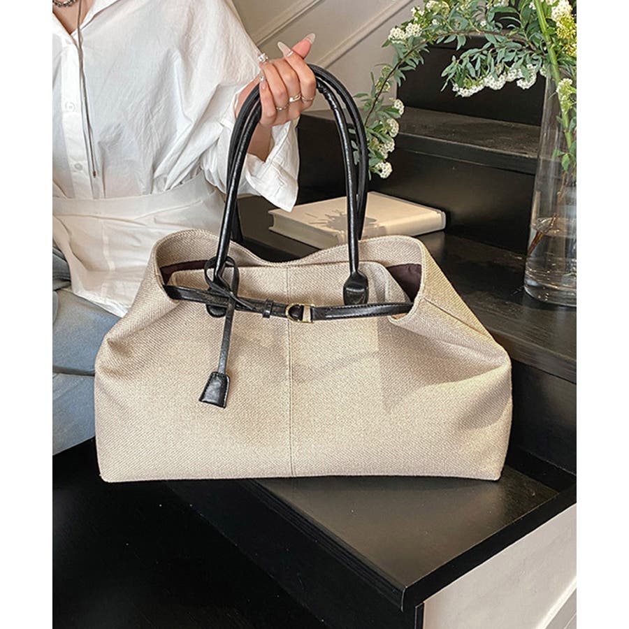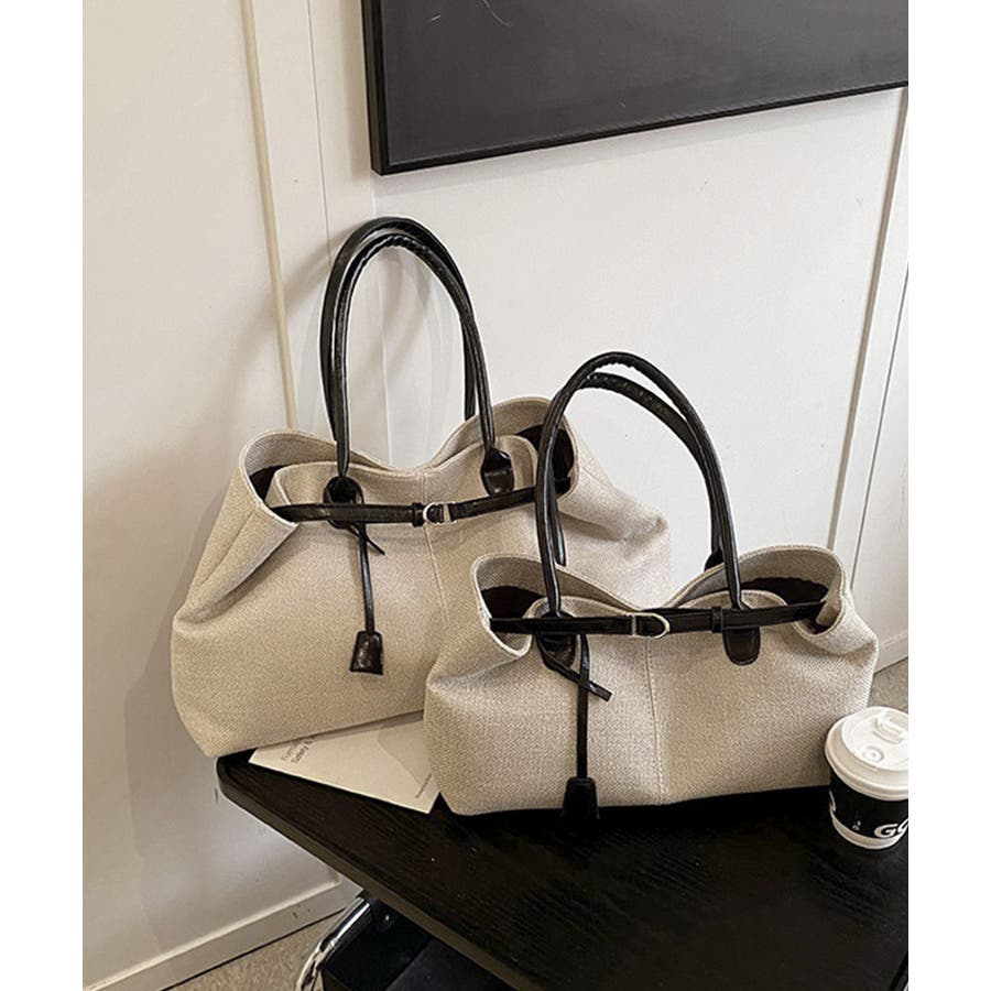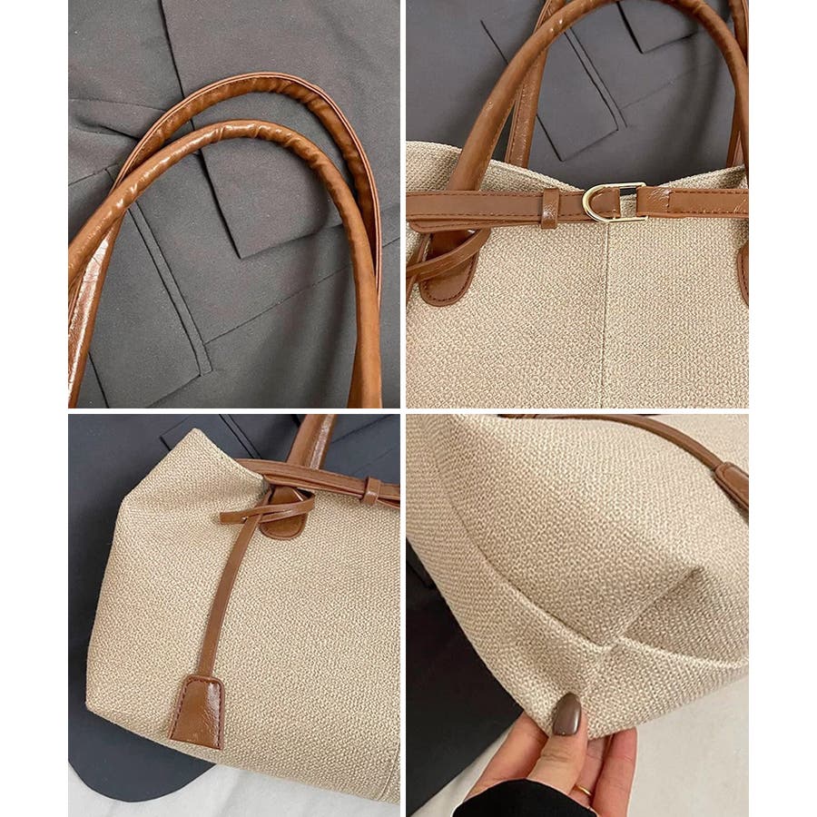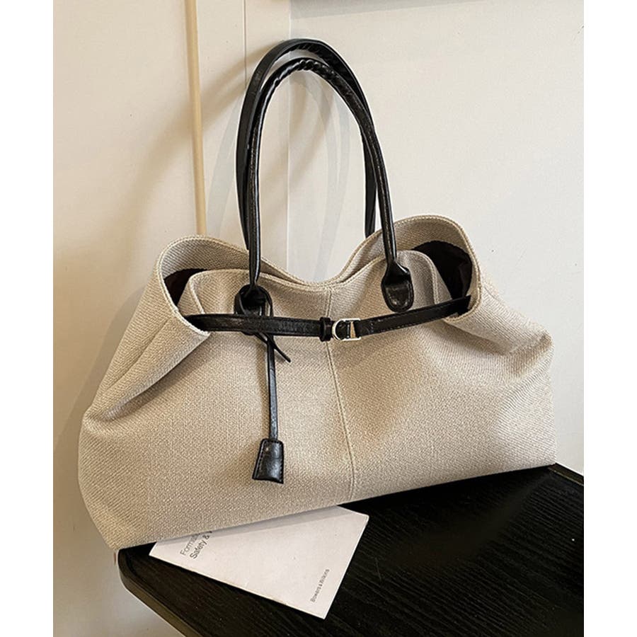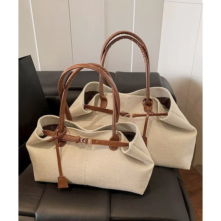 ナチュラル風生地にレザー調のハンドルとベルトが映えるレディーストートバッグ。