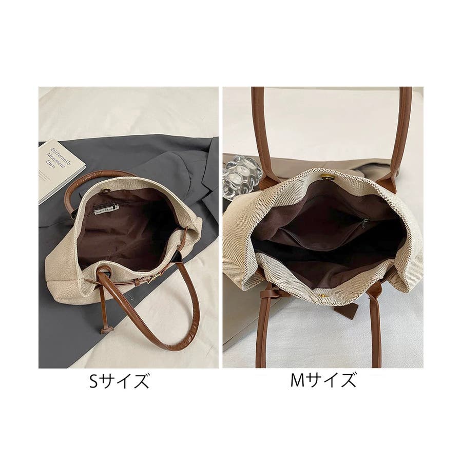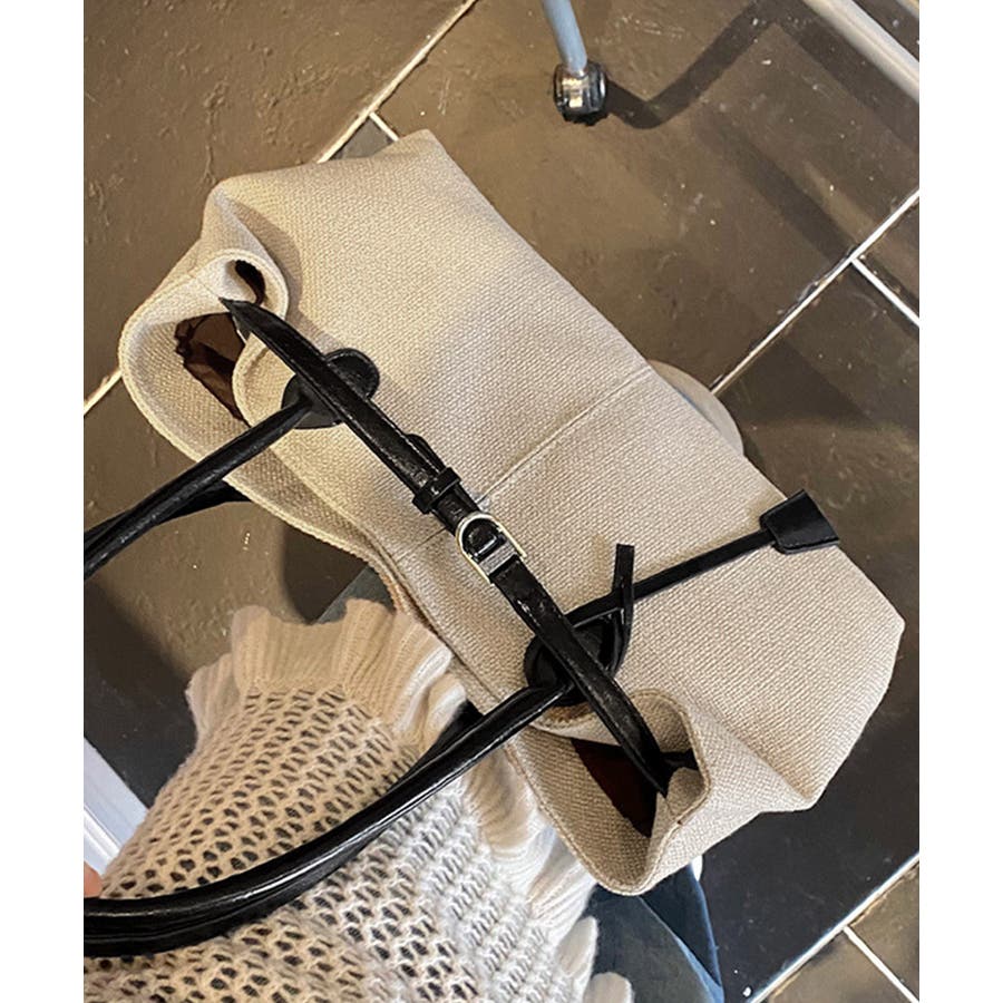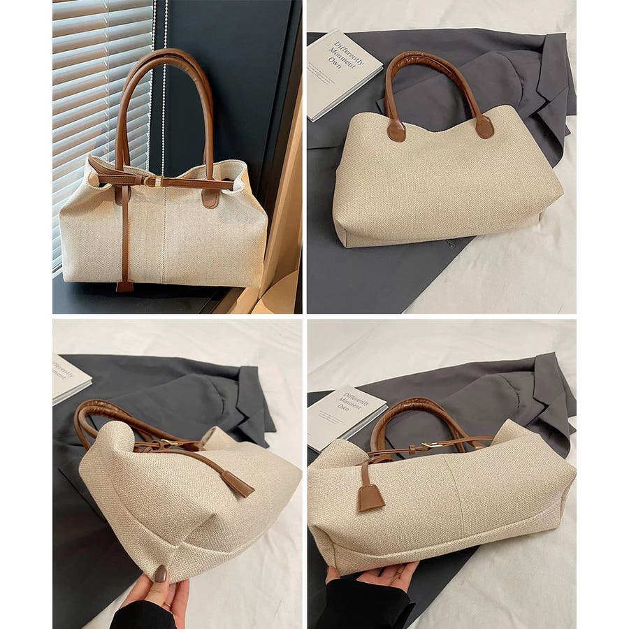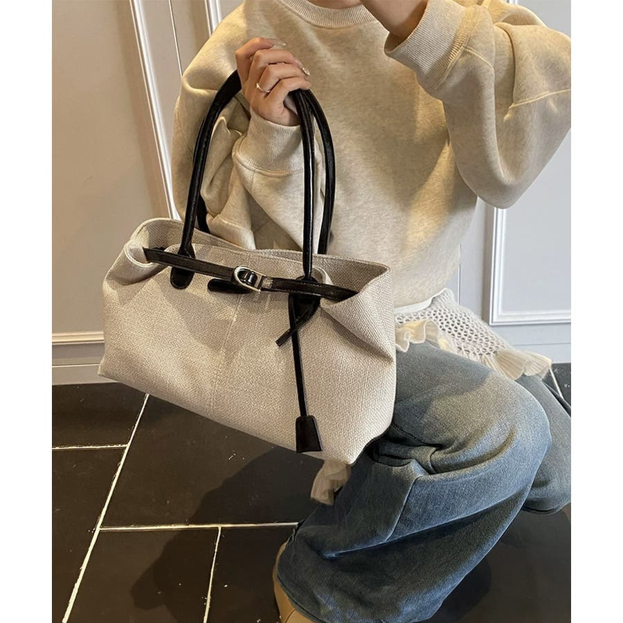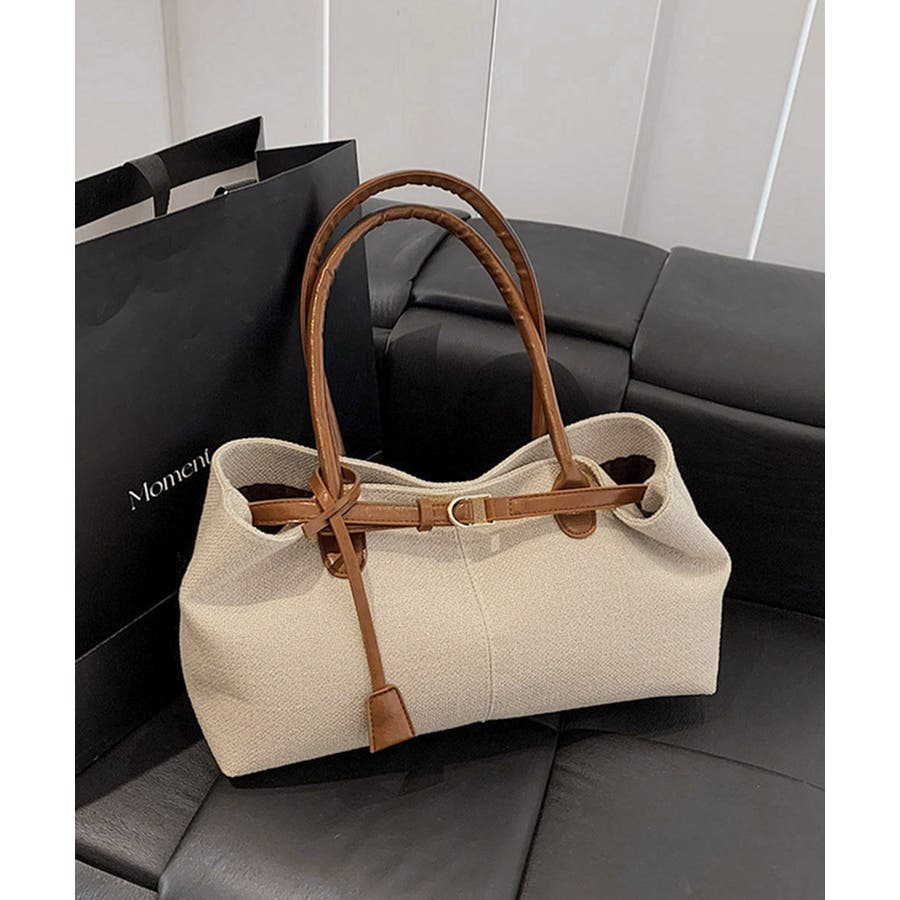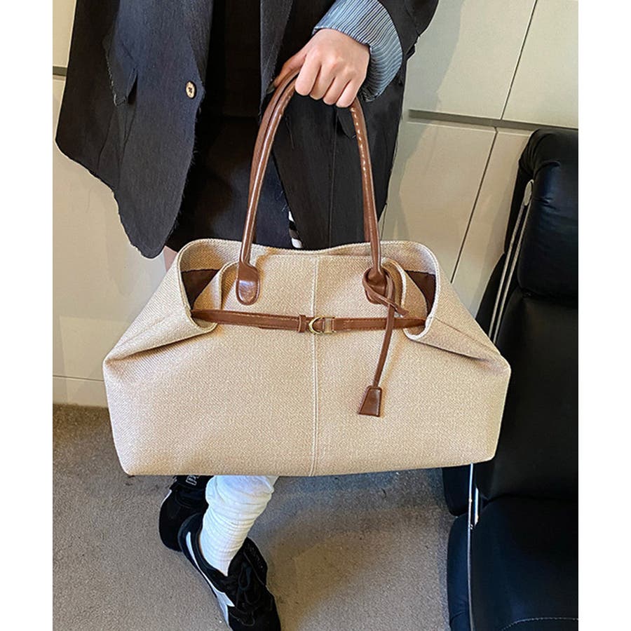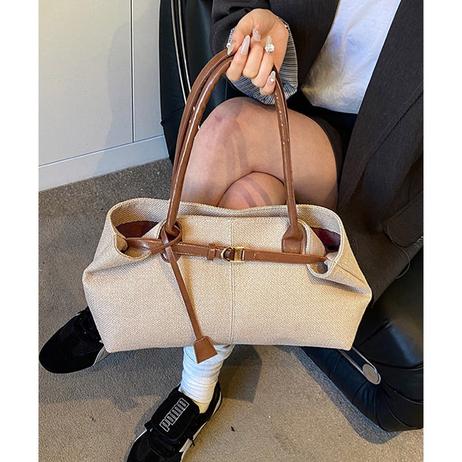 ナチュラル風生地にレザー調のハンドルとベルトが映えるレディーストートバッグ。
