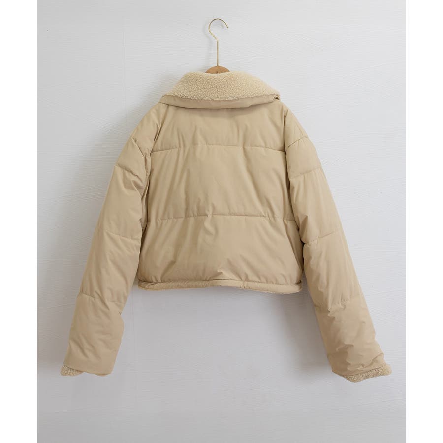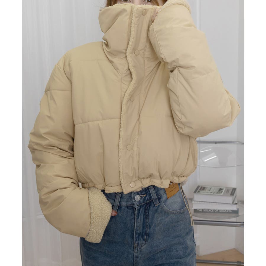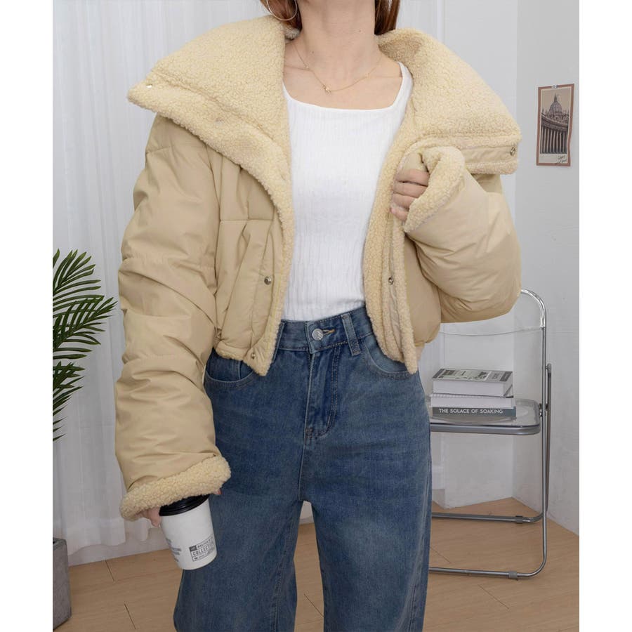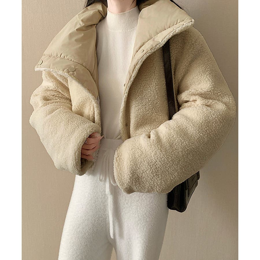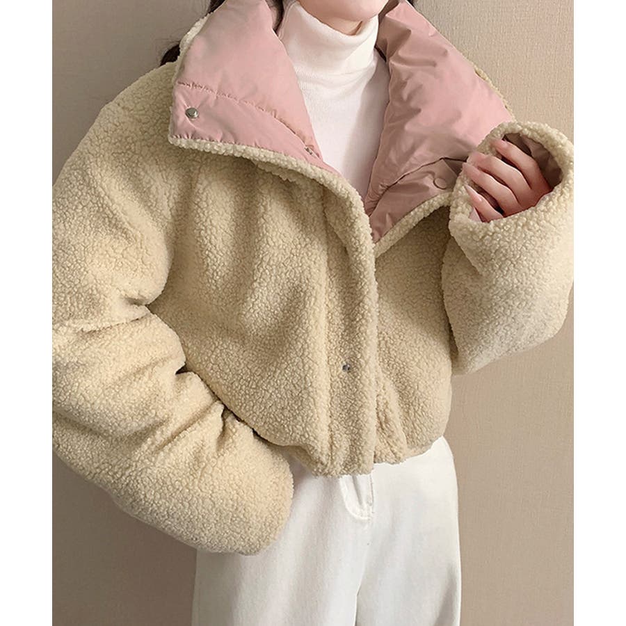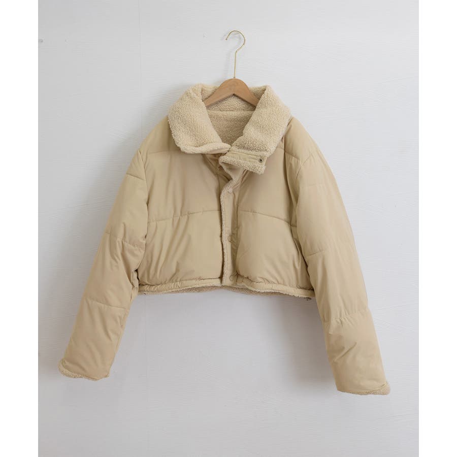 シンプルで洗練されたデザインと、ふわふわのボア素材が魅力のリバーシブルジャケット。