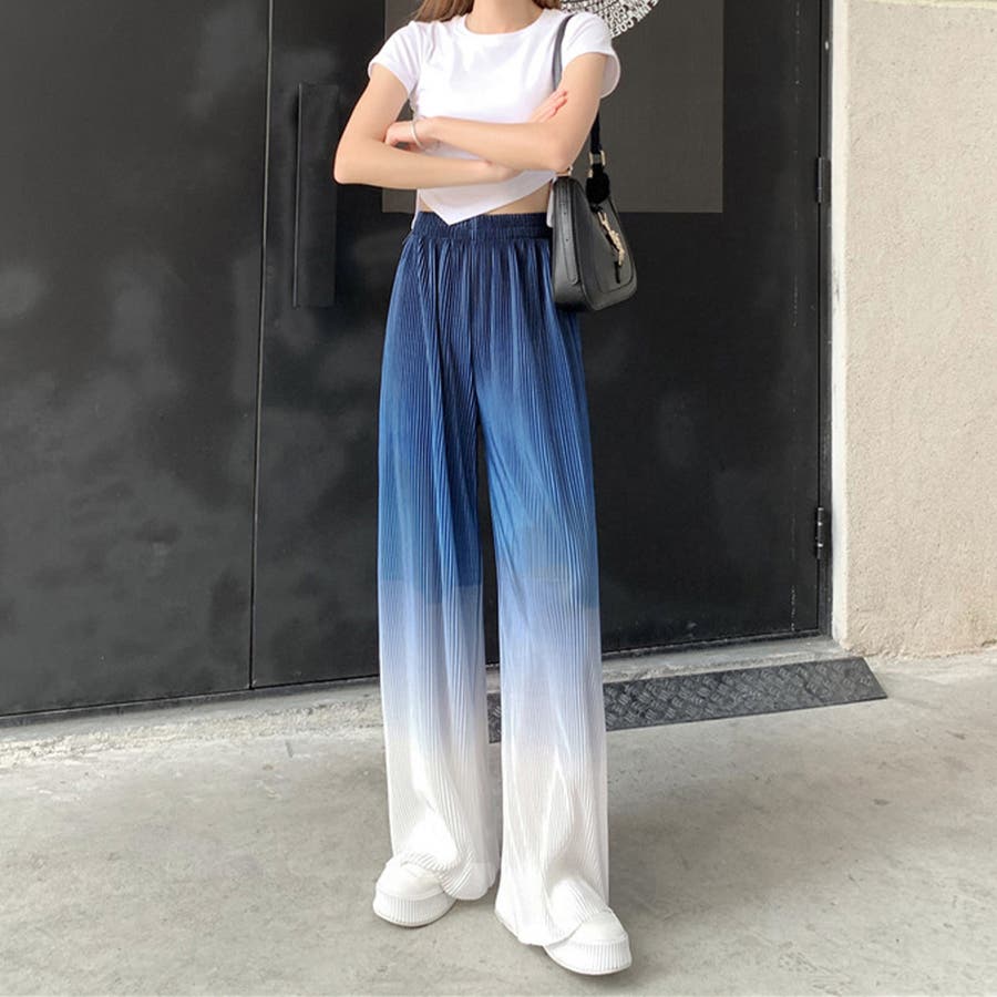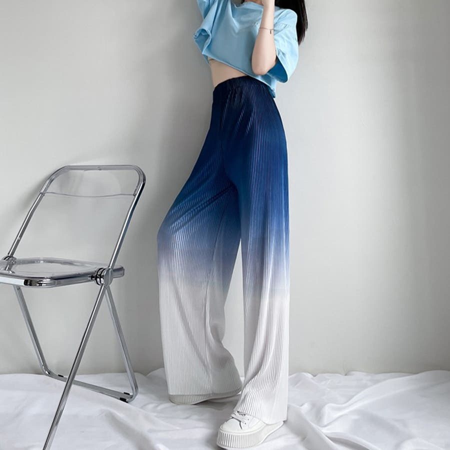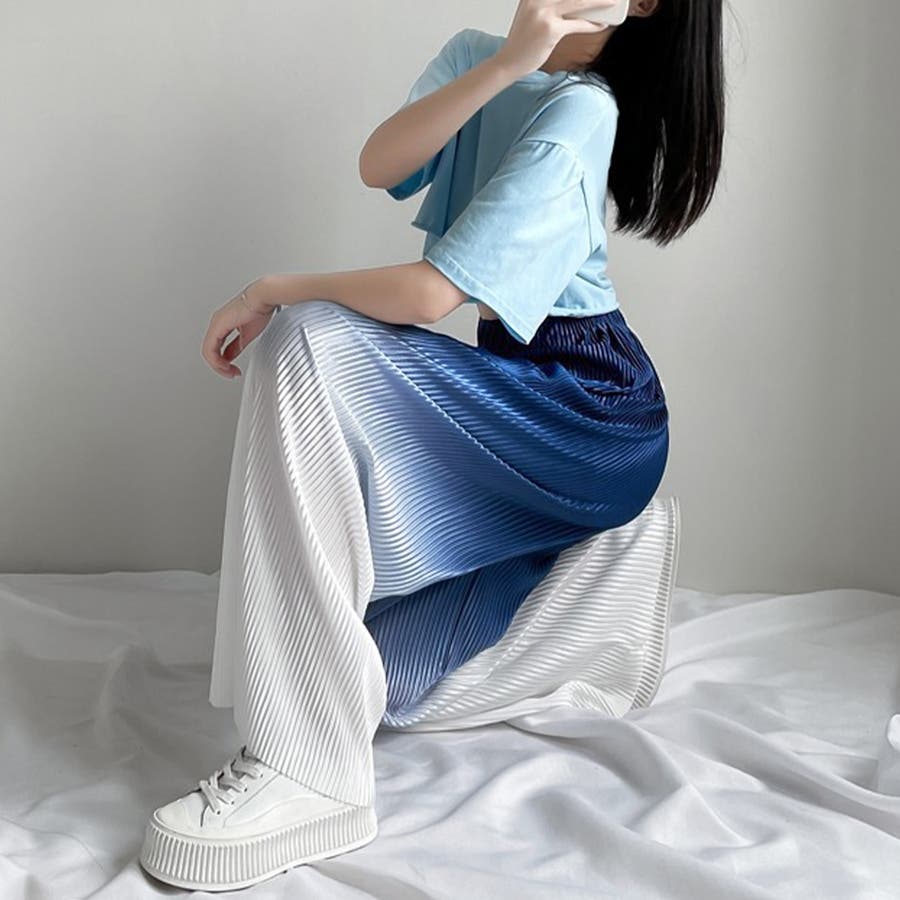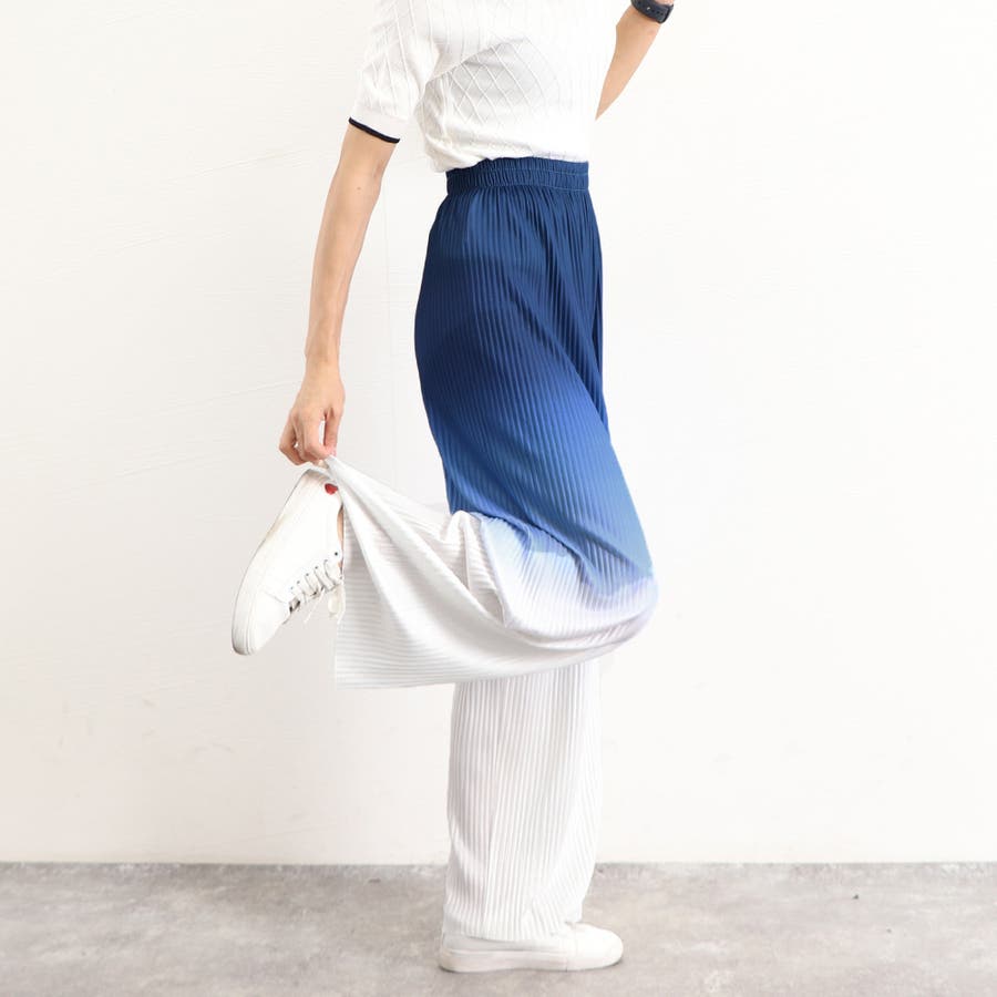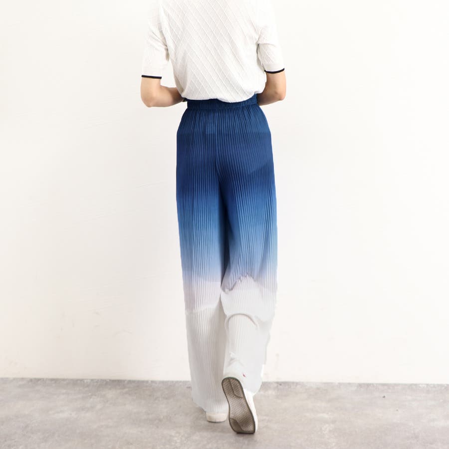 鮮やかなグラデーションカラーがコーディネートに華やかさを与えるプリーツワイドパンツ