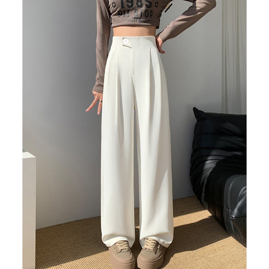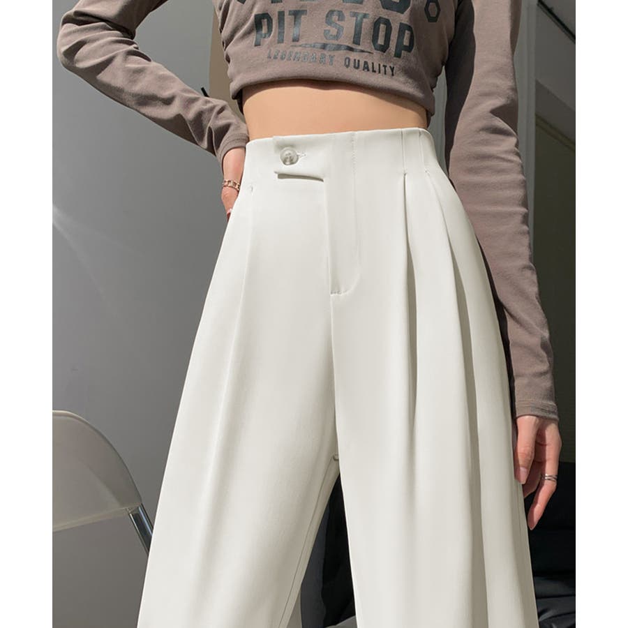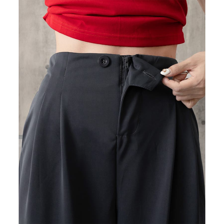 ウエストボタンのディテールが目を引く、立体的なシルエットが美しいハイウエストのタック入りスラックスパンツ。
