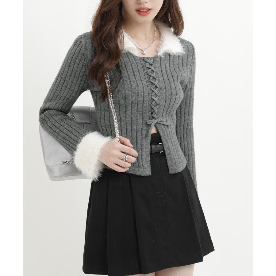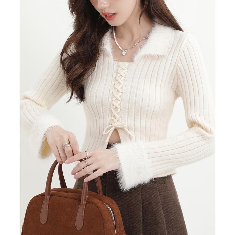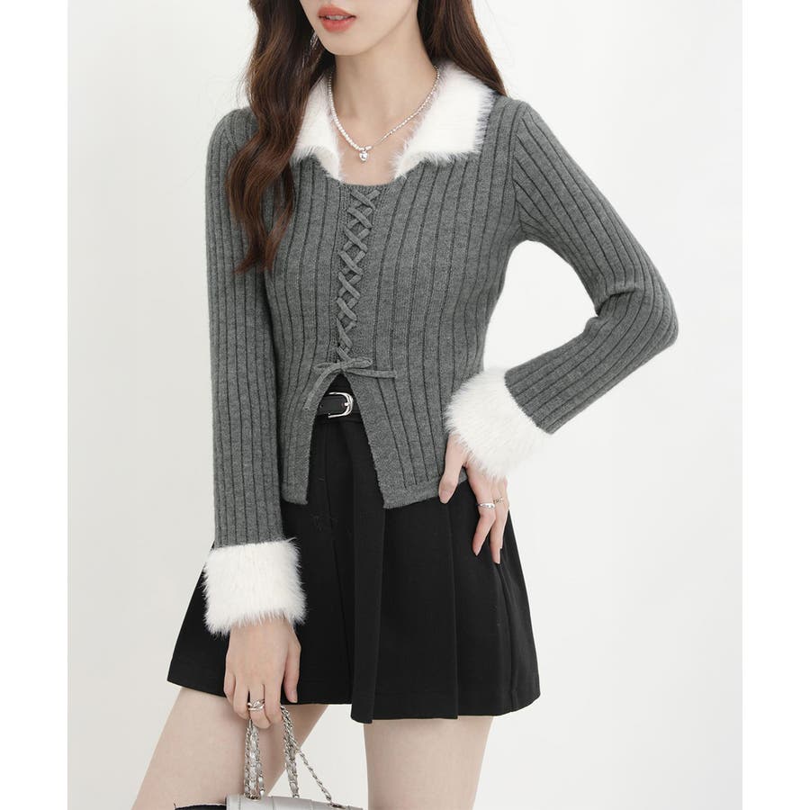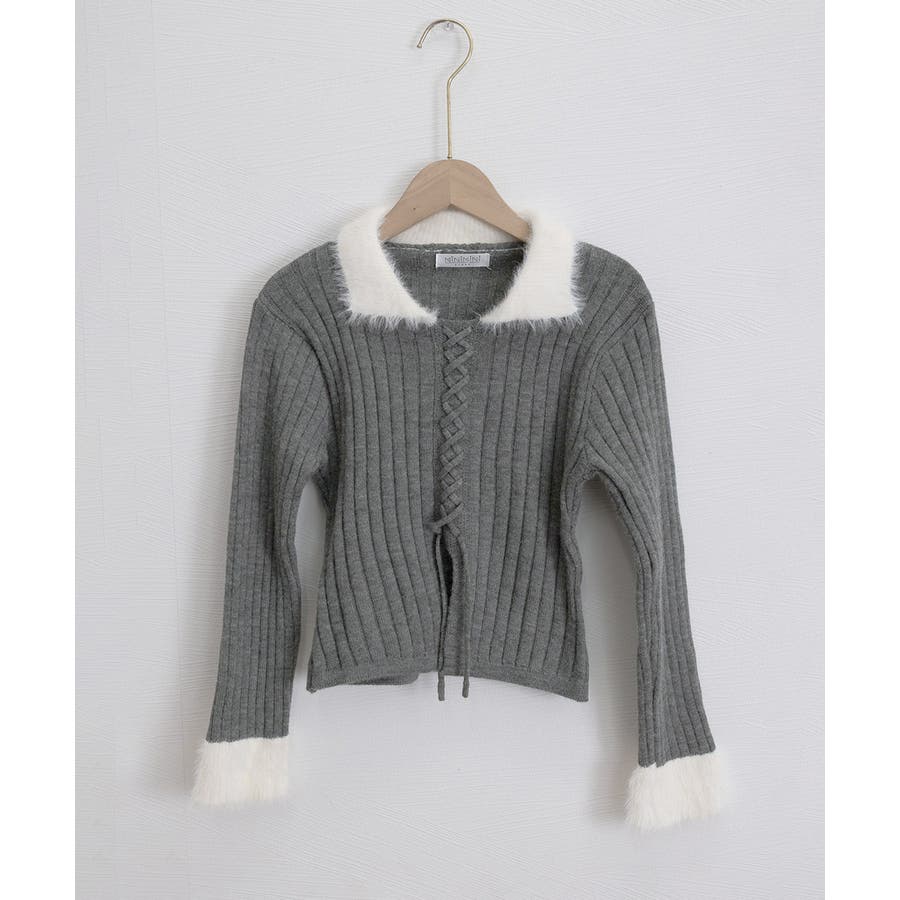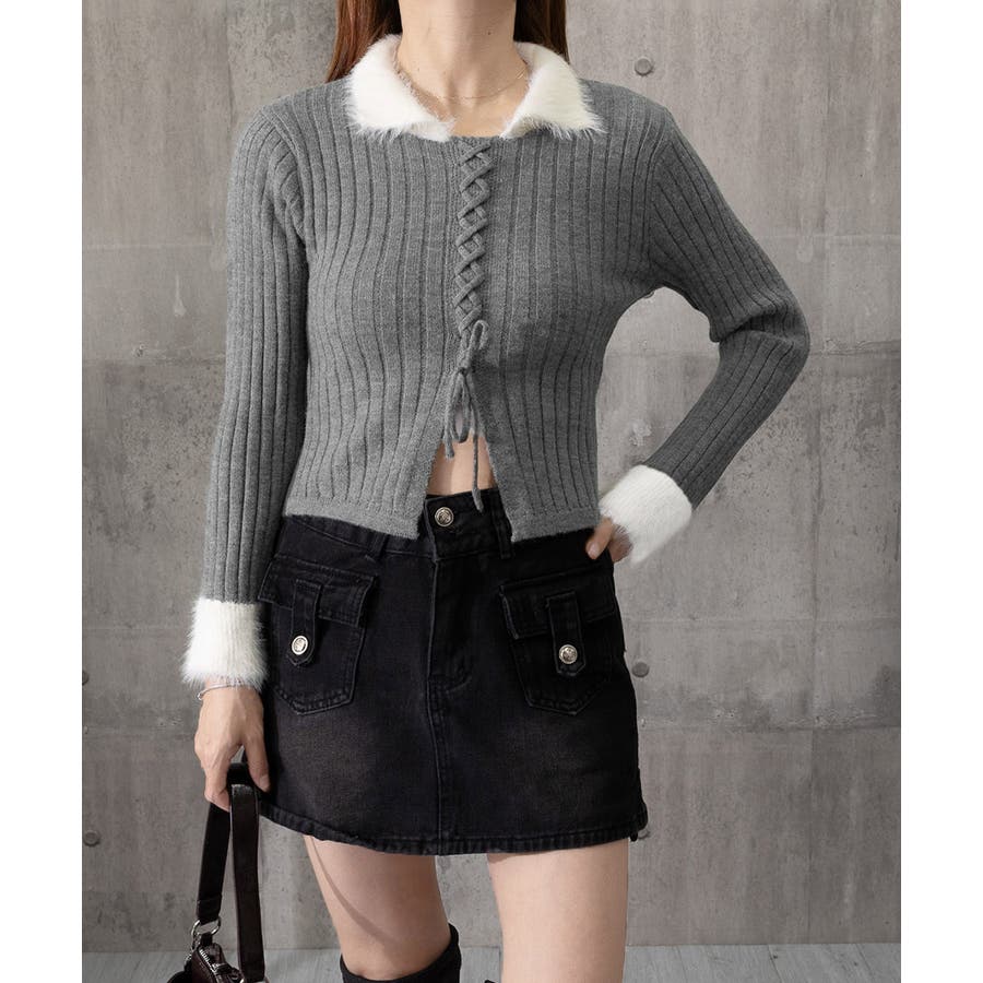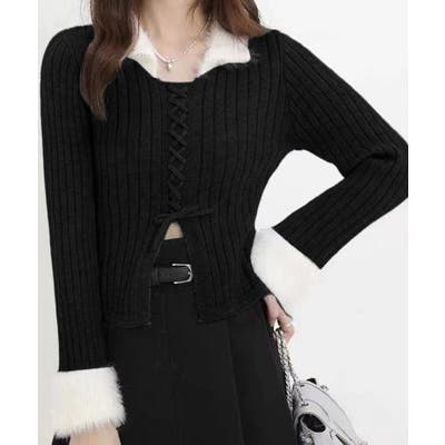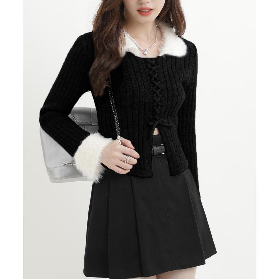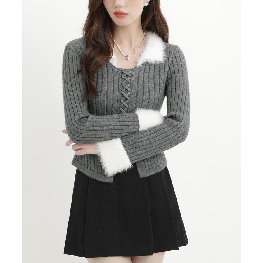 襟元と袖口にエコファーをあしらった、フロントレースアップのリブニットセーター。