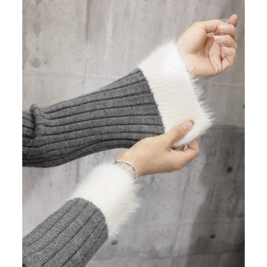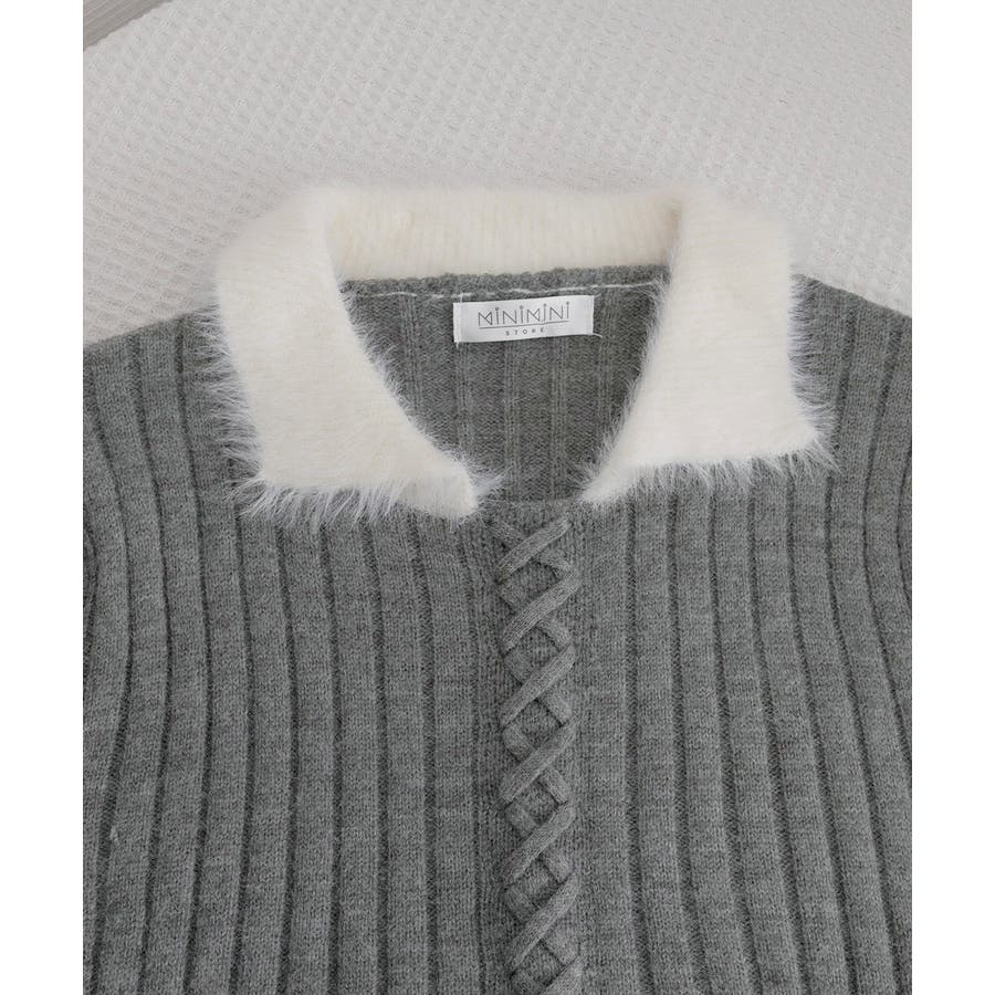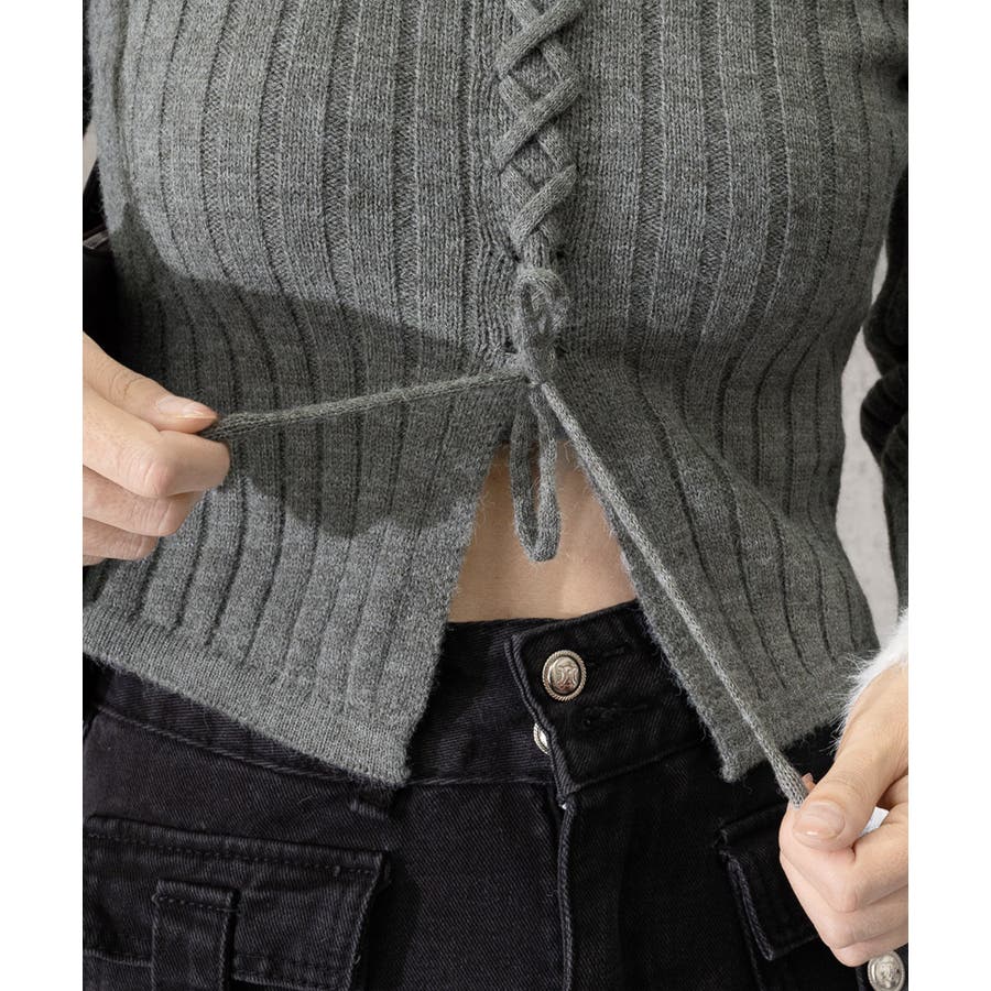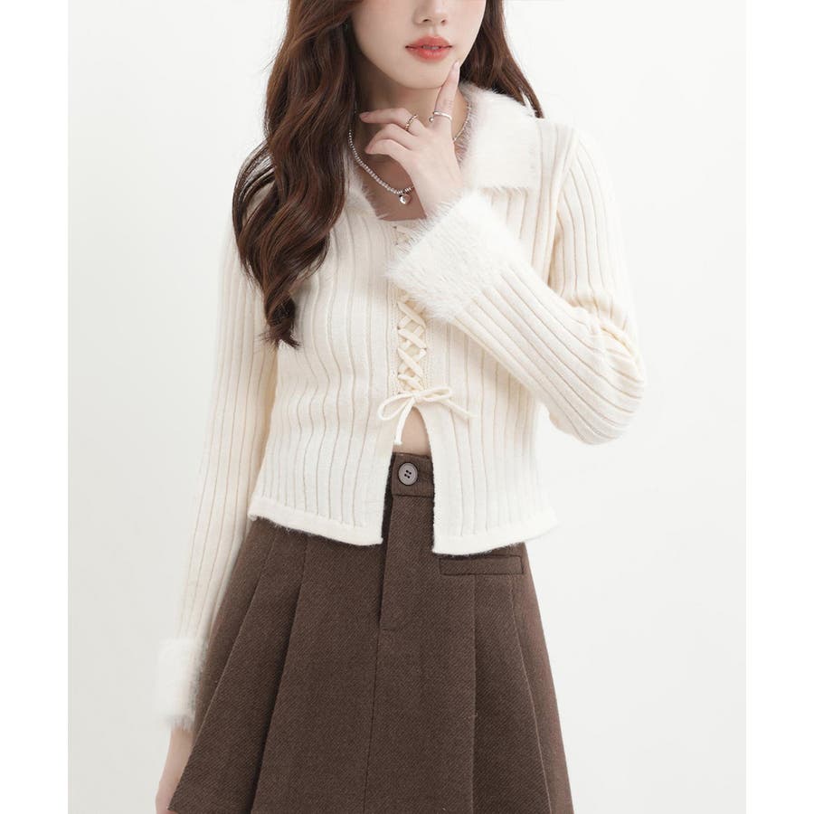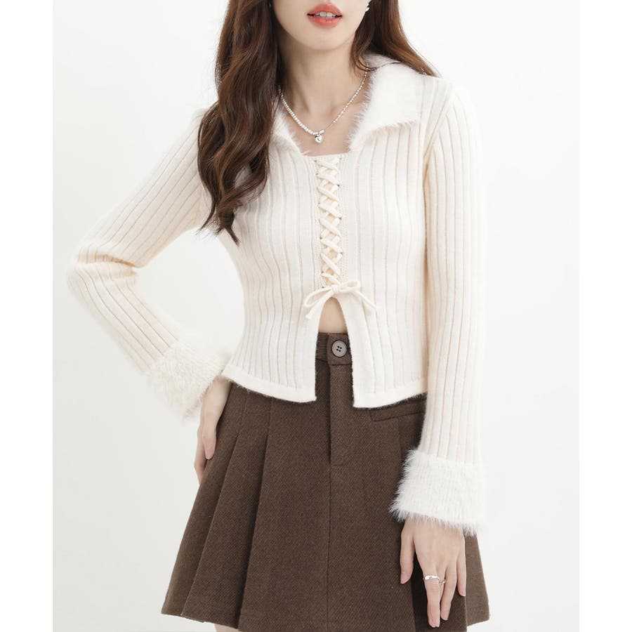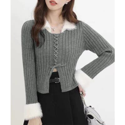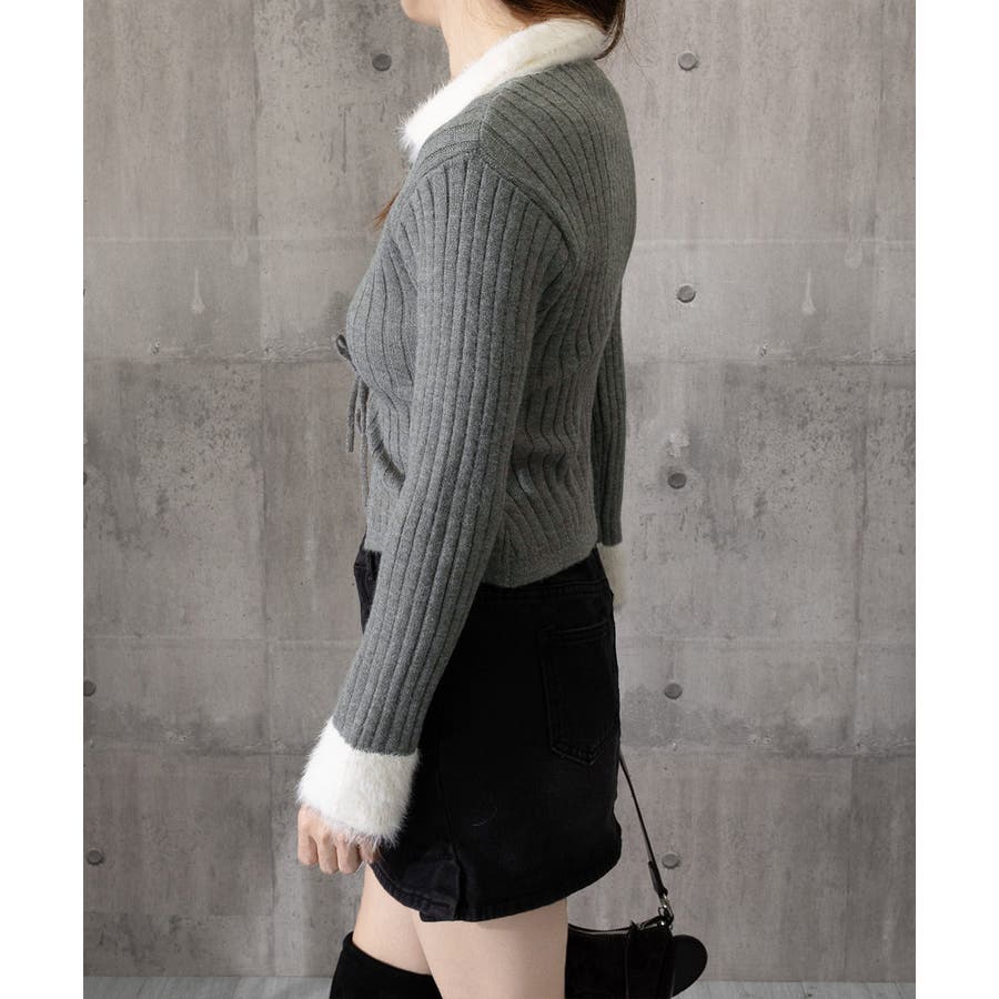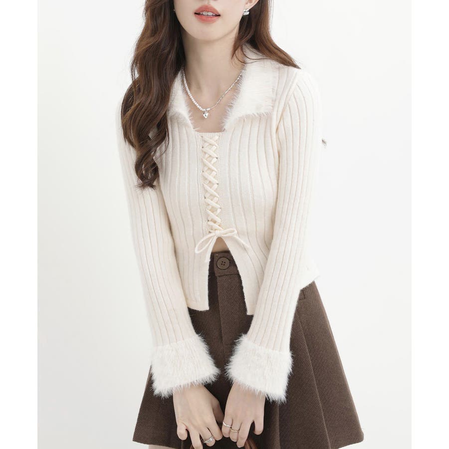 襟元と袖口にエコファーをあしらった、フロントレースアップのリブニットセーター。