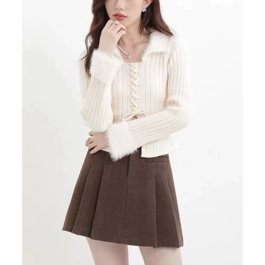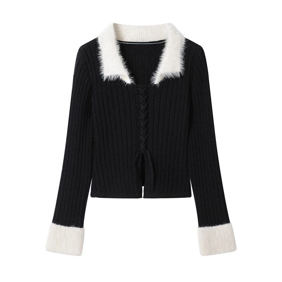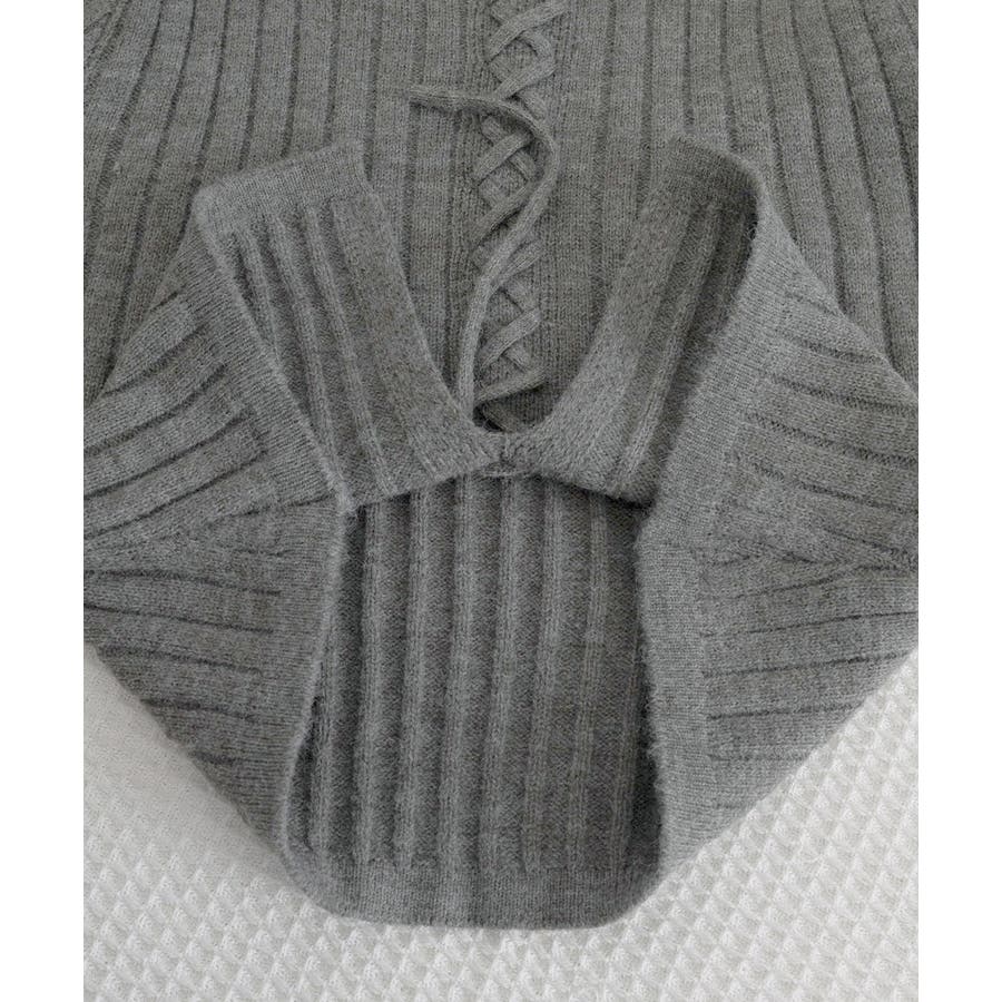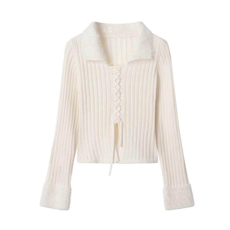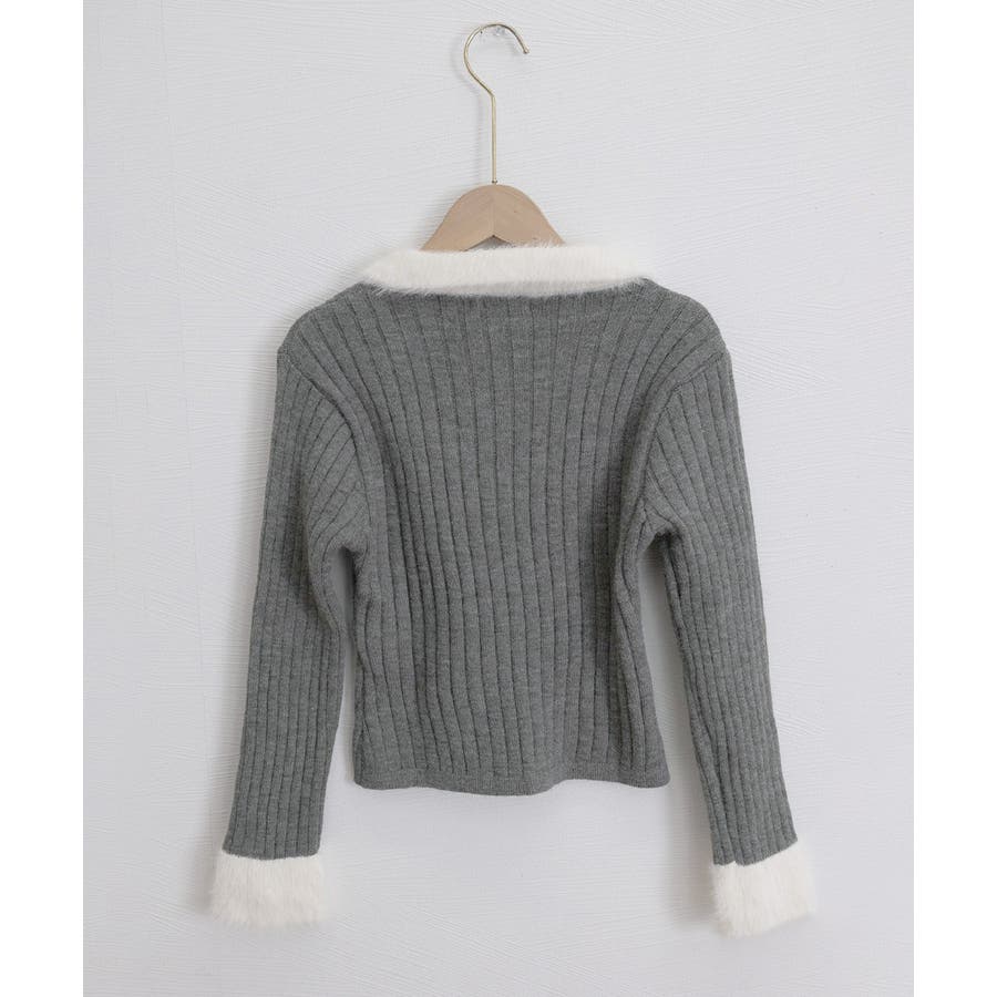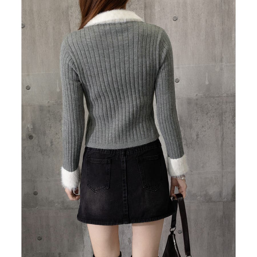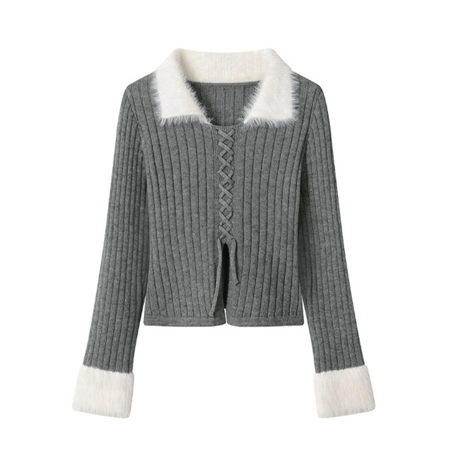 襟元と袖口にエコファーをあしらった、フロントレースアップのリブニットセーター。