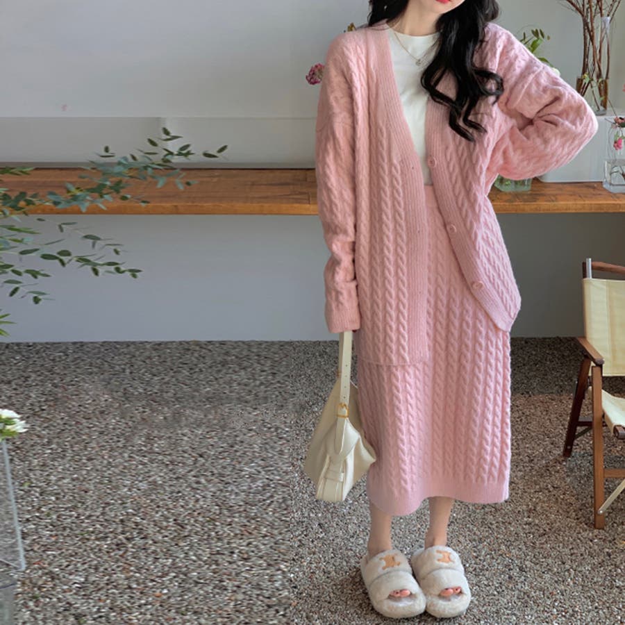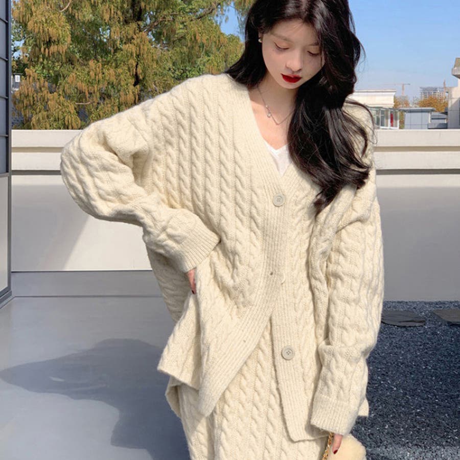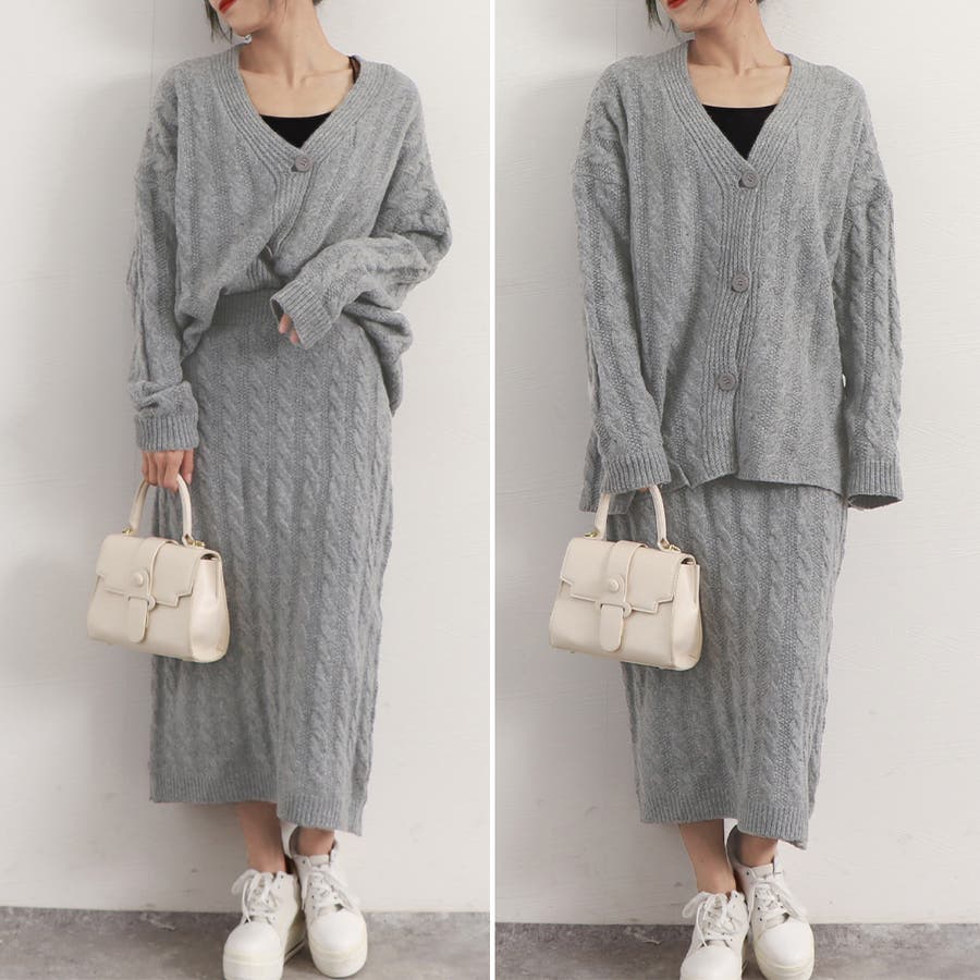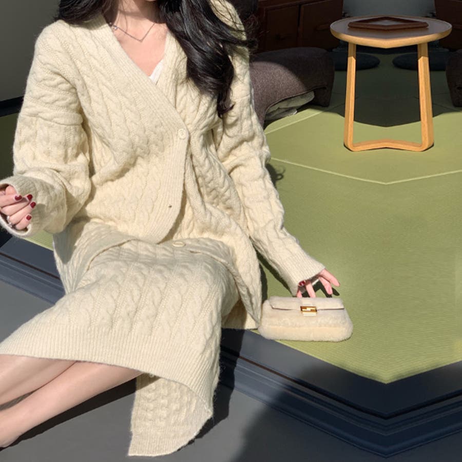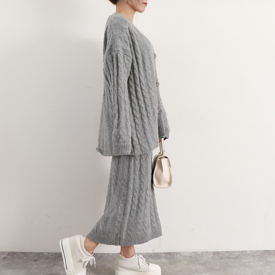 ゆったりラフに羽織れるカーディガンとニットスカートの上下セットアップ