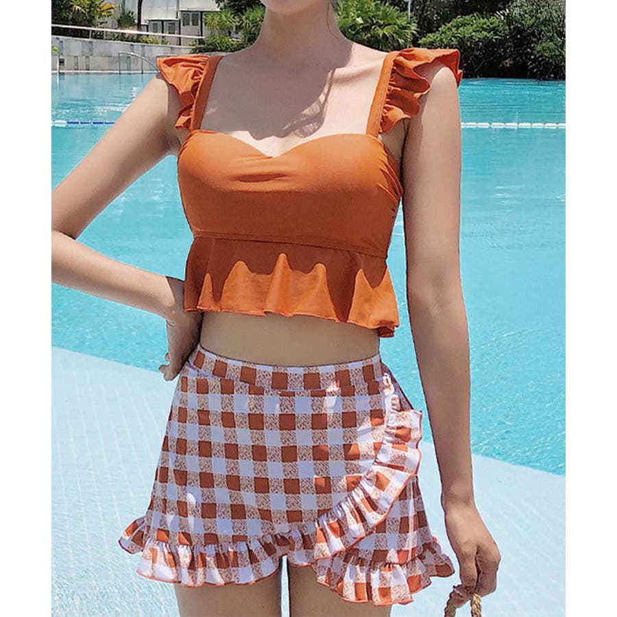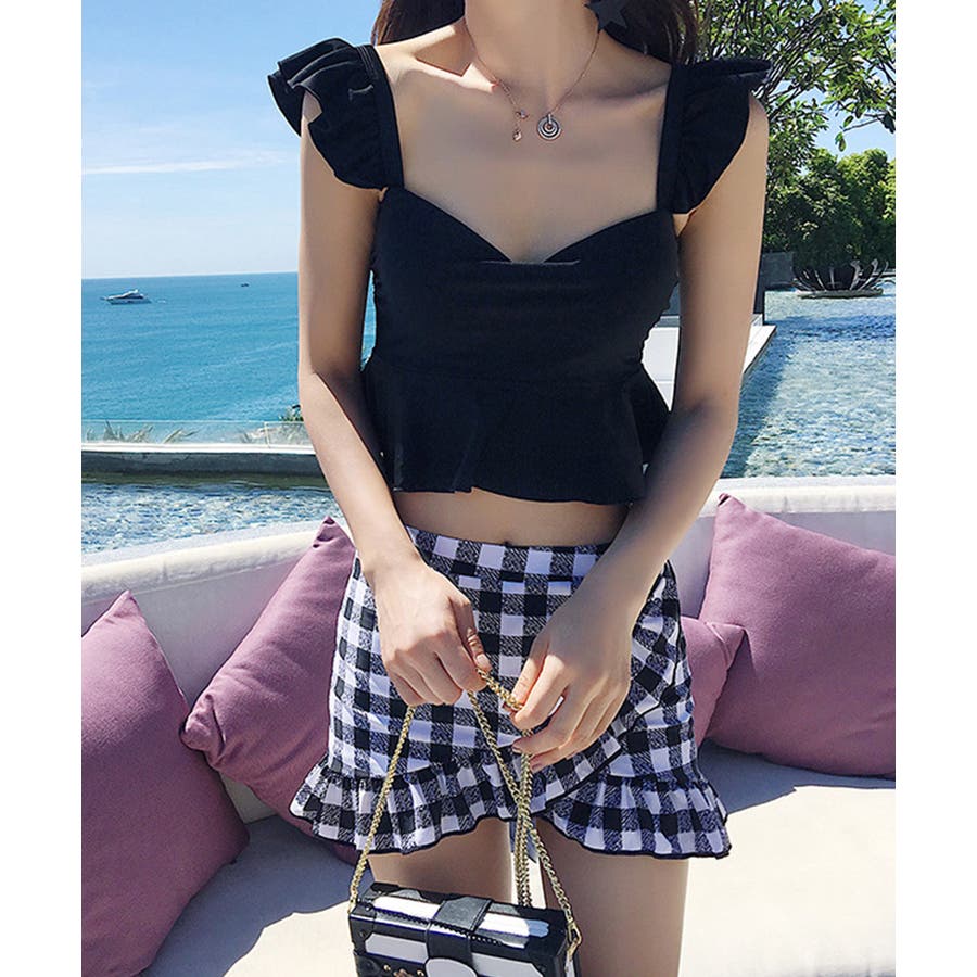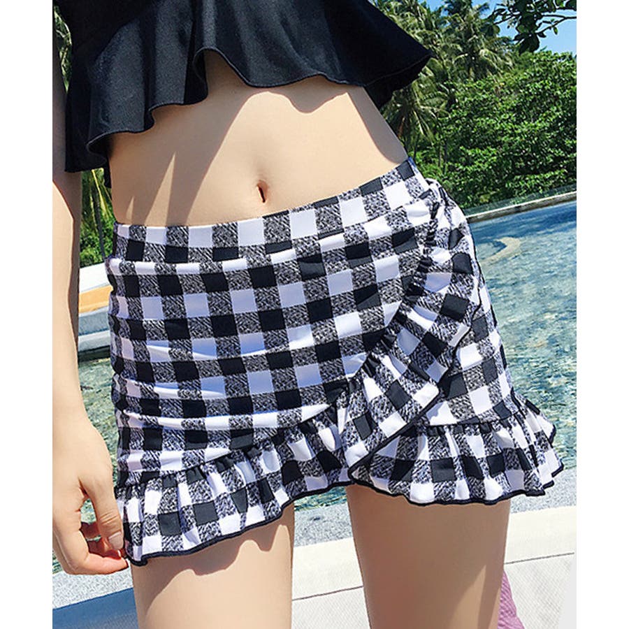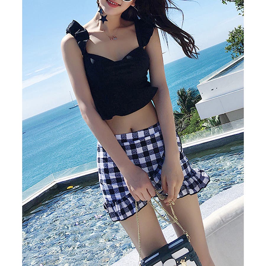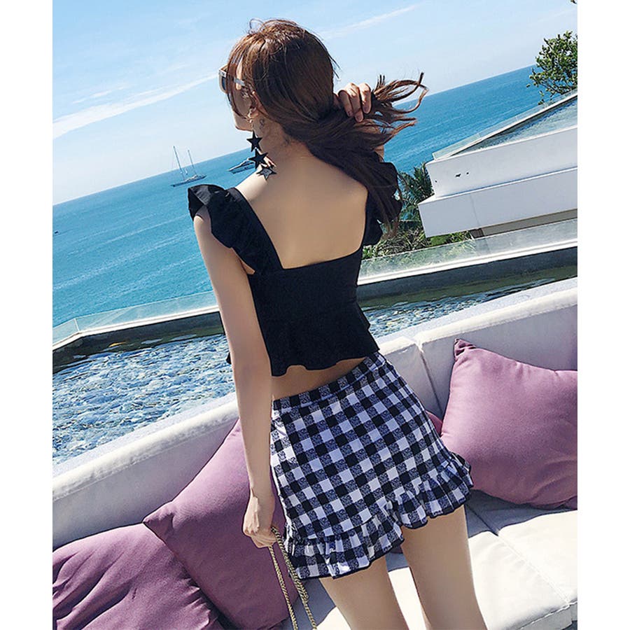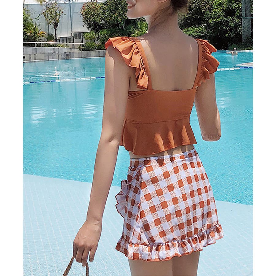 フリル付きギンガムチェック柄のかわいいセパレート水着。