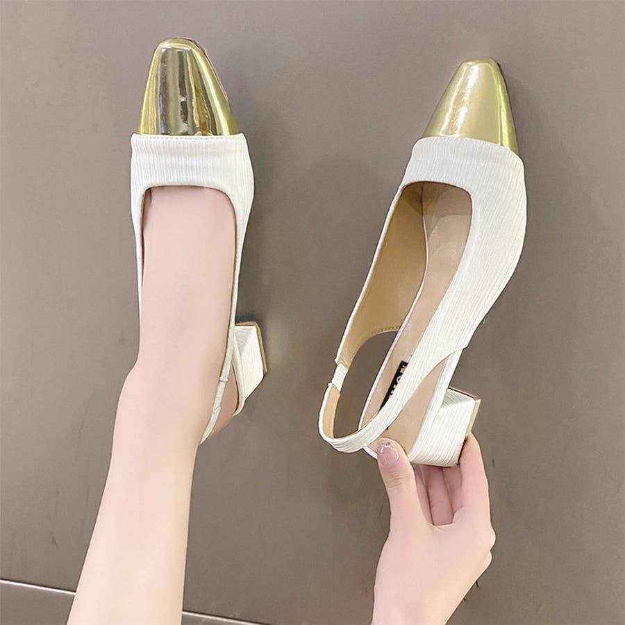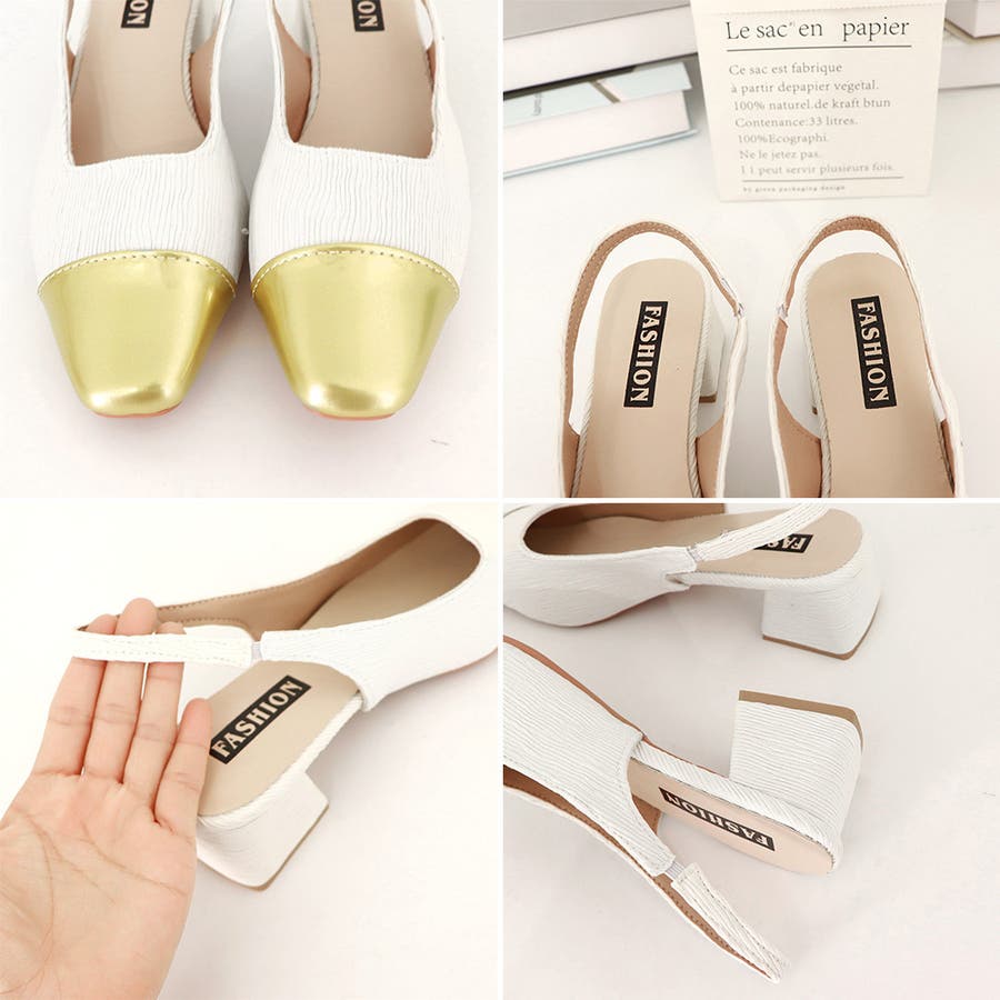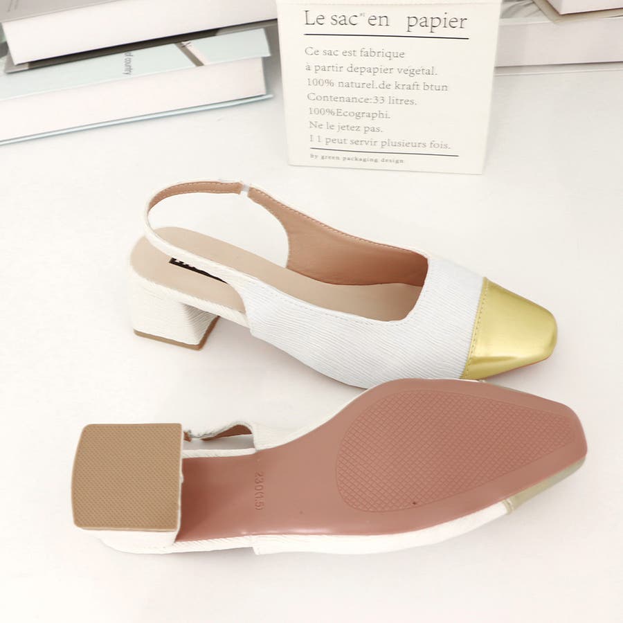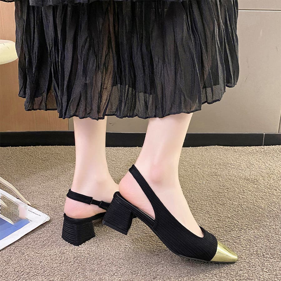 モダンで洗練された印象を与えるつま先切り替えデザインのバックストラップパンプスです