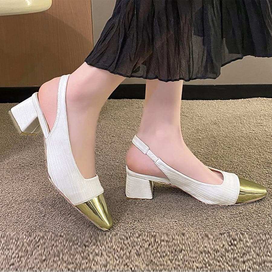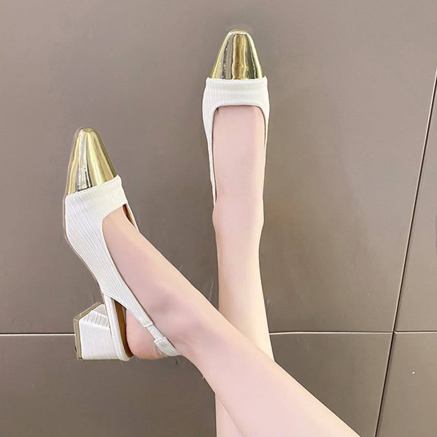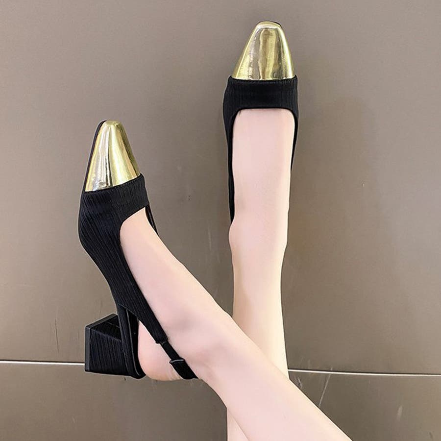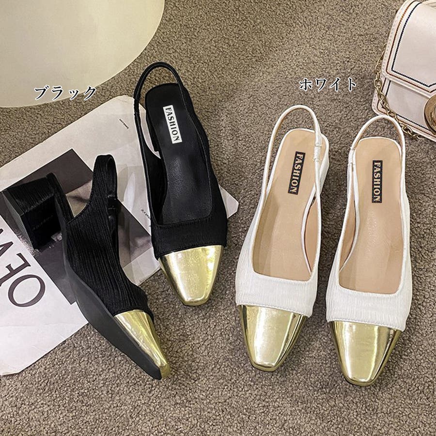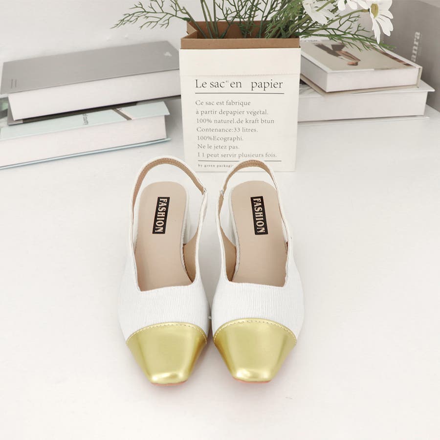 モダンで洗練された印象を与えるつま先切り替えデザインのバックストラップパンプスです