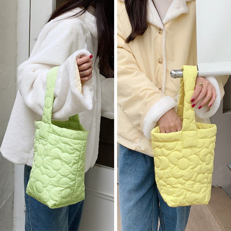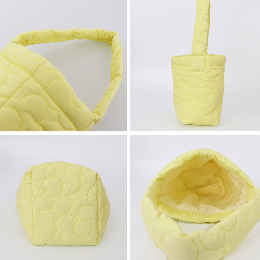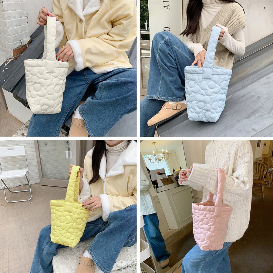ふんわり柔らかく軽いキルティング生地に花柄ステッチを加えたオトナガーリーなパステルカラートートバッグ