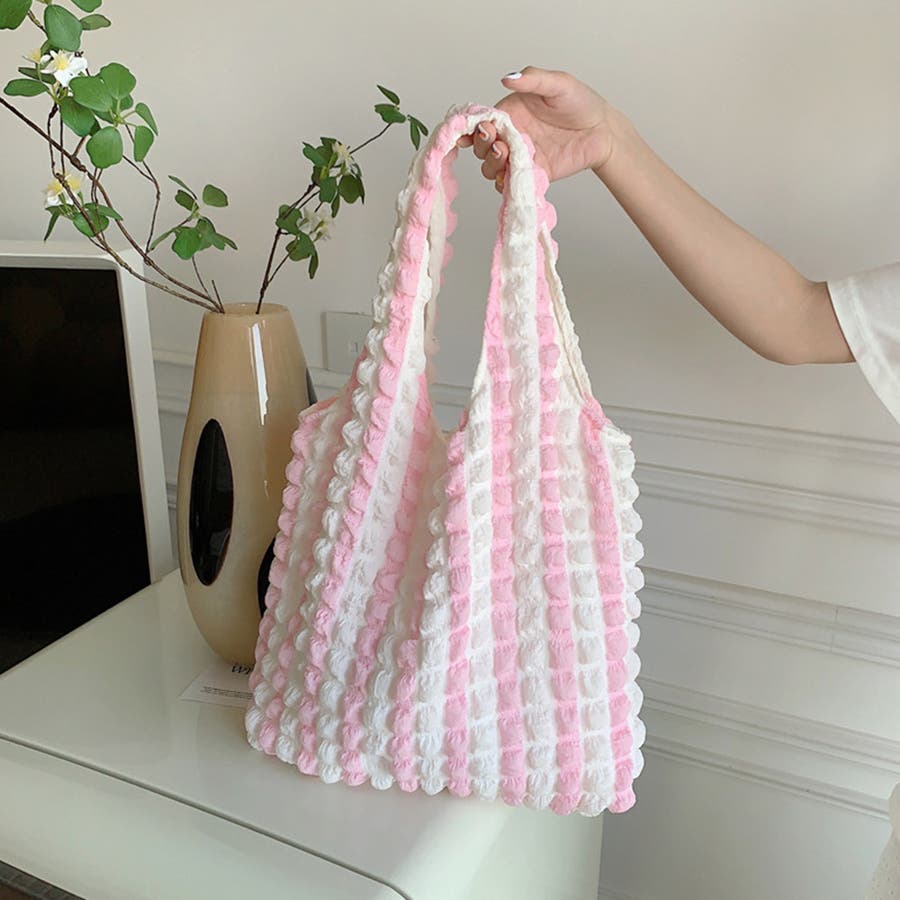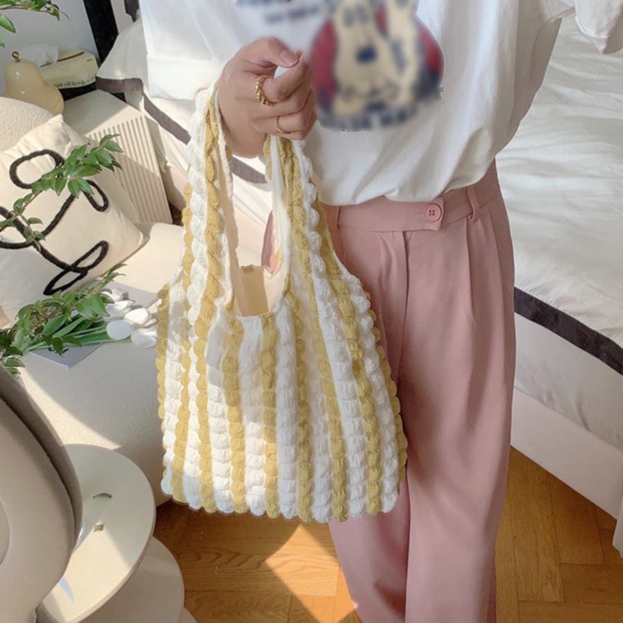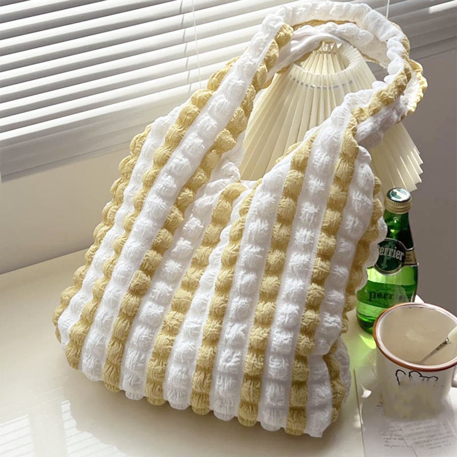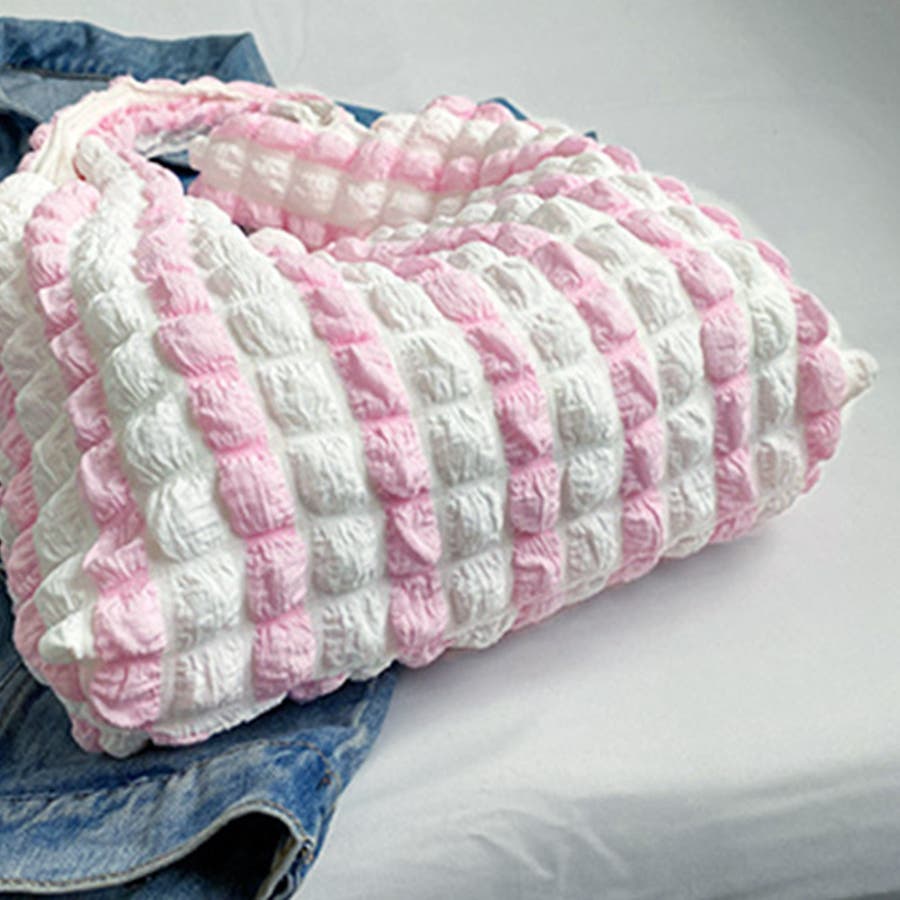 トレンドのポップコーン生地がおしゃれ♪大容量配色ハンドバッグ