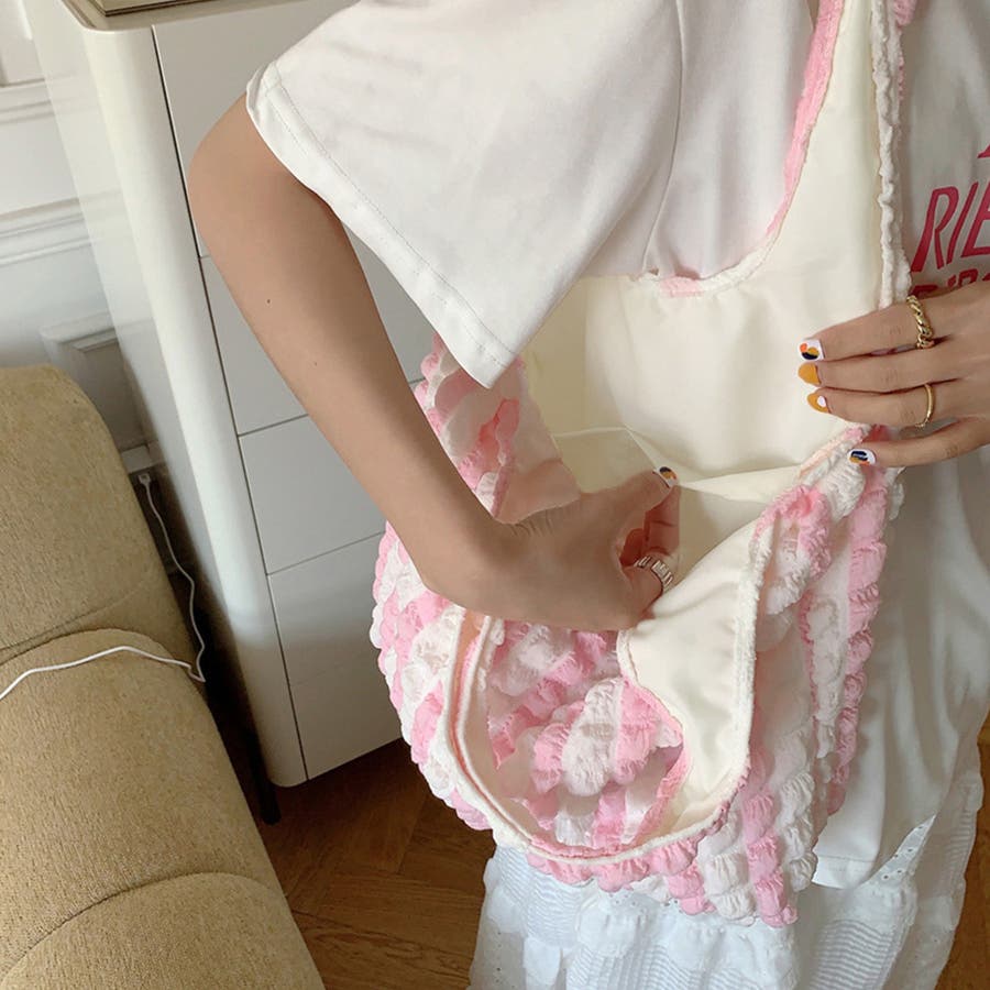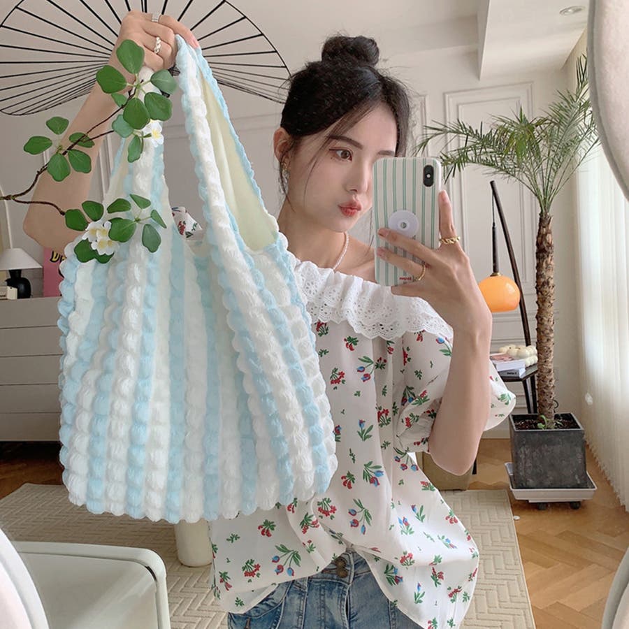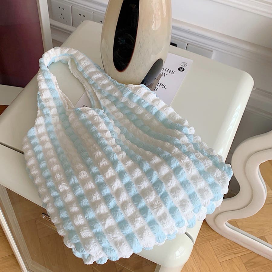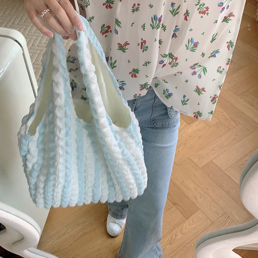 トレンドのポップコーン生地がおしゃれ♪大容量配色ハンドバッグ