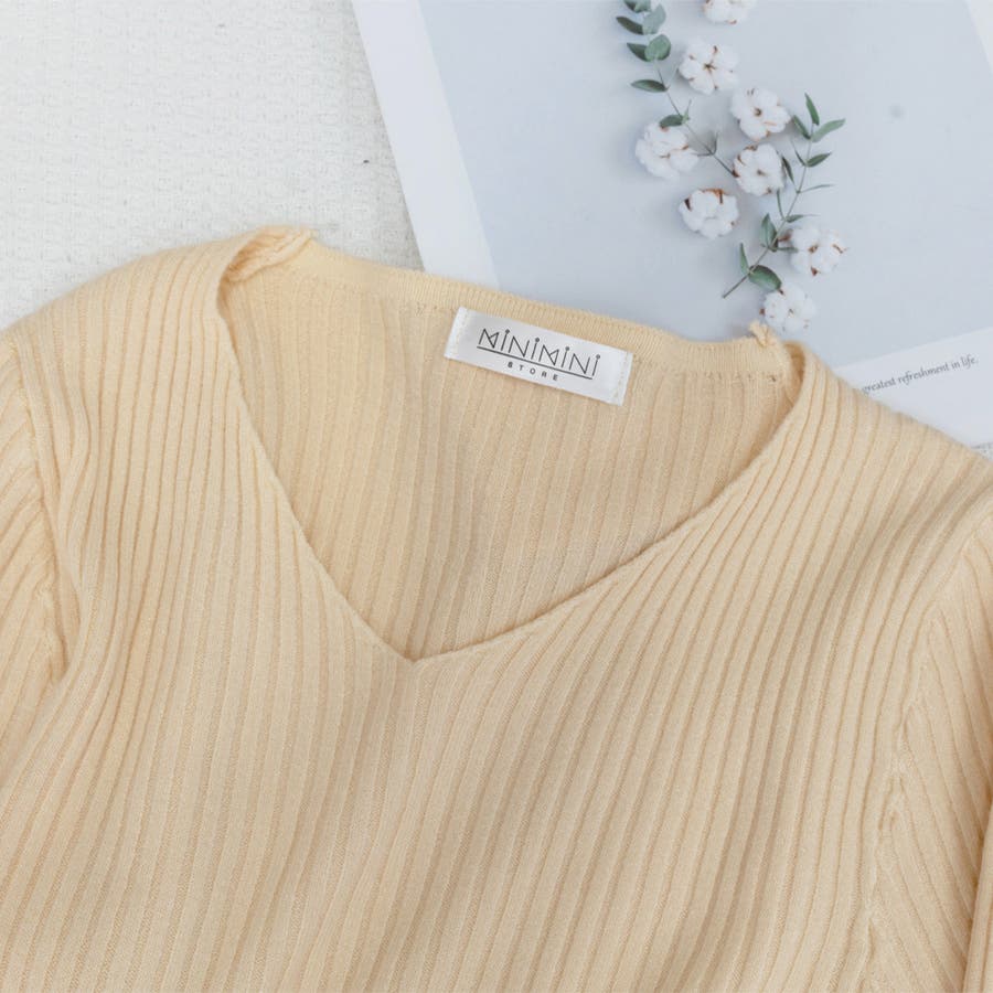 程よい深さのVネックデザイン、デコルテ周りをスッキリ見せ、上品で清楚な印象を与えてくれる