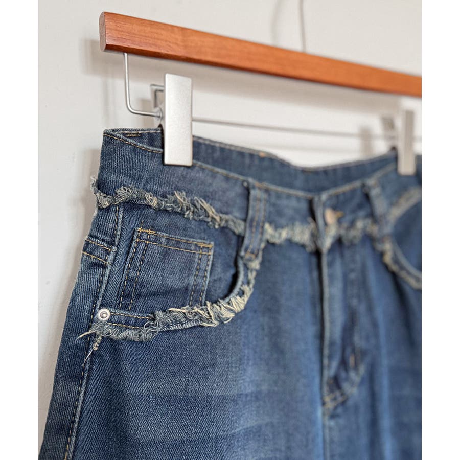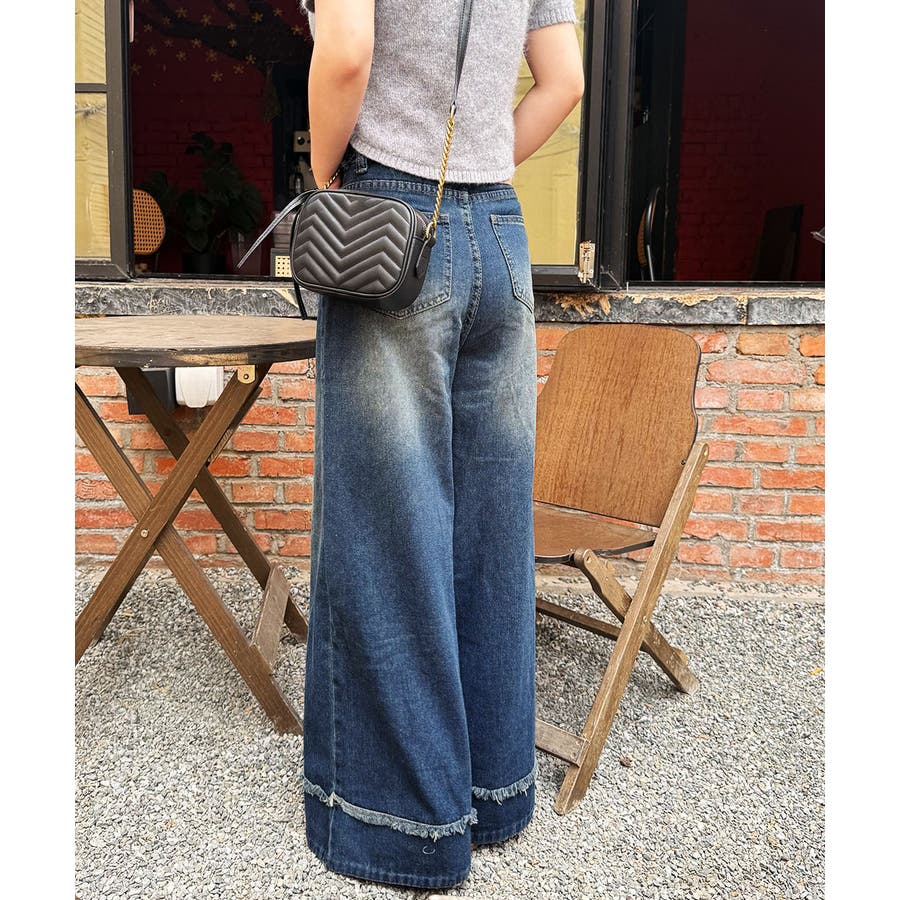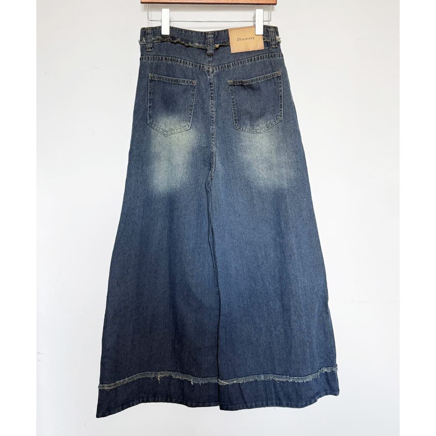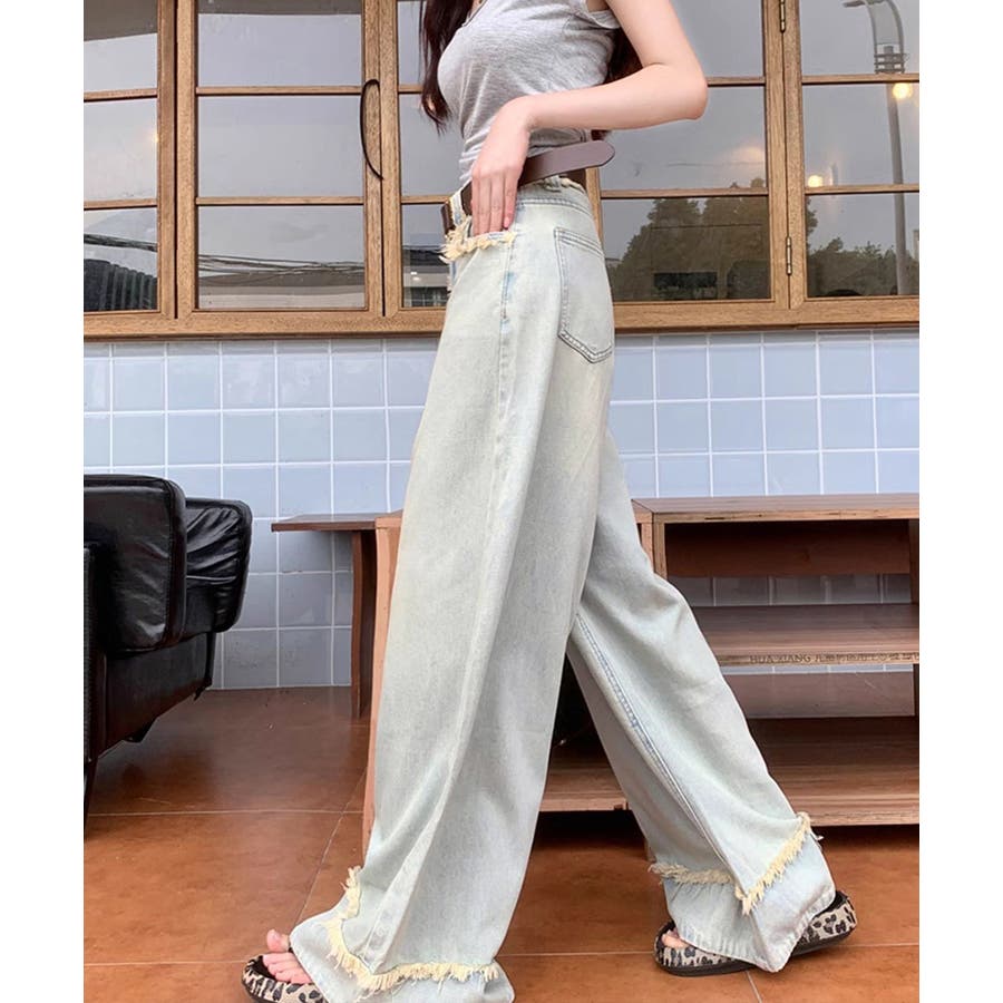 フリンジ裾デザインがアクセントになったワイドデニムパンツ。