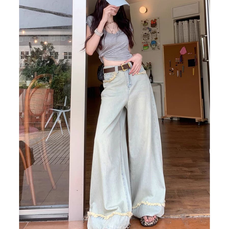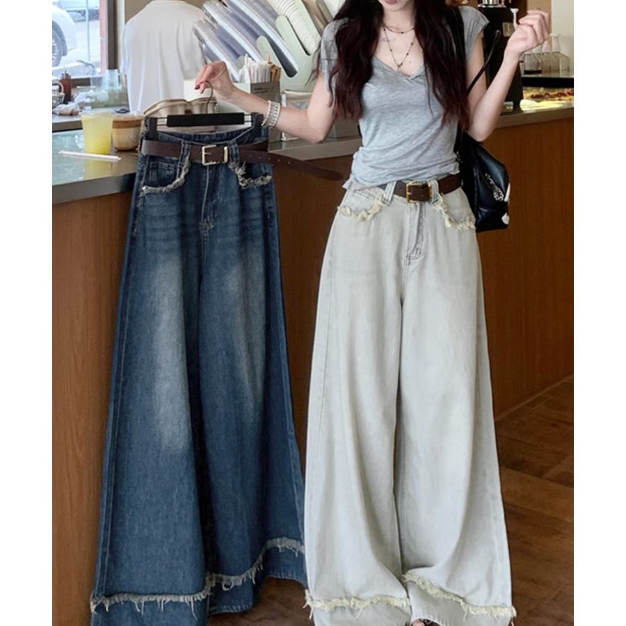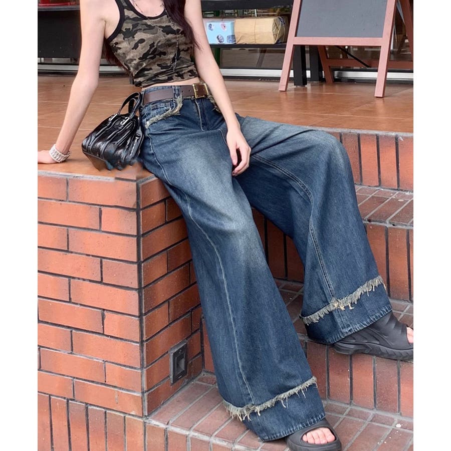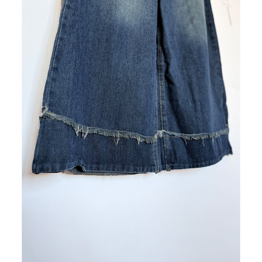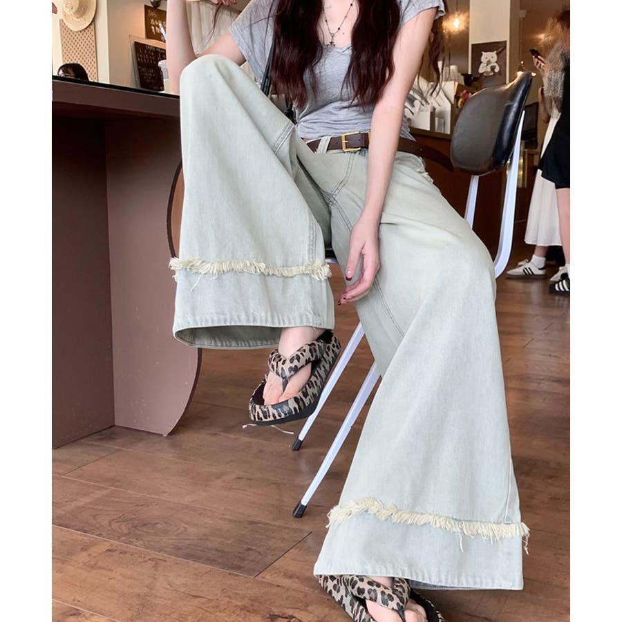 フリンジ裾デザインがアクセントになったワイドデニムパンツ。