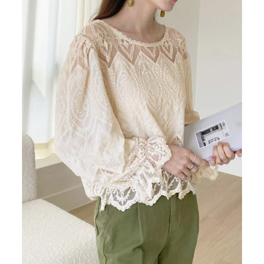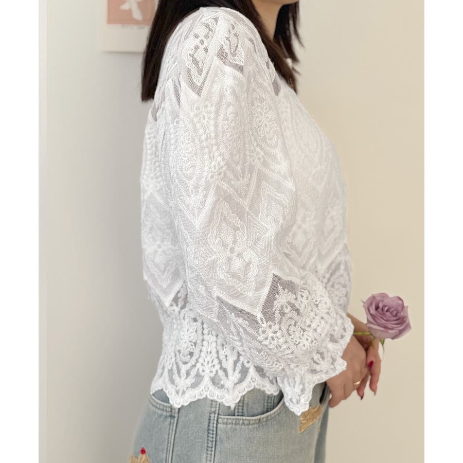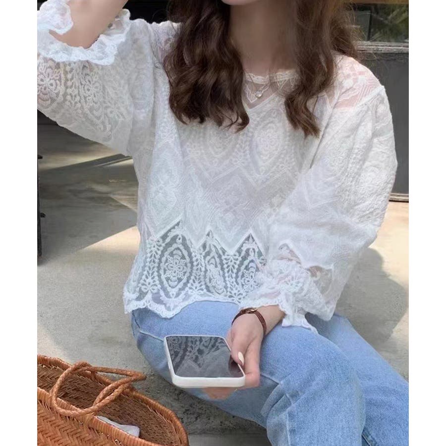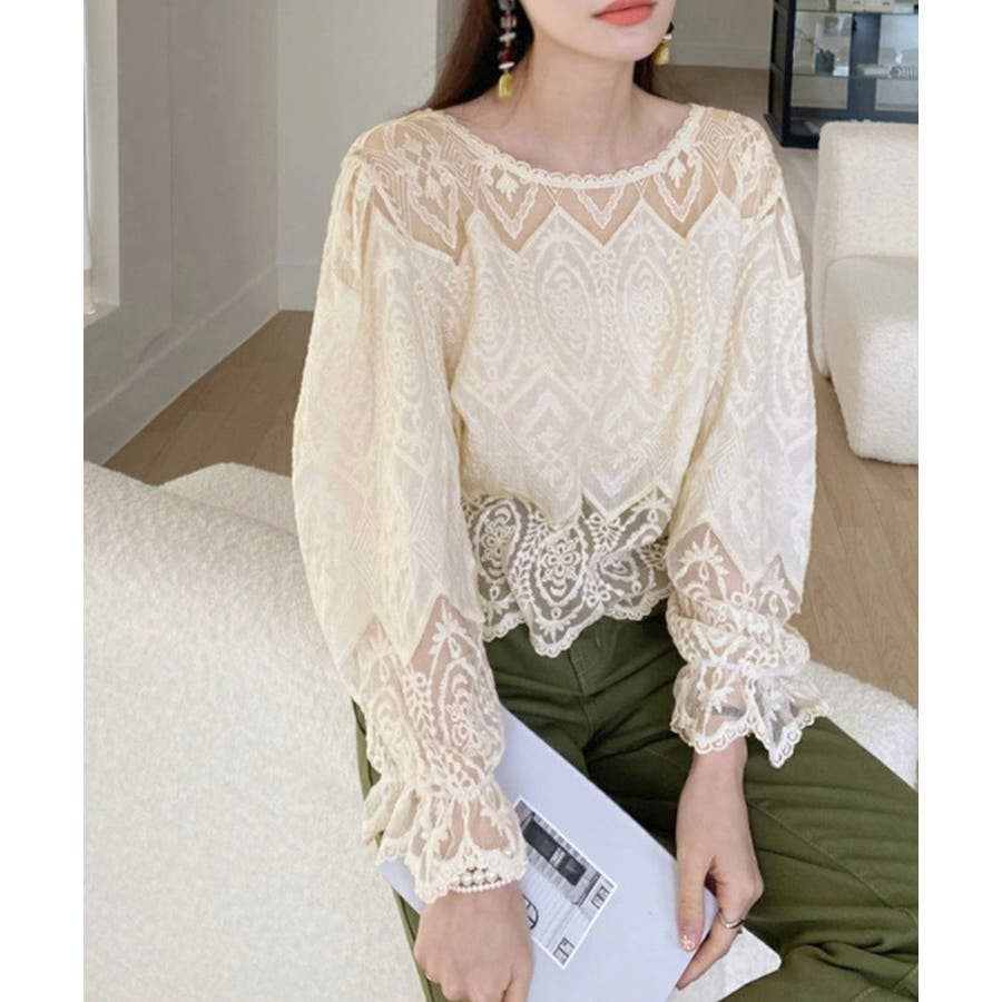 透け感のある洗練されたレースデザインが特徴的な長袖ブラウスです。