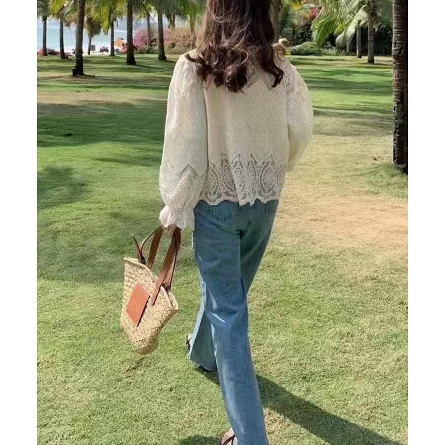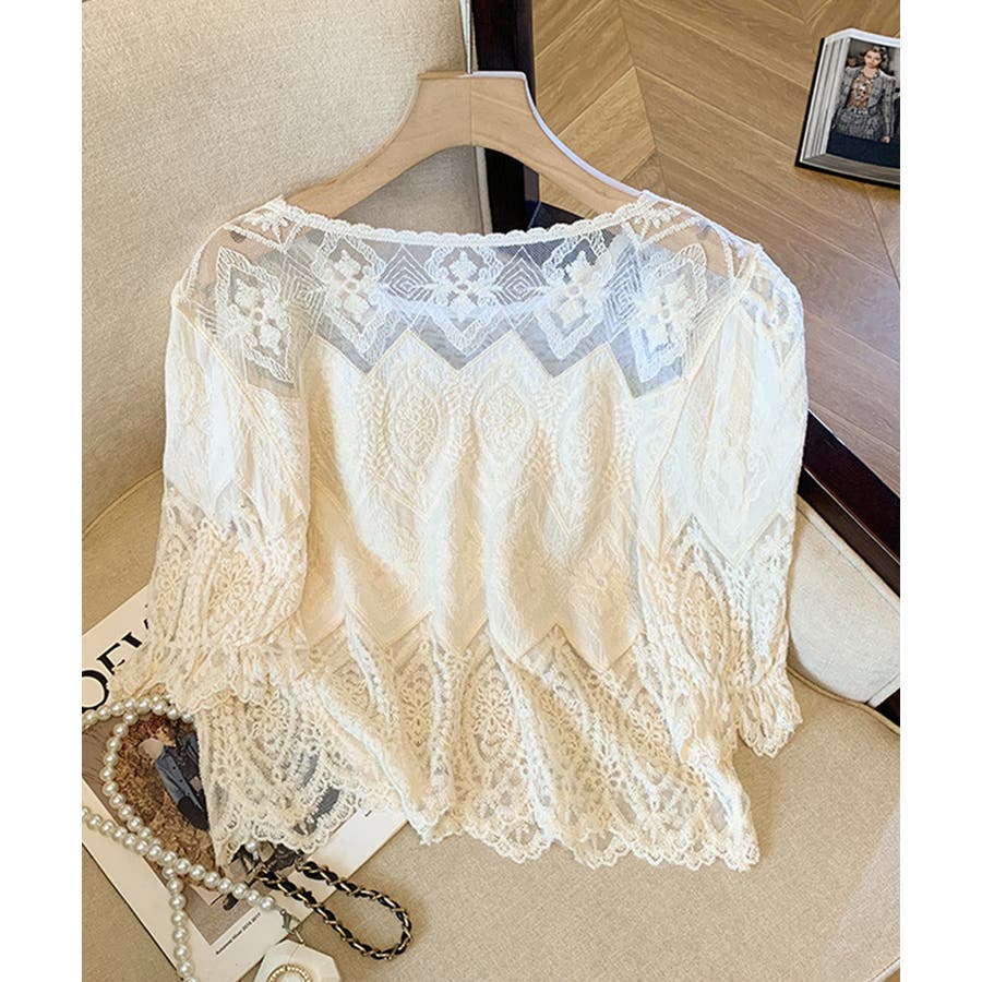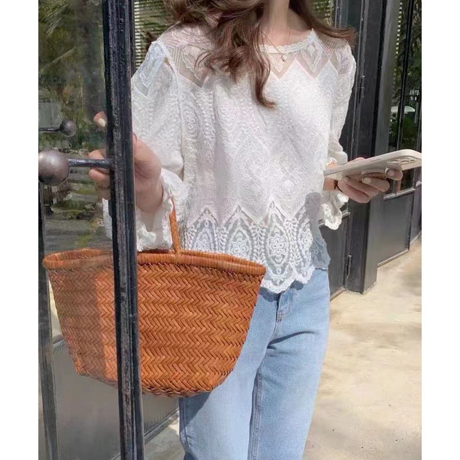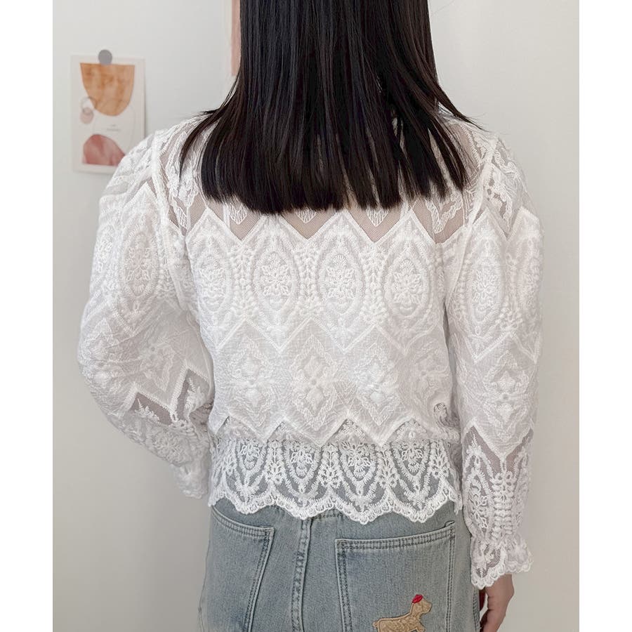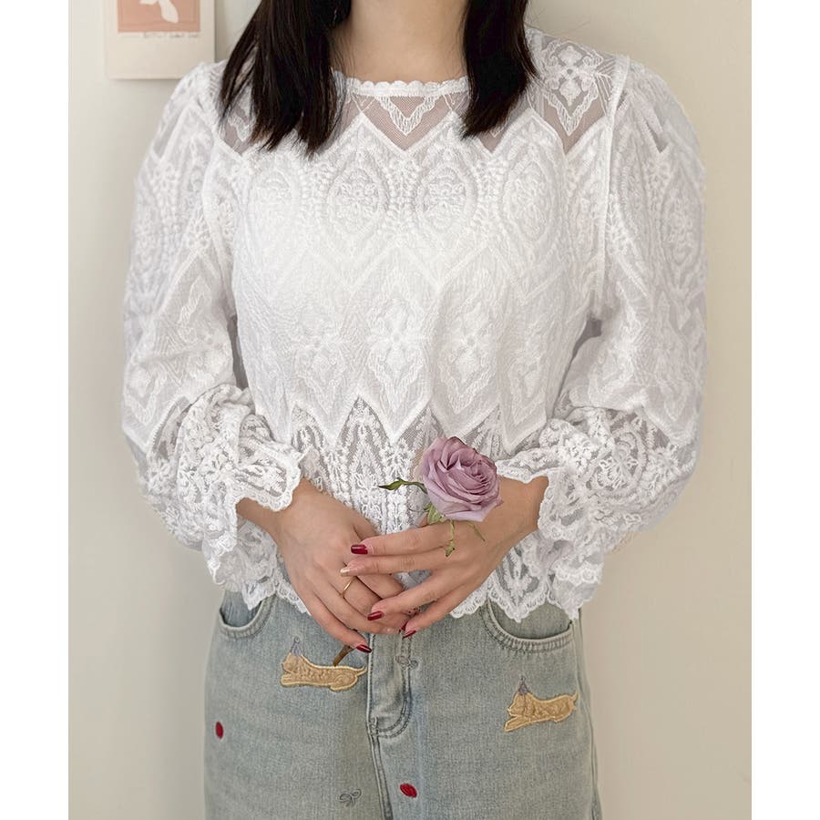 透け感のある洗練されたレースデザインが特徴的な長袖ブラウスです。