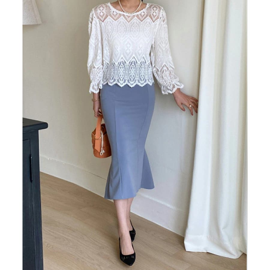 袖のボリューム感と裾のスカラップレースが女性らしさを引き立て、上品で優雅な印象を与えます。