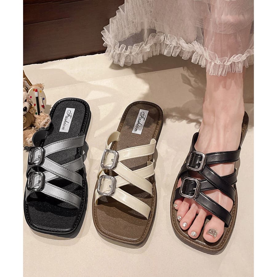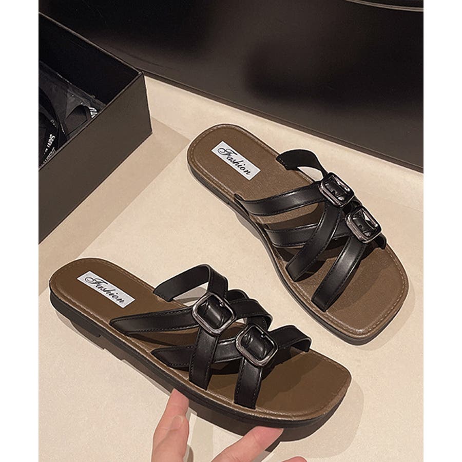 クロスデザインが目を引く、ダブルバックル仕様のフラットサンダル。