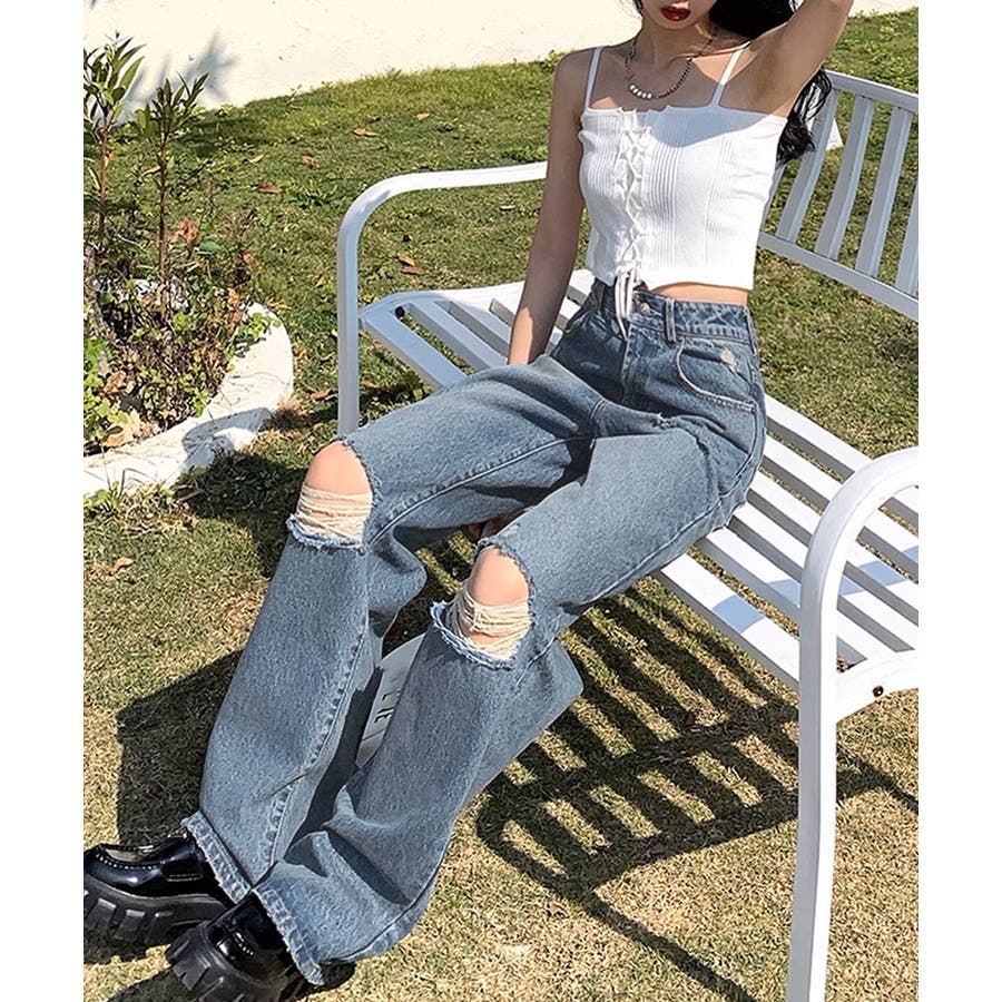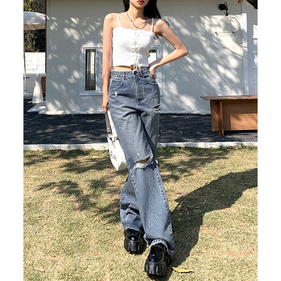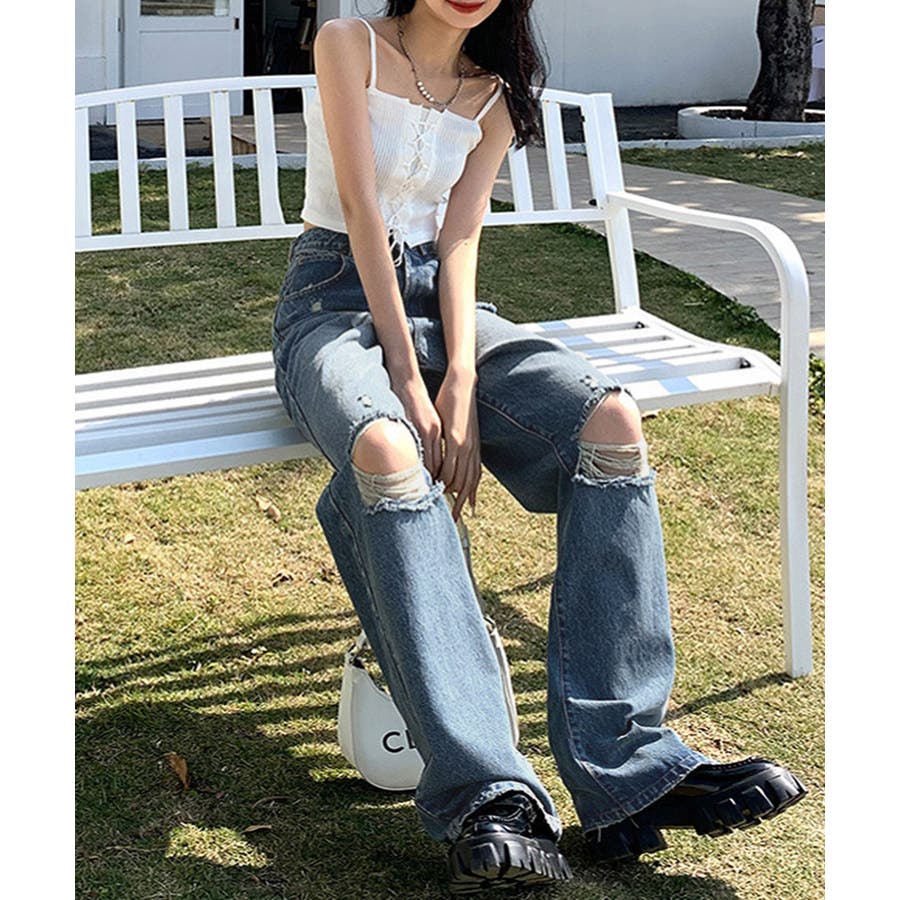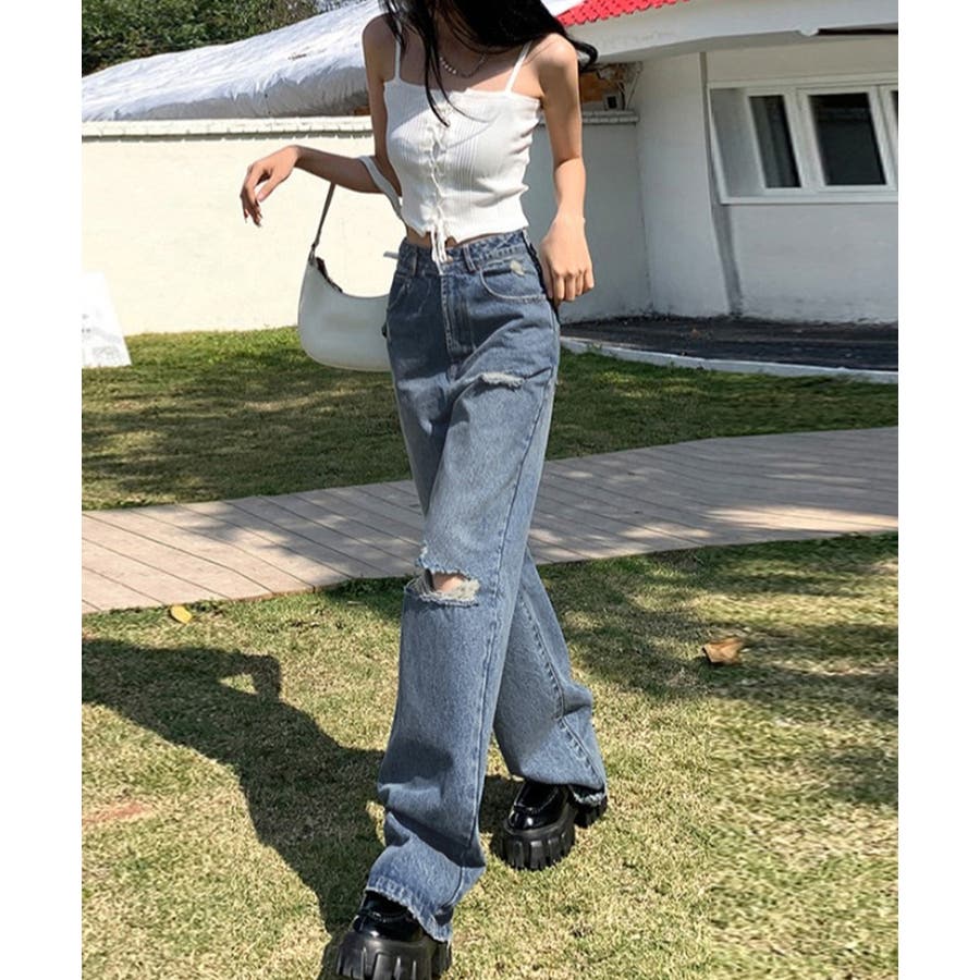 トレンド感溢れるダメージ加工が特徴のデニムストレートパンツ