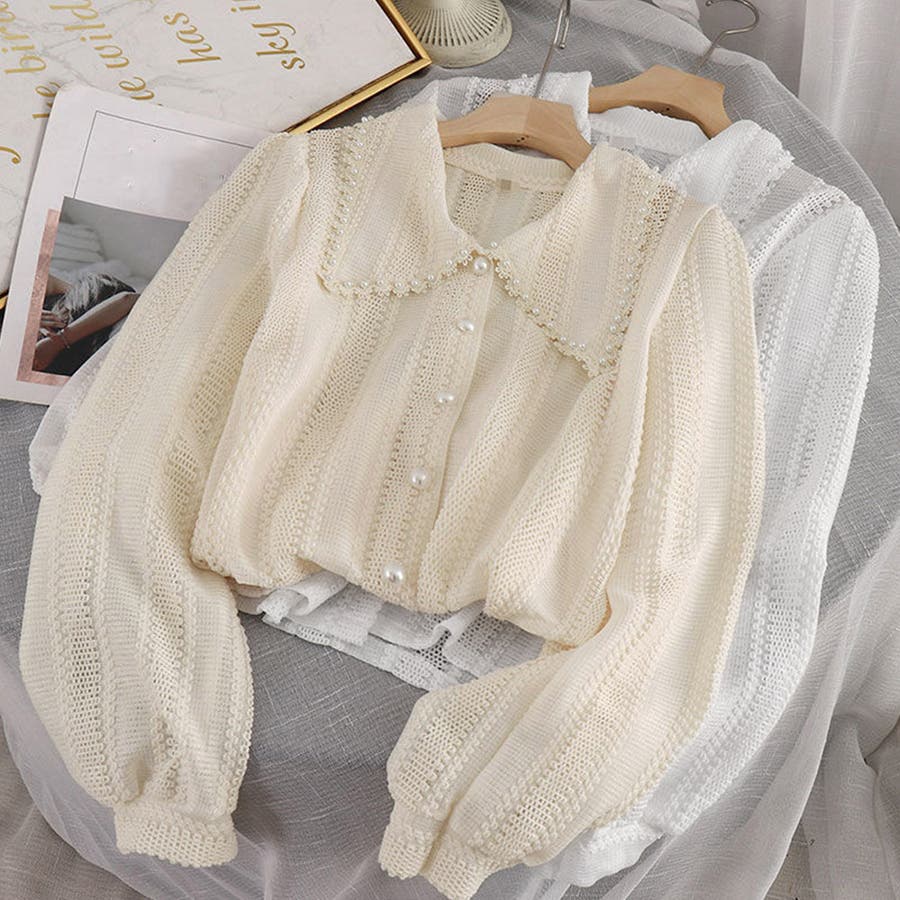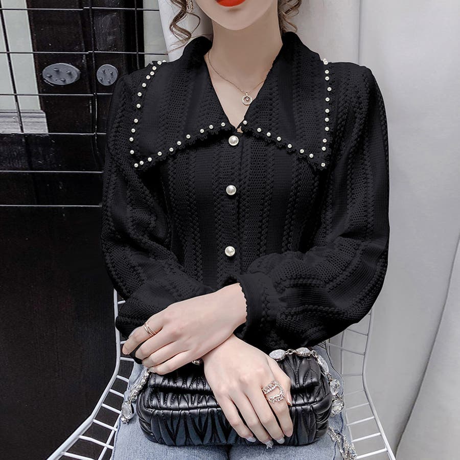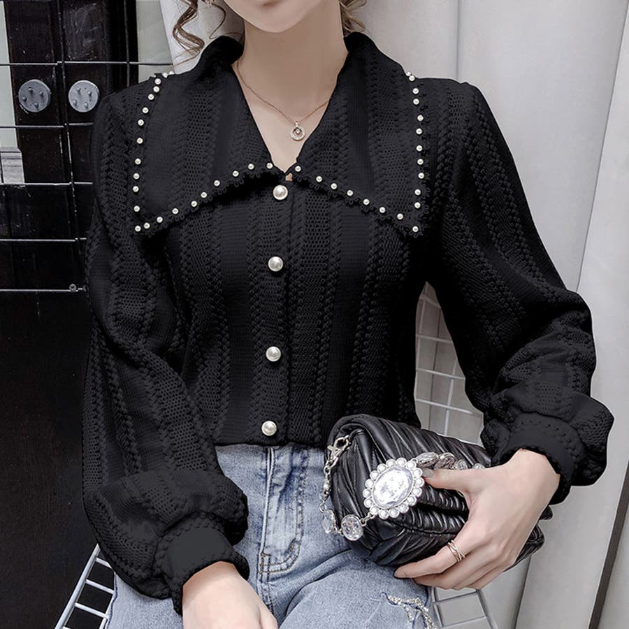 大きな襟とあしらったフェイクパールがポイントになったブラウス