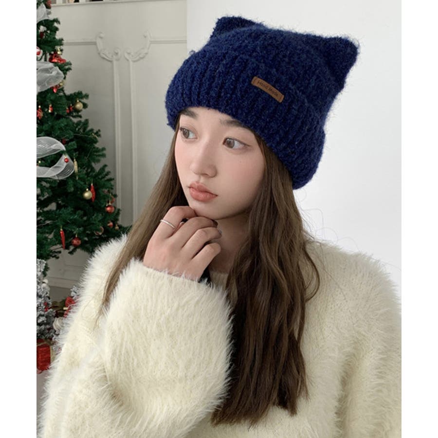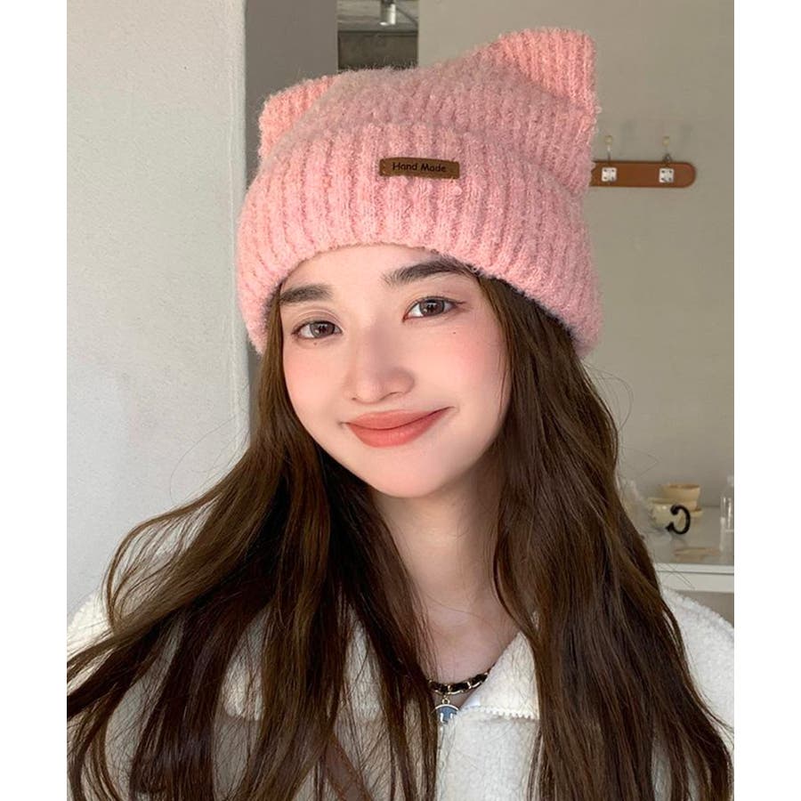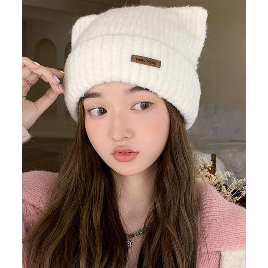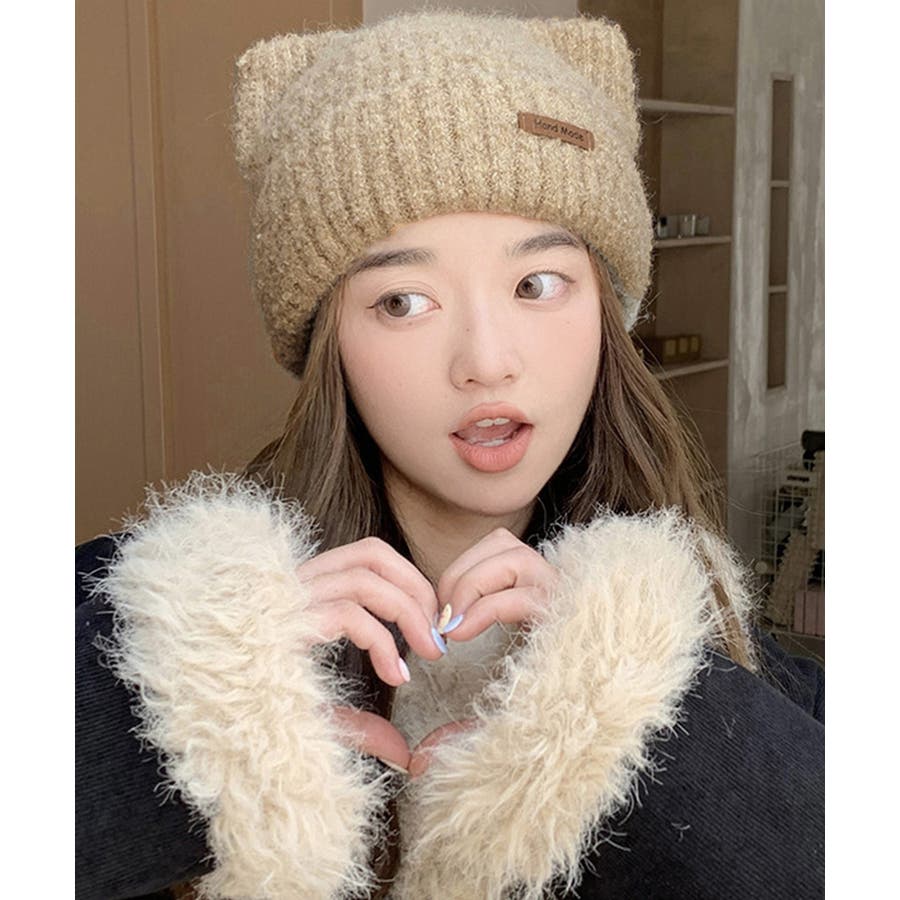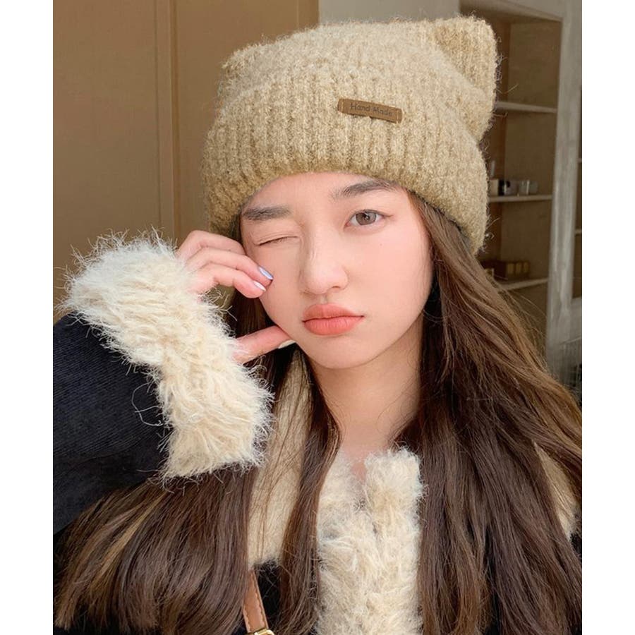 ふわふわとした肌触りの良い素材で仕上げた、可愛らしい印象の猫耳ニット帽子