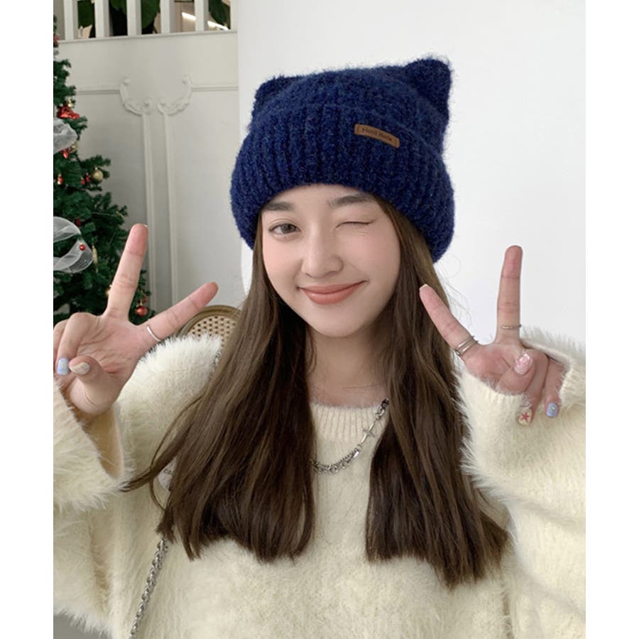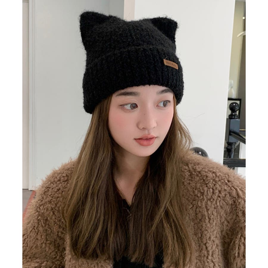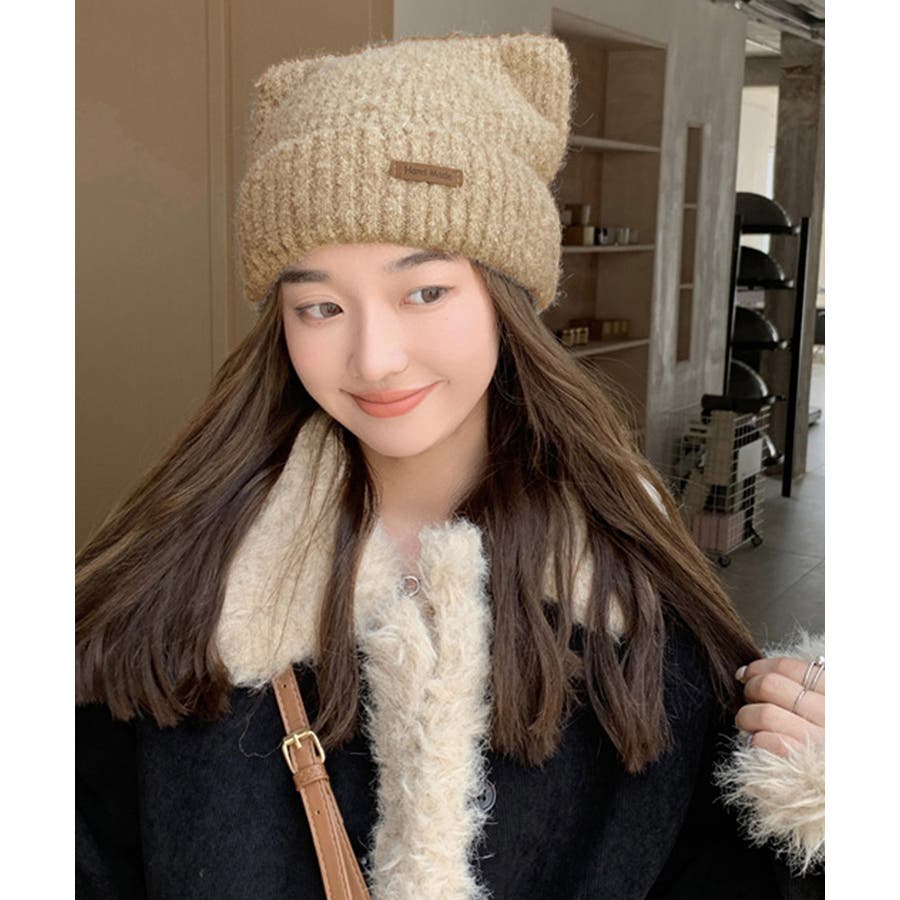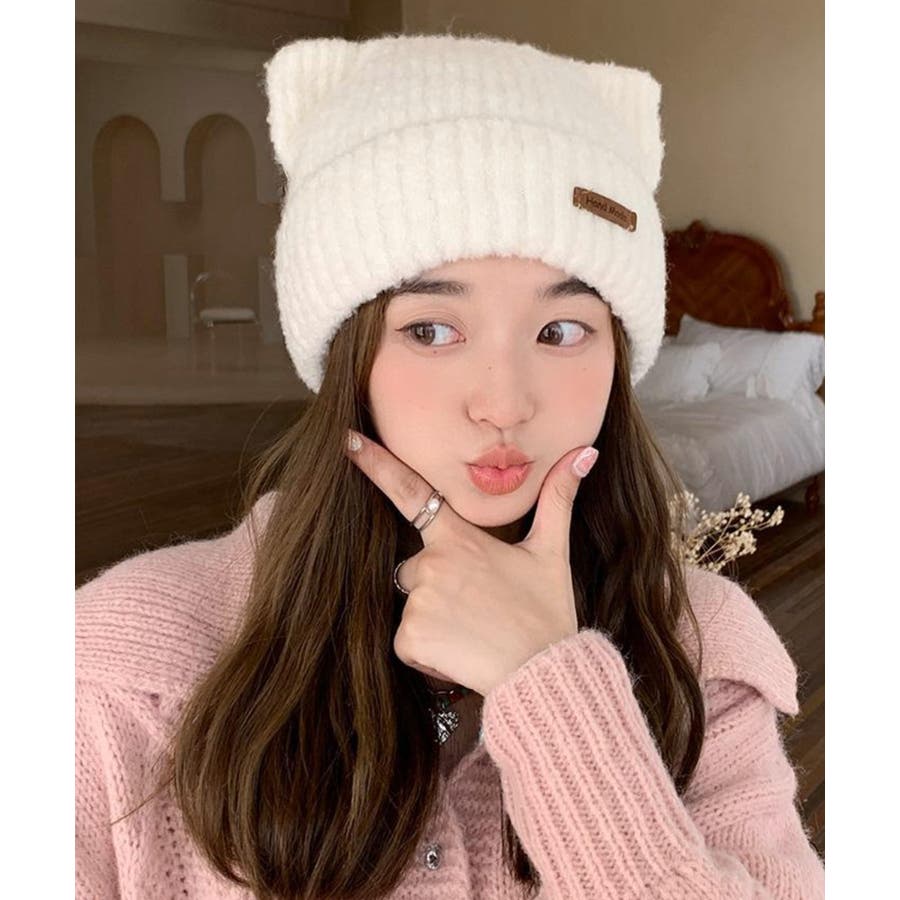 猫耳ビーニー リブニット帽子 レディース