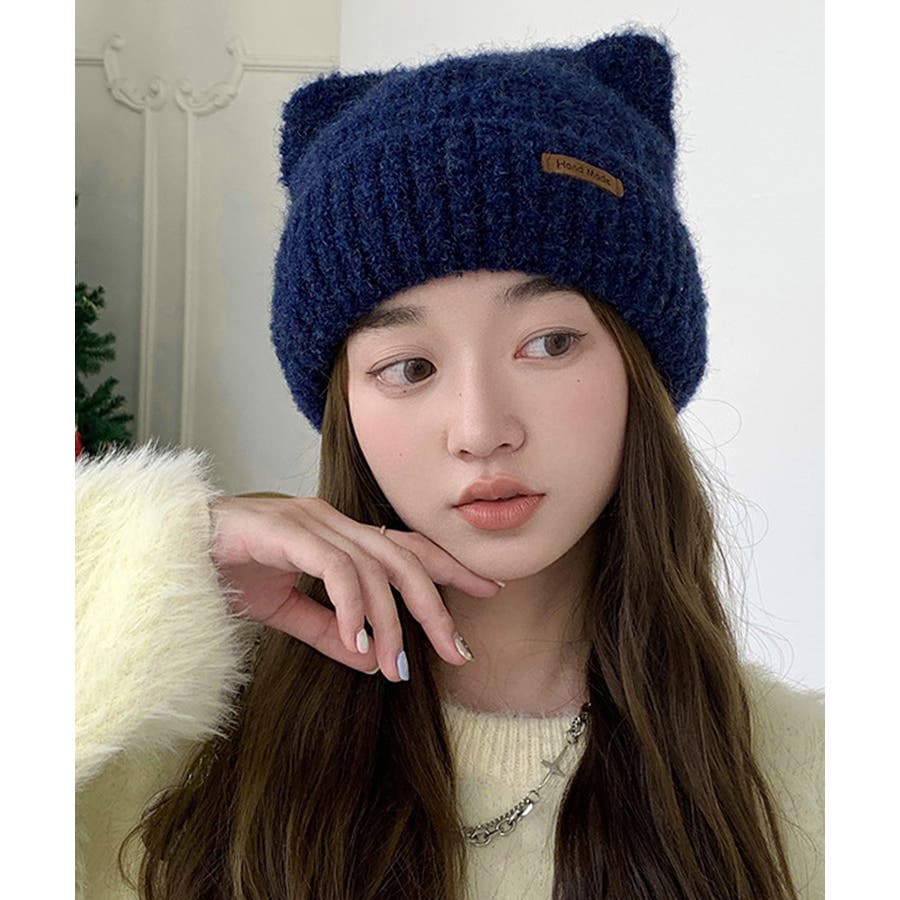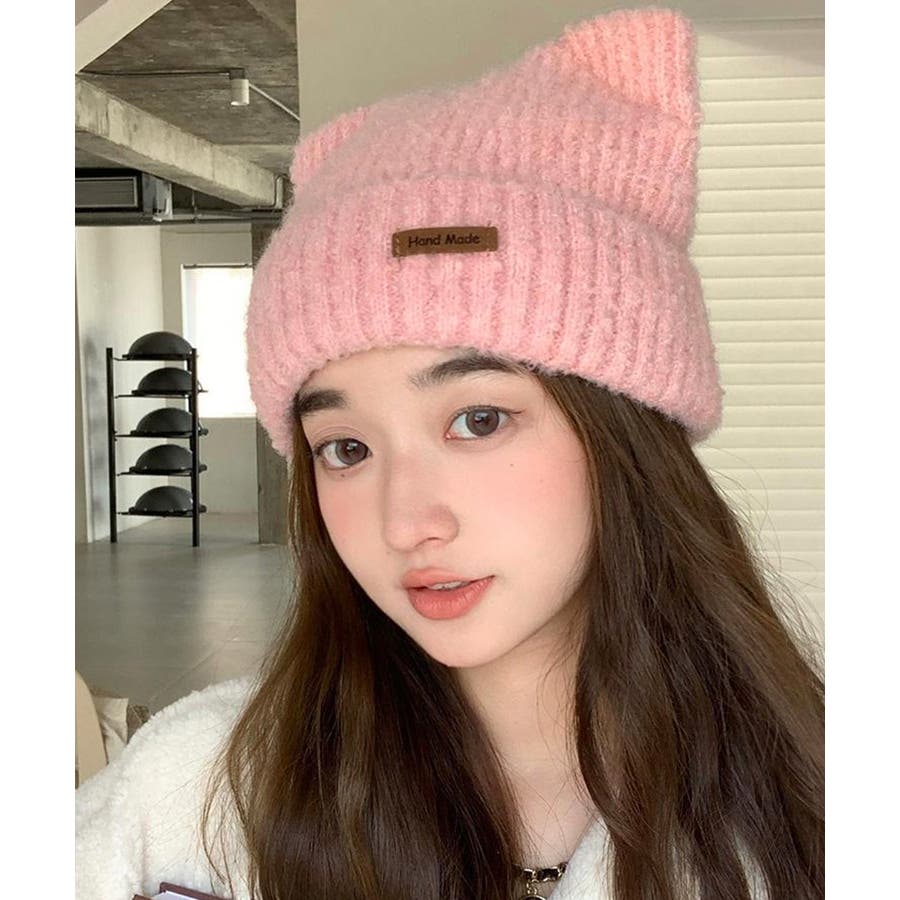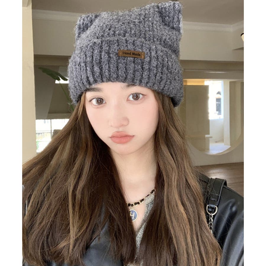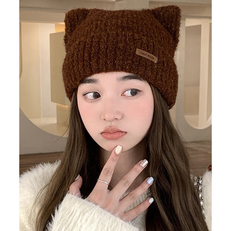 猫耳ビーニー リブニット帽子 レディース