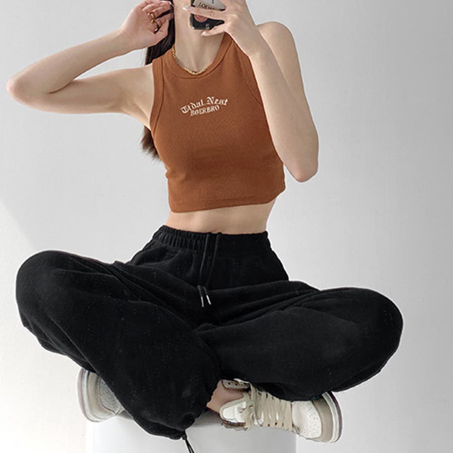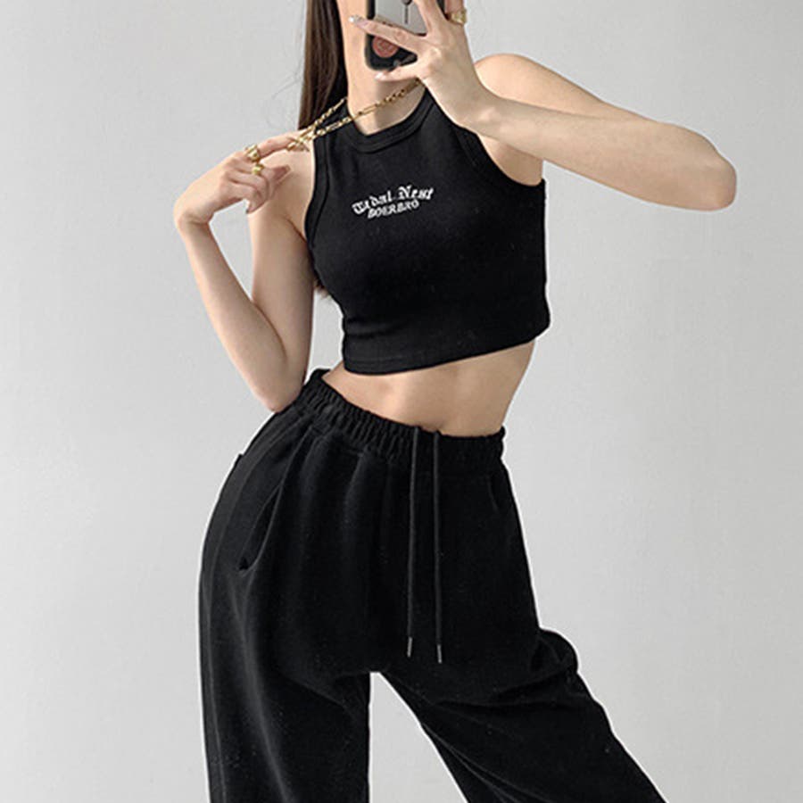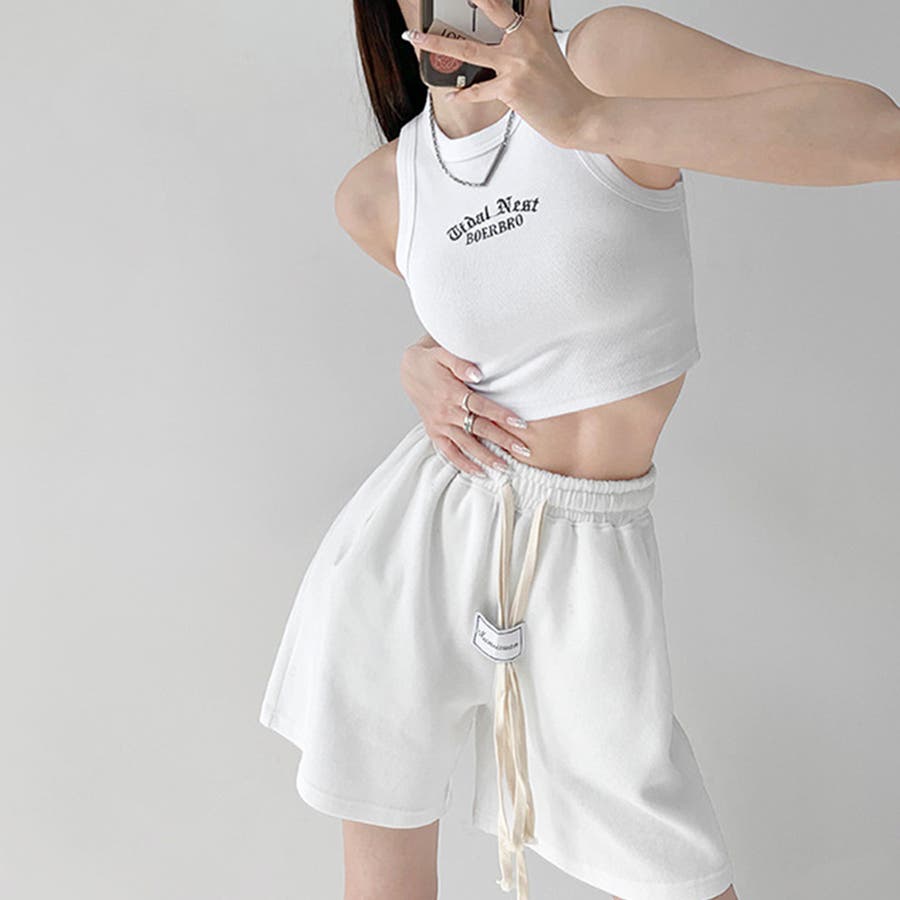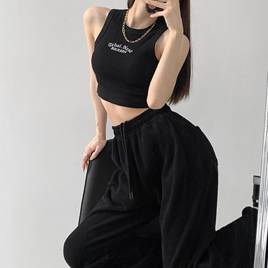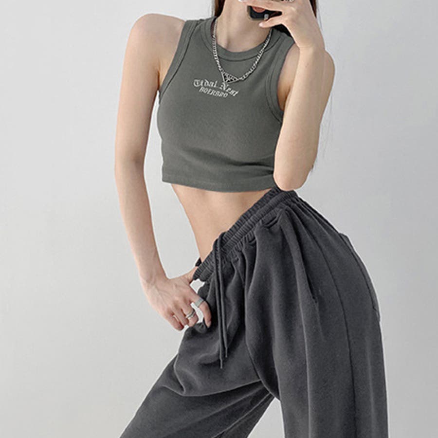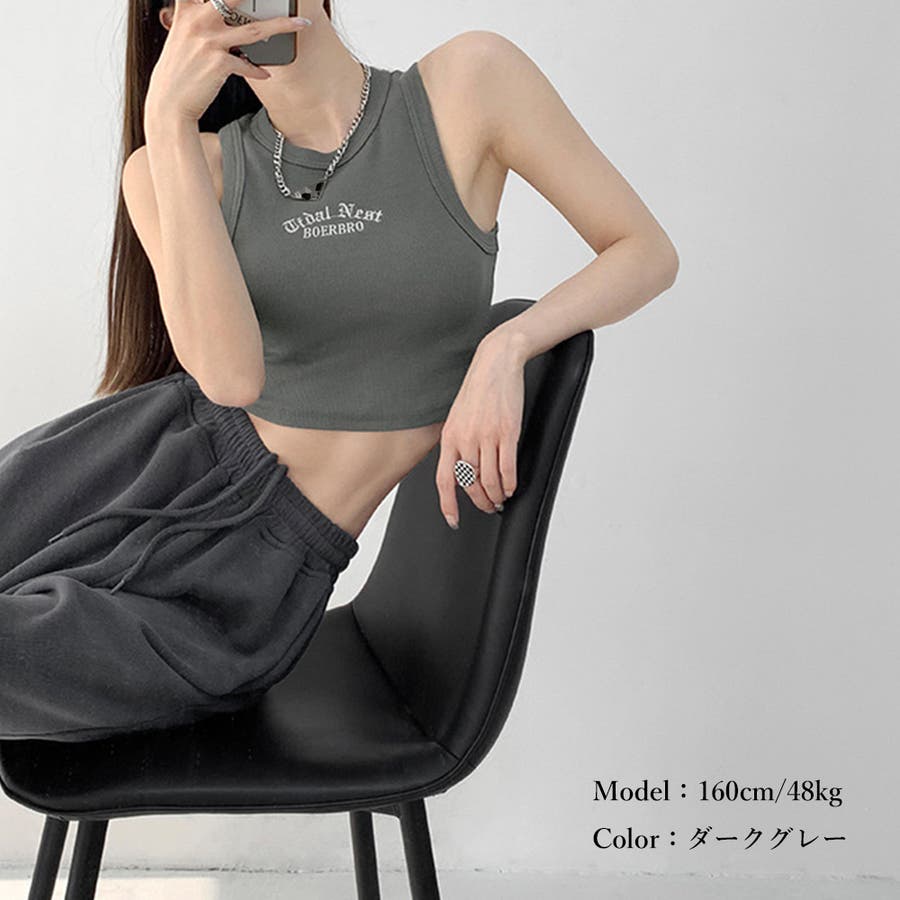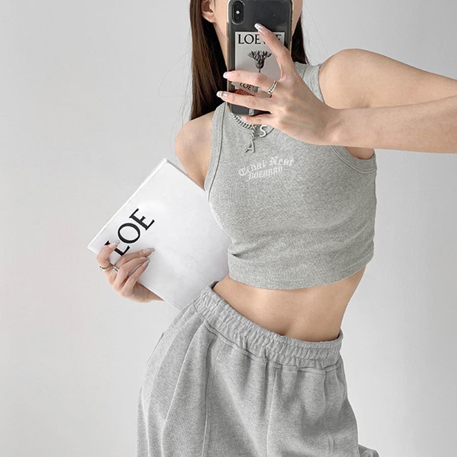 胸元には英字ロゴがコーデのアクセントに、肌見せコーデには欠かせないタンクトップ