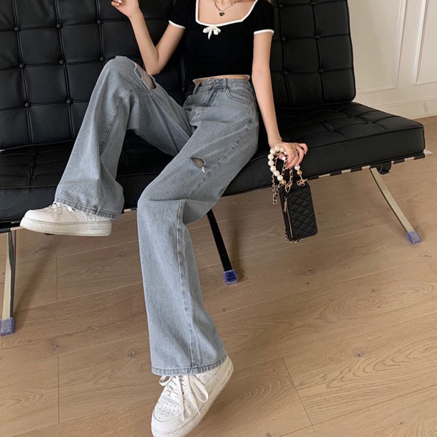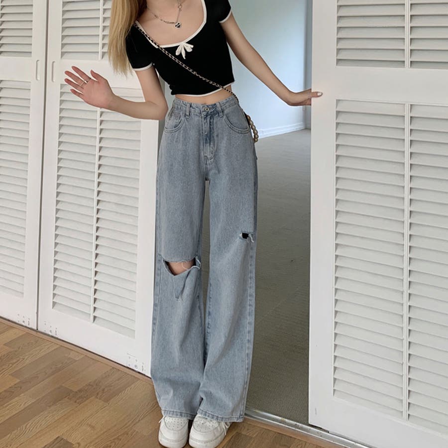 ハイウエスト ストレートパンツ 穴あきジーンズ クラッシュ カジュアル ジーパン 体型カバー 脚長美脚パンツ春夏おしゃれ