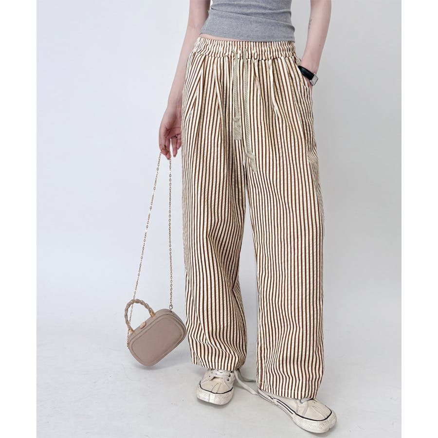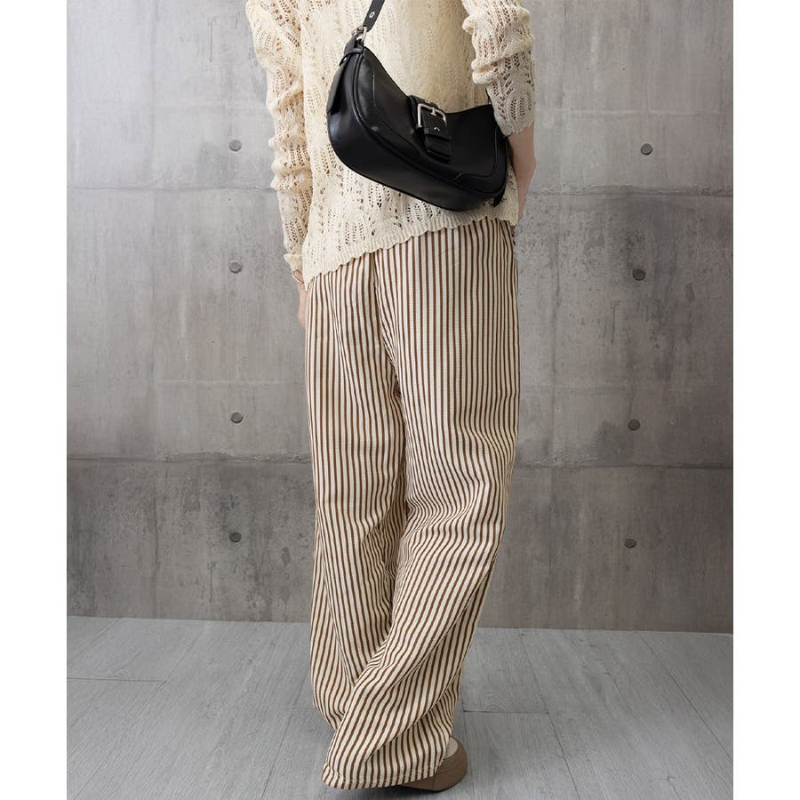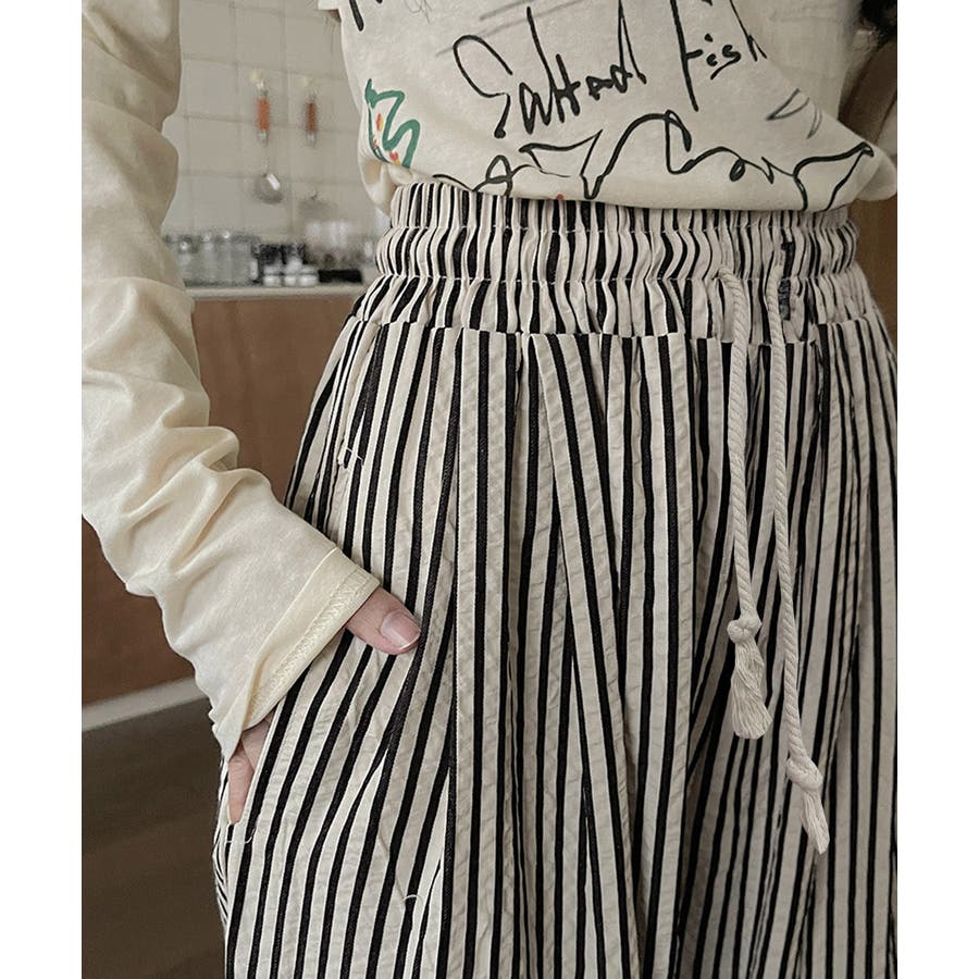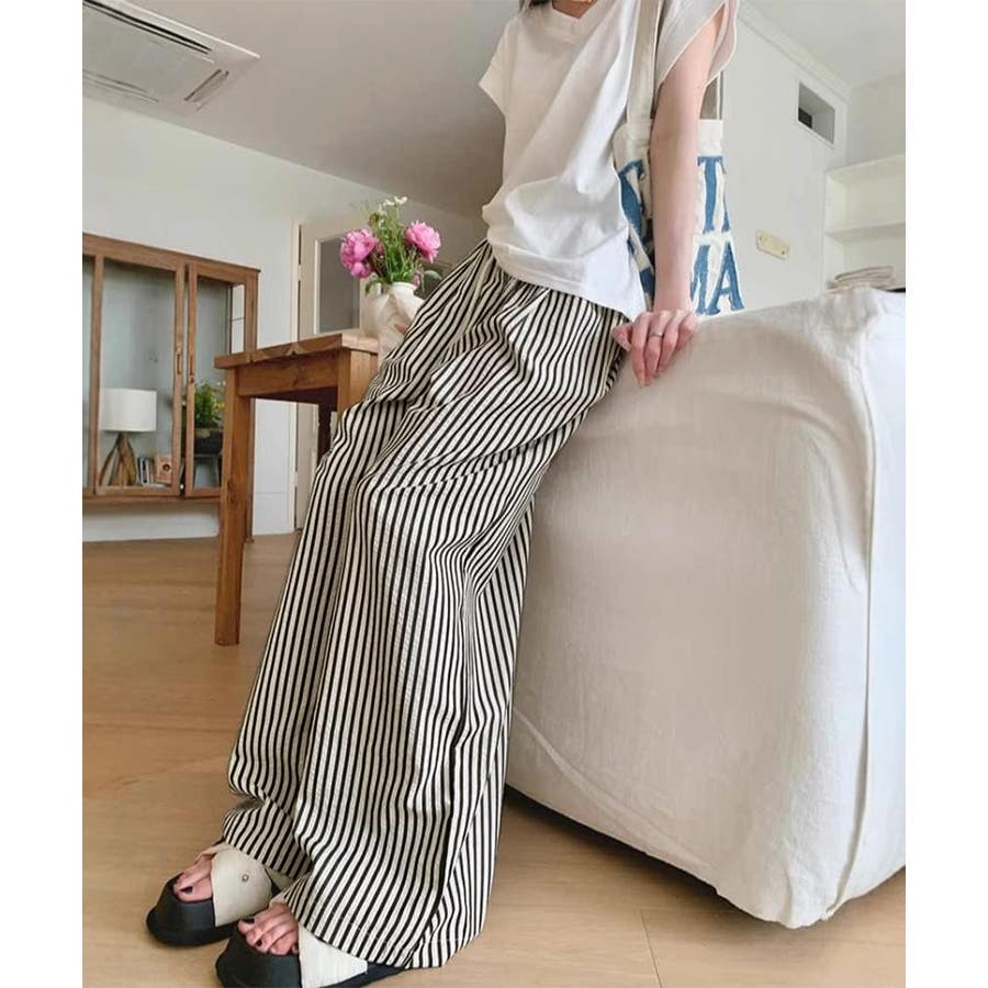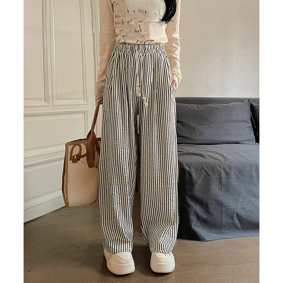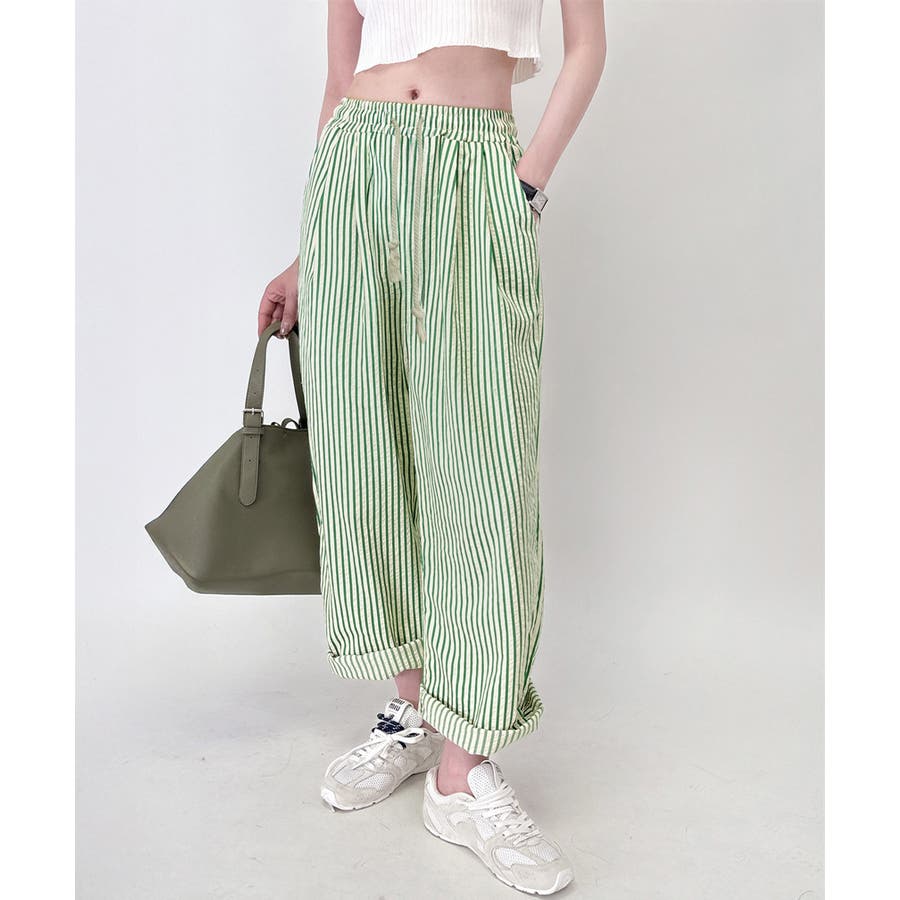 ストライプ柄が爽やかで、抜け感のあるセミワイドパンツ。