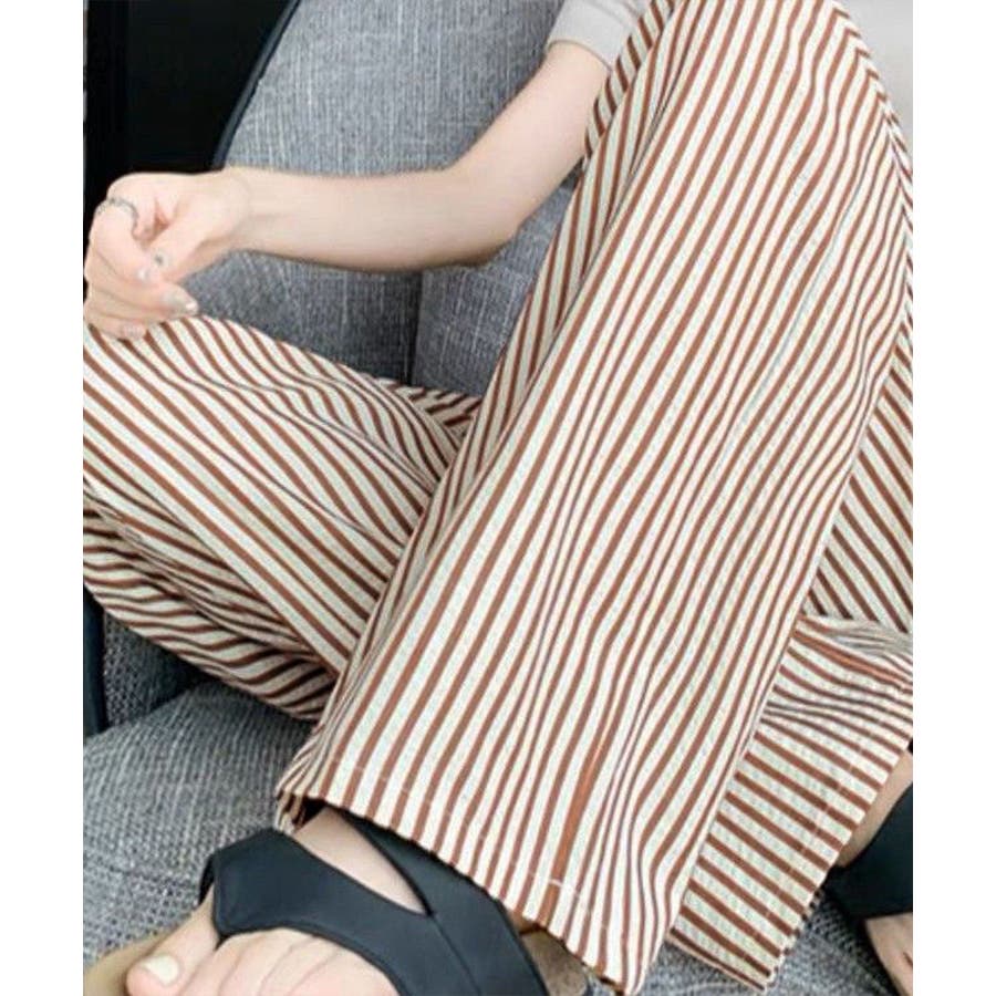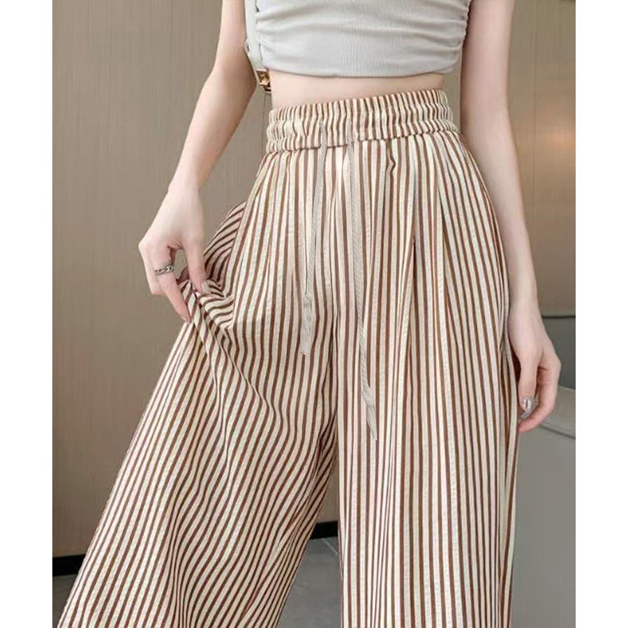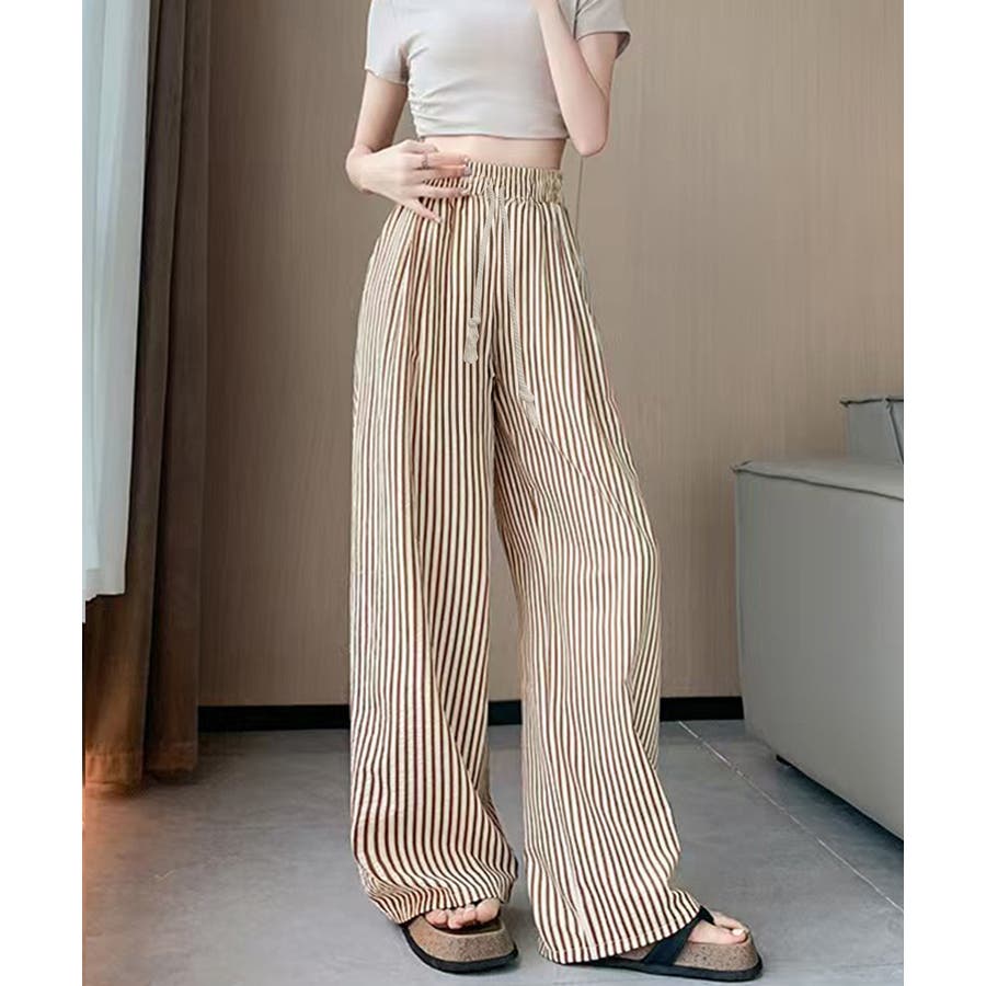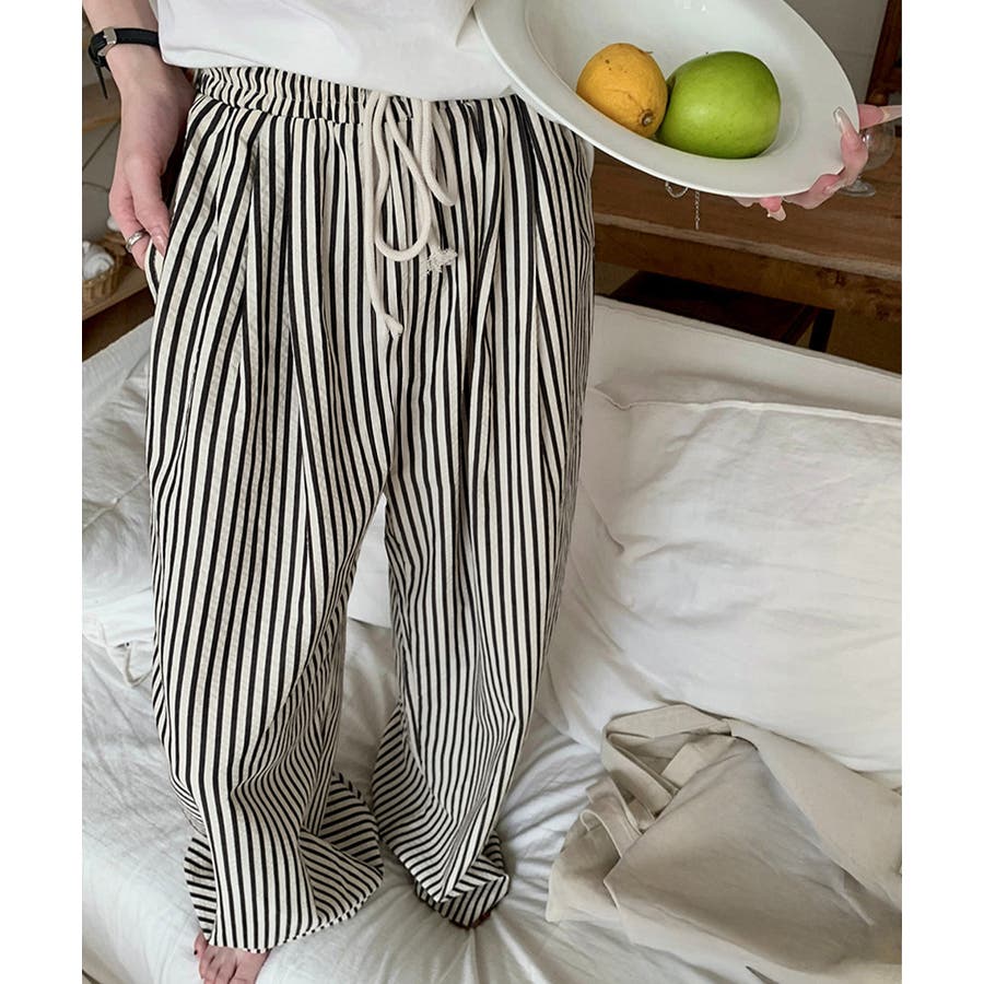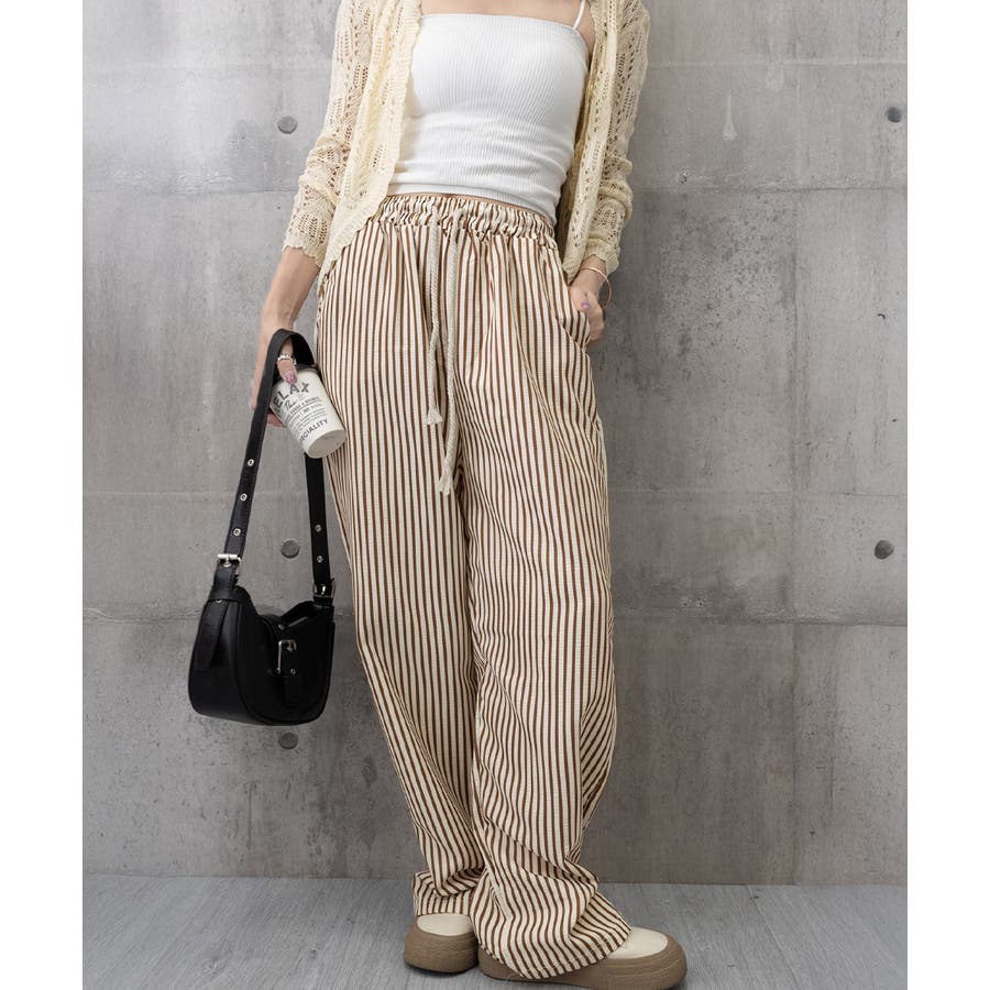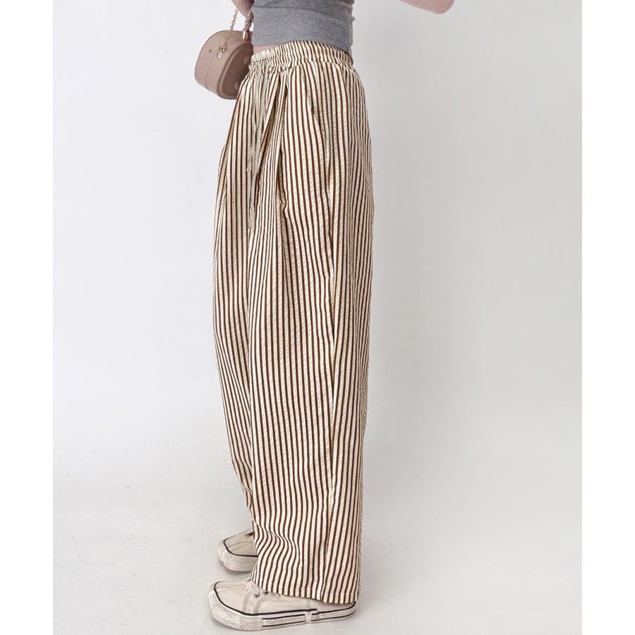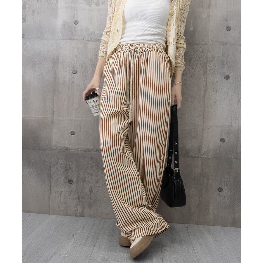 ストライプ柄が爽やかで、抜け感のあるセミワイドパンツ。