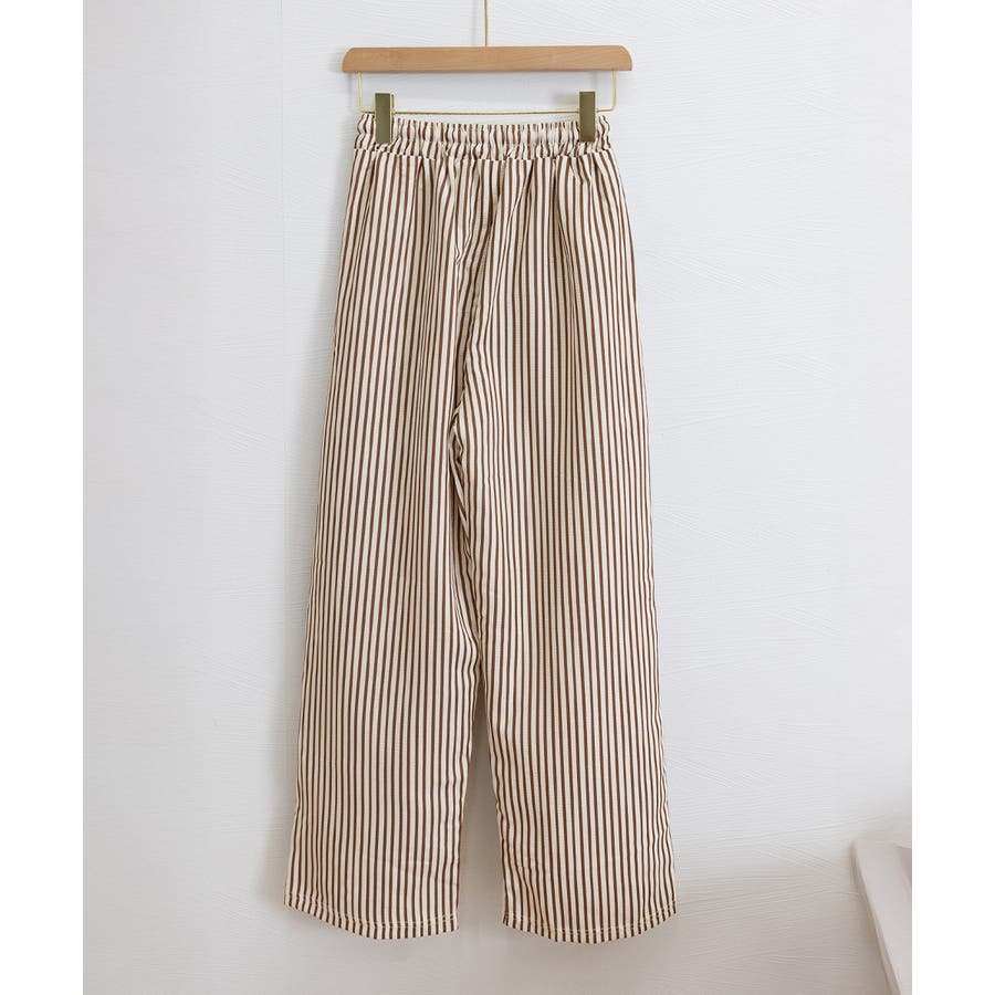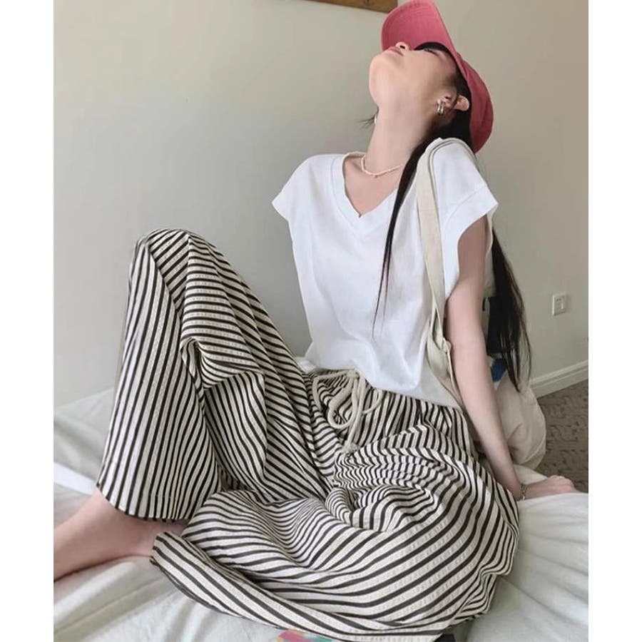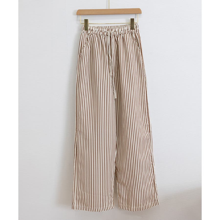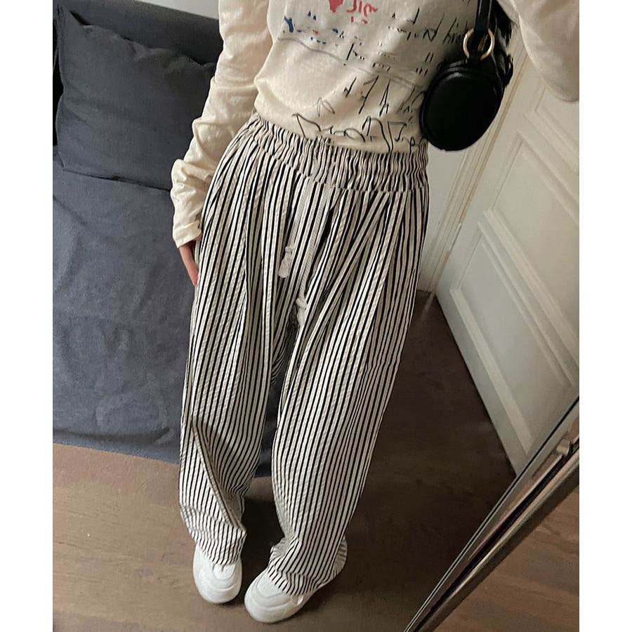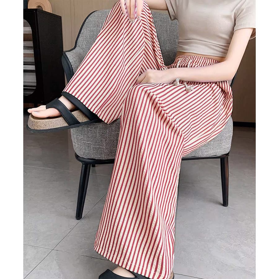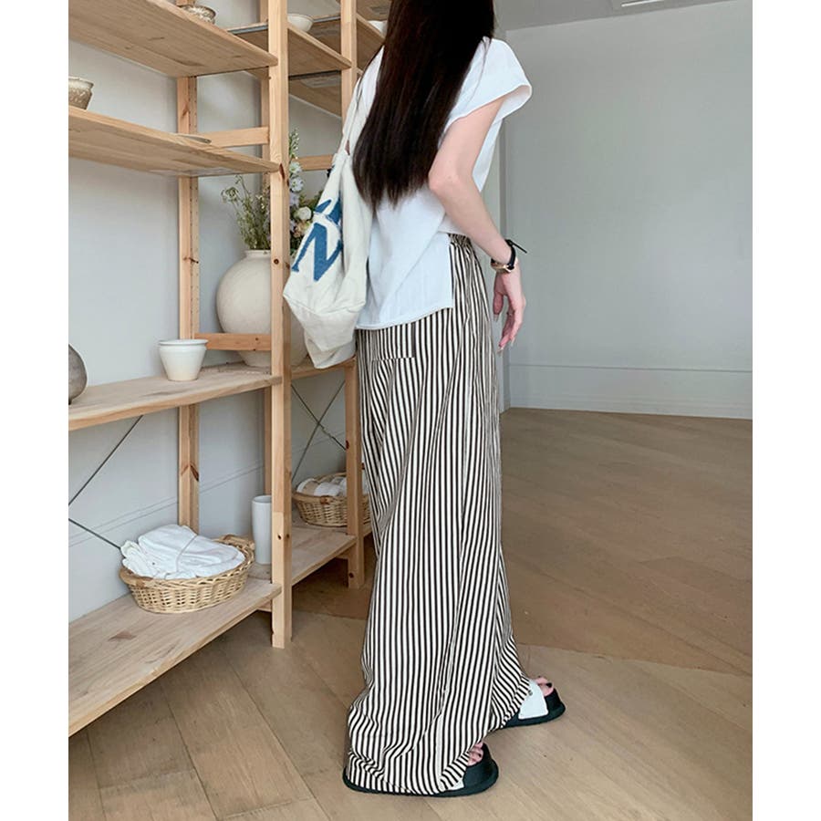 ストライプ柄が爽やかで、抜け感のあるセミワイドパンツ。