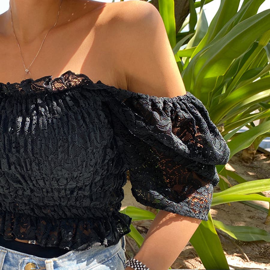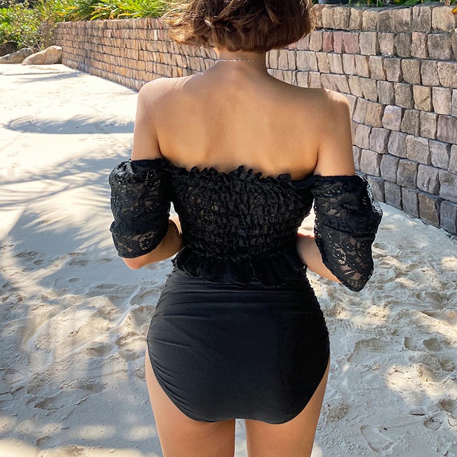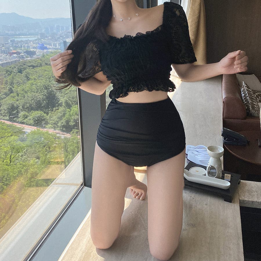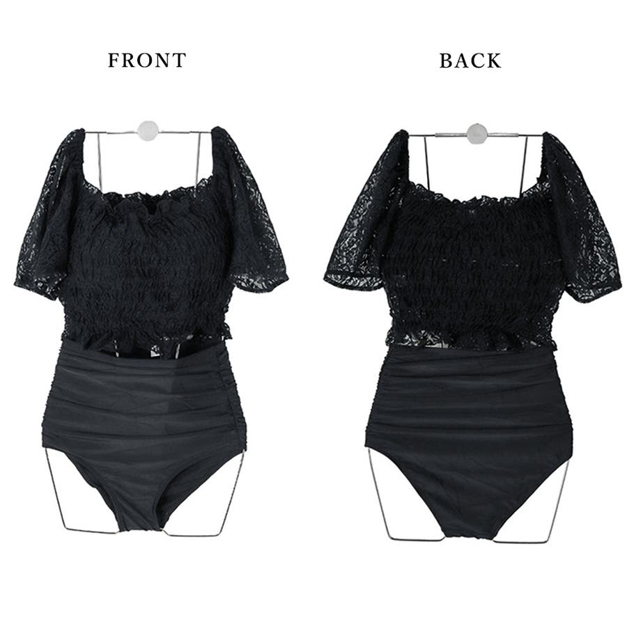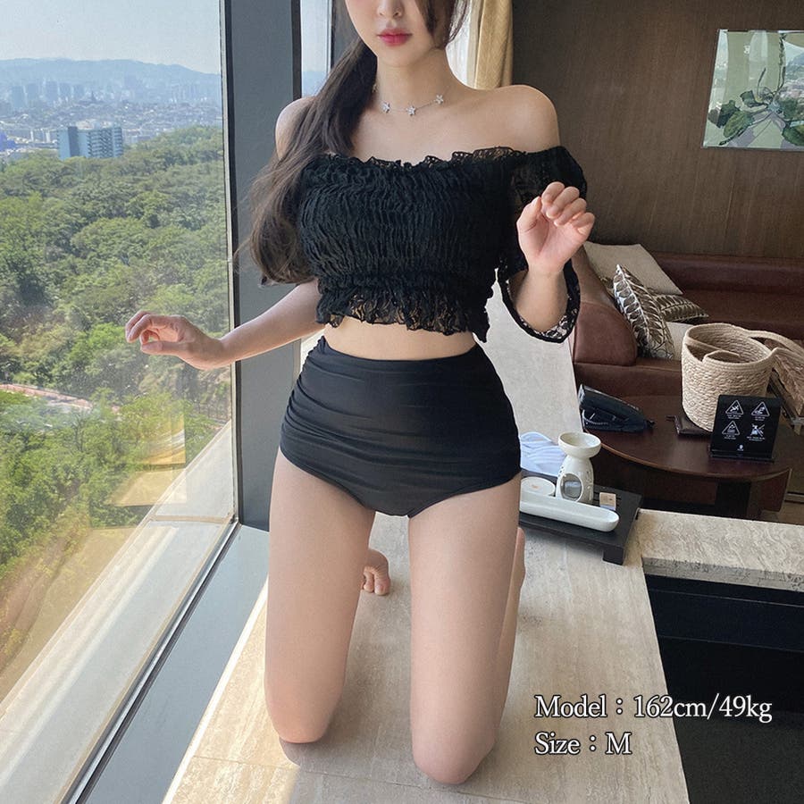 シャーリングオフショルトップス・ハイウエストパンツのビキニ水着2点セット